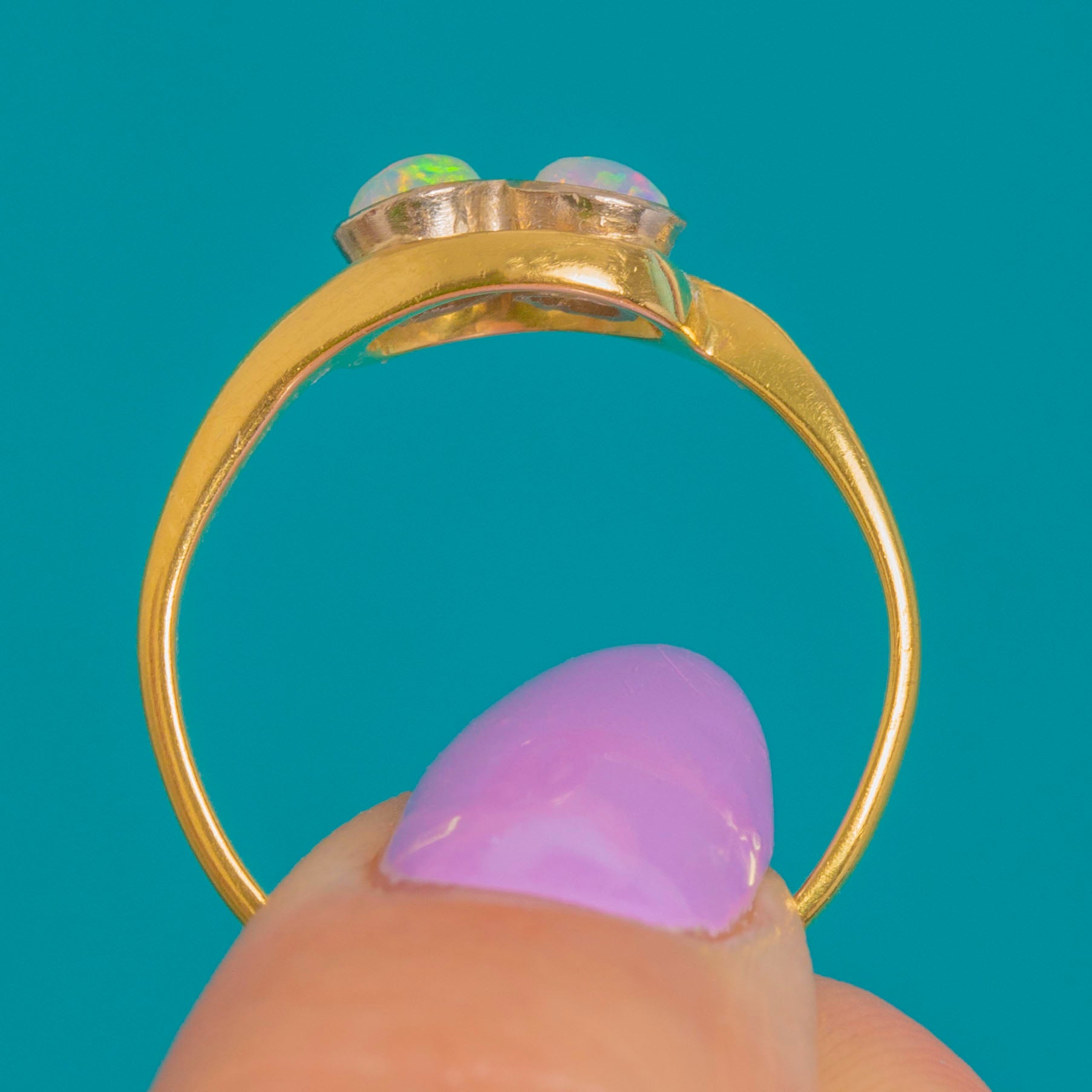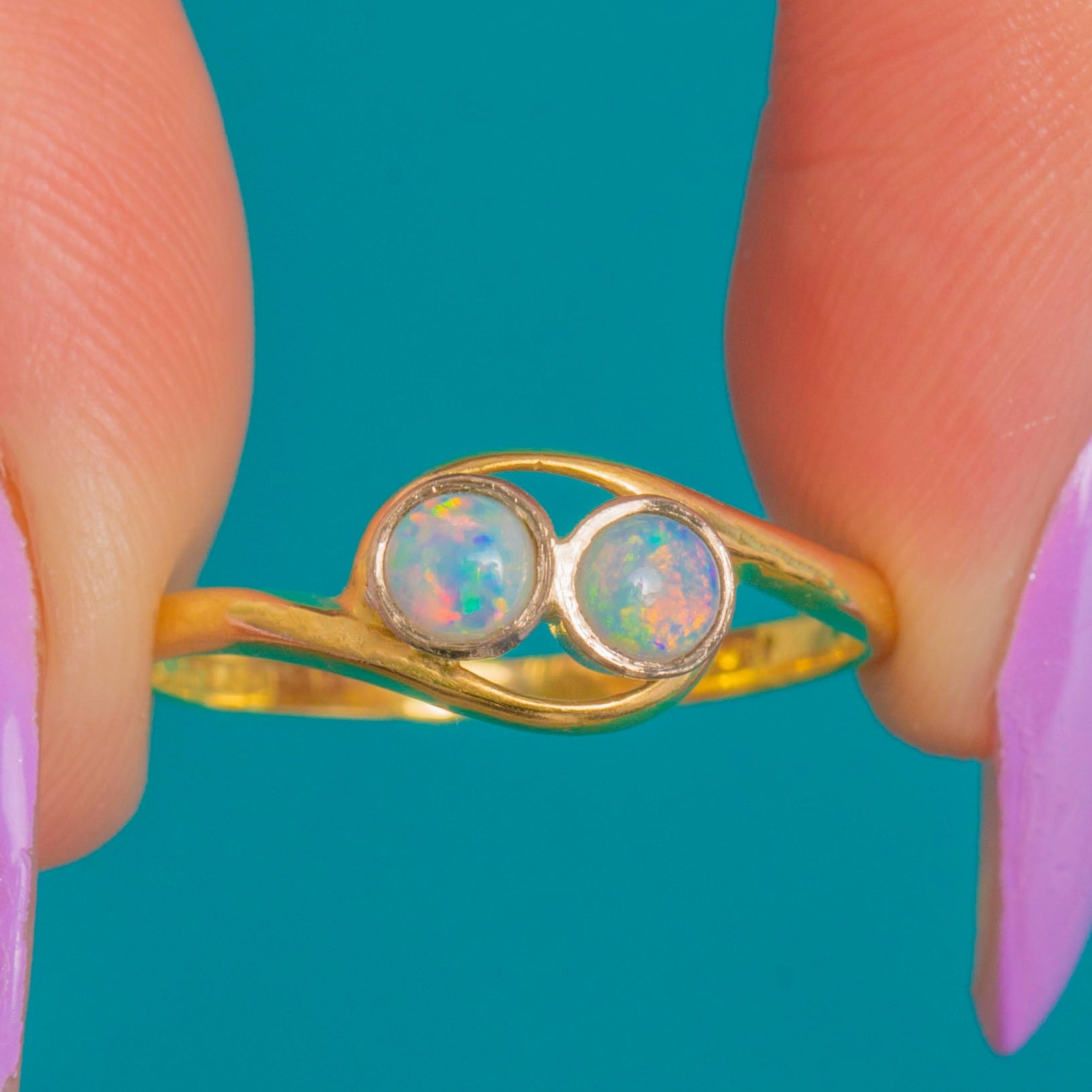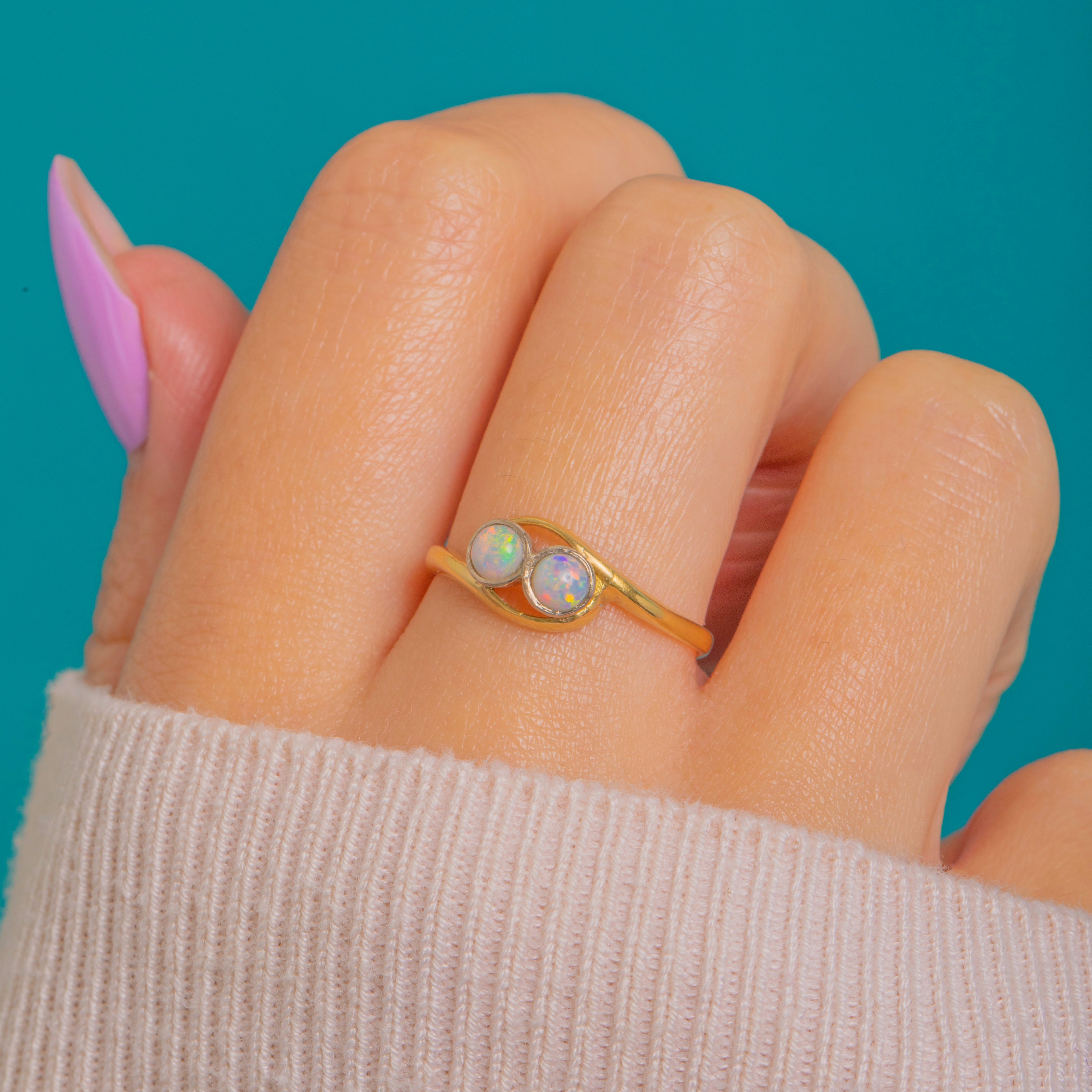 Crafted in rich Yellow Gold, the ring’s softly contoured lines and subtle figure-eight flair lend a timeless femininity. The Opals' ethereal fire is the star here—luminous and enchanting from every angle.
