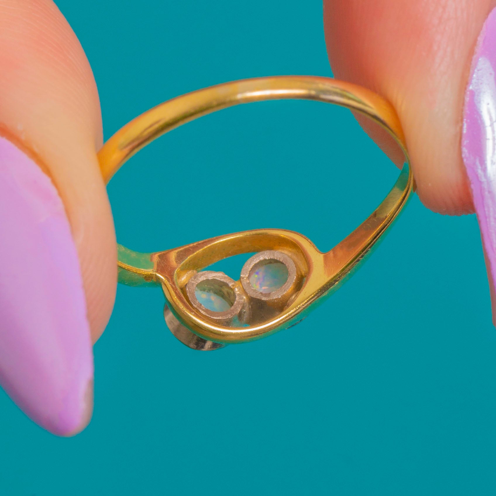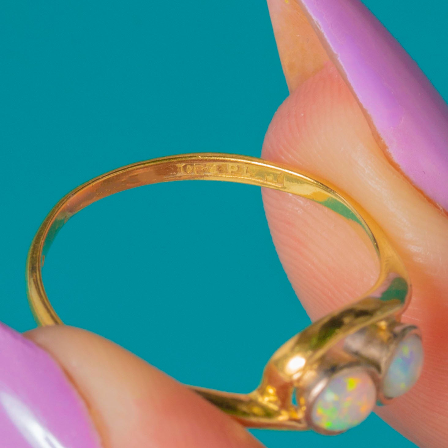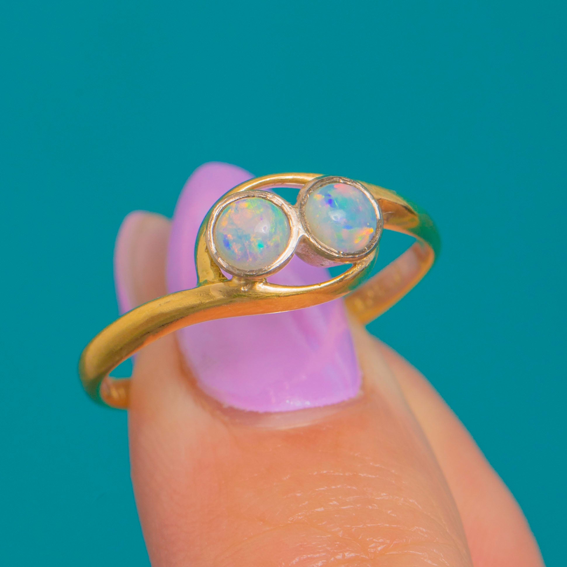 Crafted in rich Yellow Gold, the ring’s softly contoured lines and subtle figure-eight flair lend a timeless femininity. The Opals' ethereal fire is the star here—luminous and enchanting from every angle.