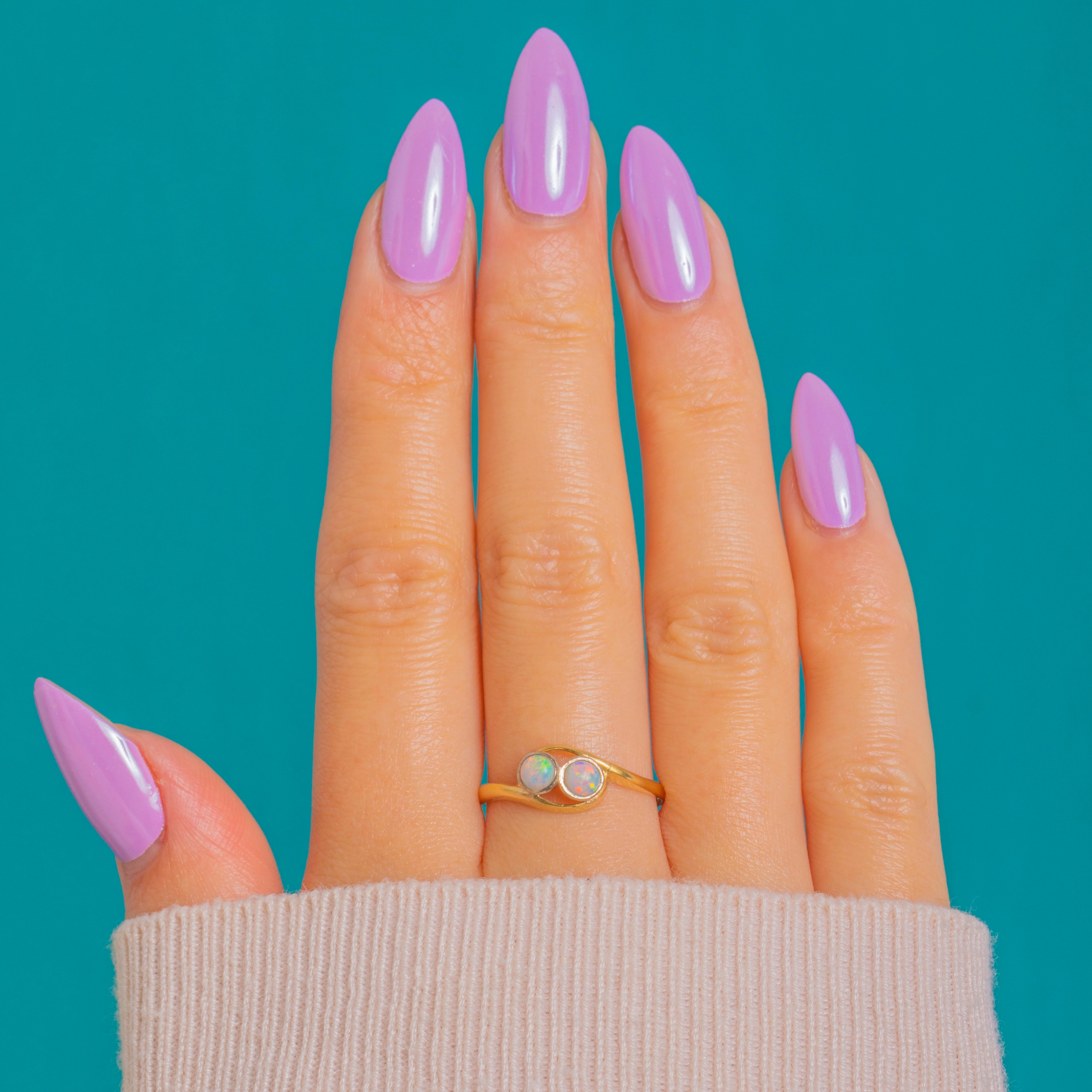 A graceful Opal twist ring with an effortlessly elegant, low-profile silhouette. The opalescent cabochons glow with dreamy play-of-colour—soft blues, minty greens and blush pinks—captured in smooth, protective bezels that flow into a slender, sinuous shank. Understated yet romantic, it’s a versatile piece that slips seamlessly into any jewellery wardrobe, perfect for everyday wear or stacking.