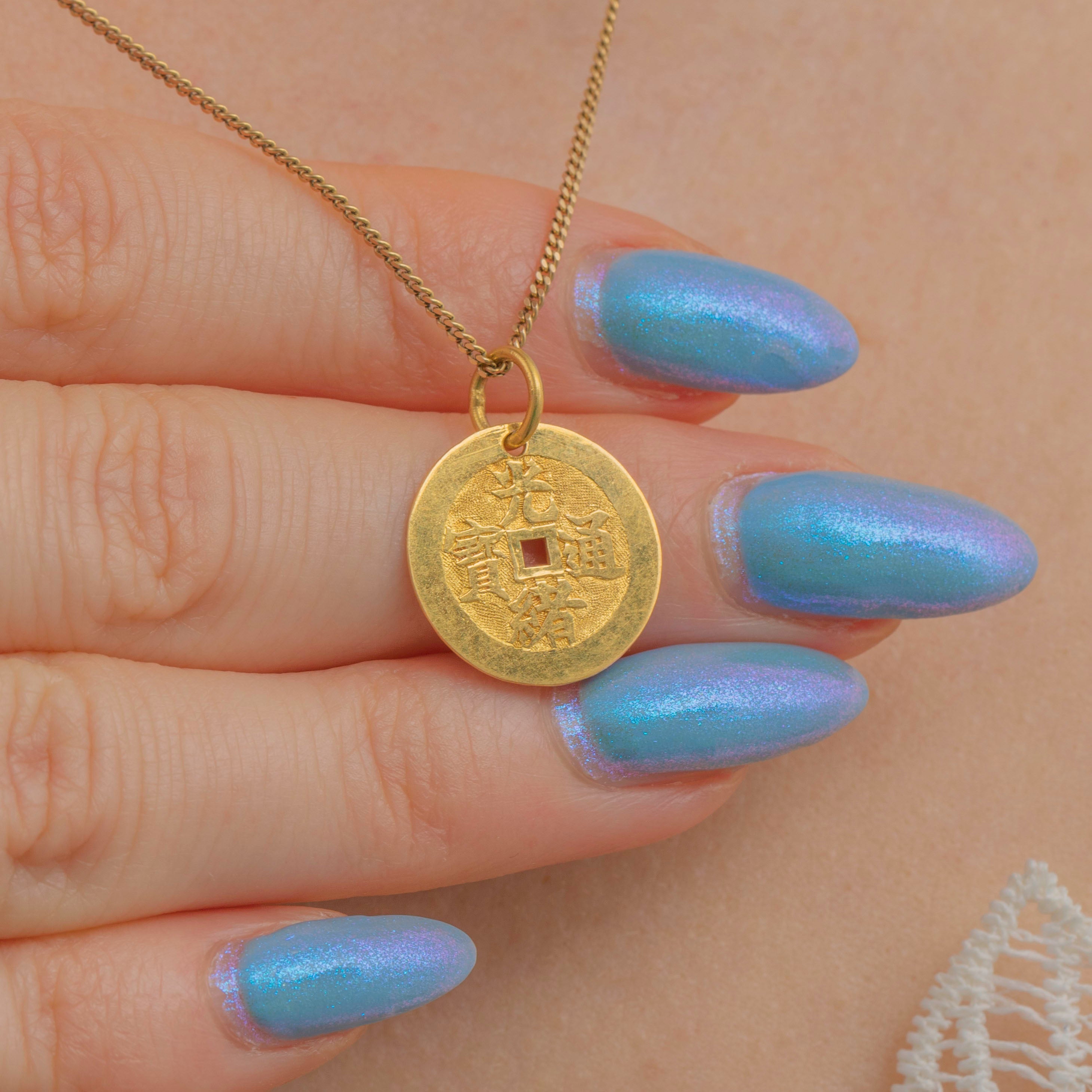 Featuring a Chinese script lettering design, which was often used to represent financial prosperity, good fortune, or blessings, making this piece the perfect lucky talisman. The square hole in the centre would historically have been used to string coins together, to be worn as charms for protection and good luck.