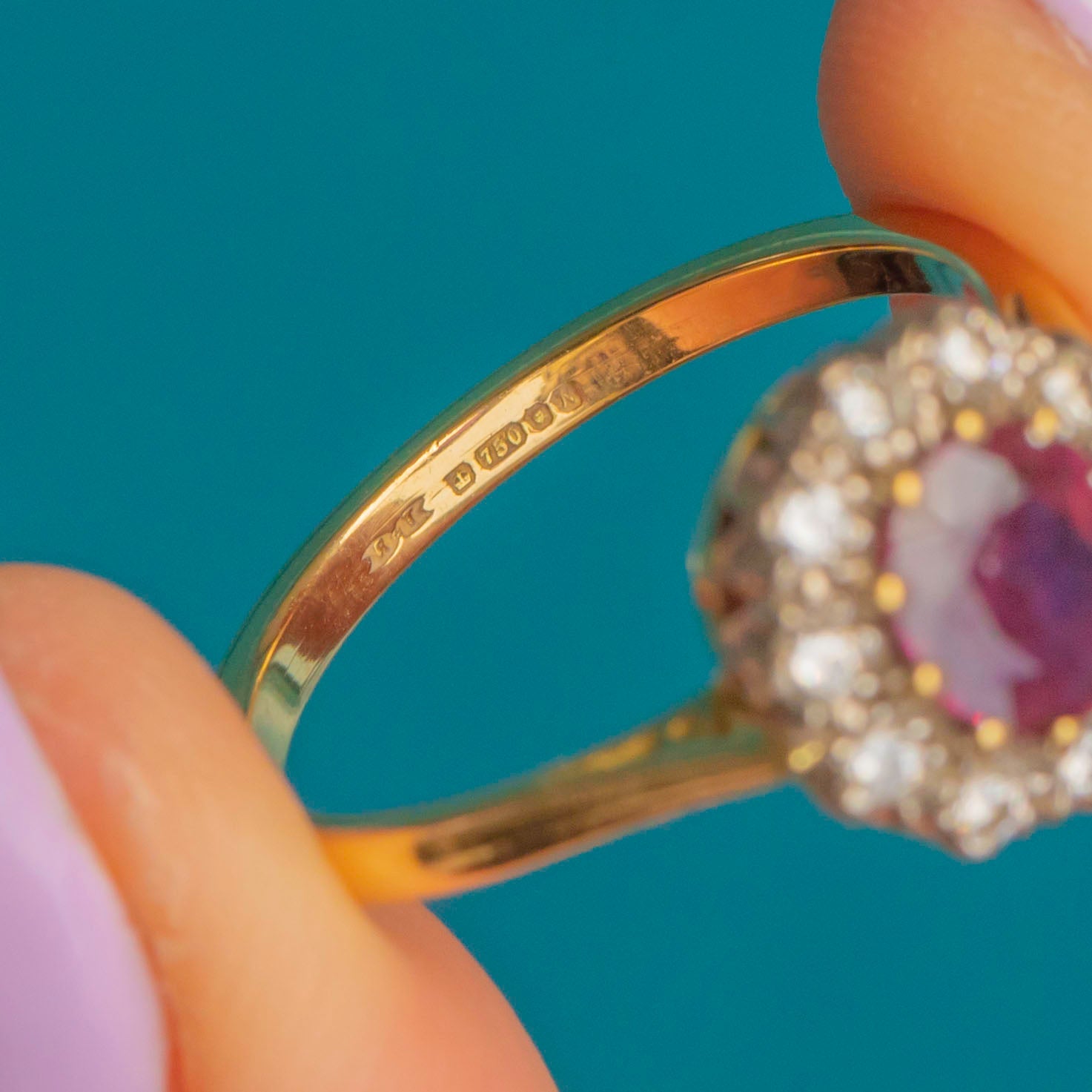 In the centre sits a round 0.70ct Ruby, radiating deep fuchsia and raspberry hues from its crisp facets. The Ruby is haloed by natural Diamonds, each glittering beautifully in the light.