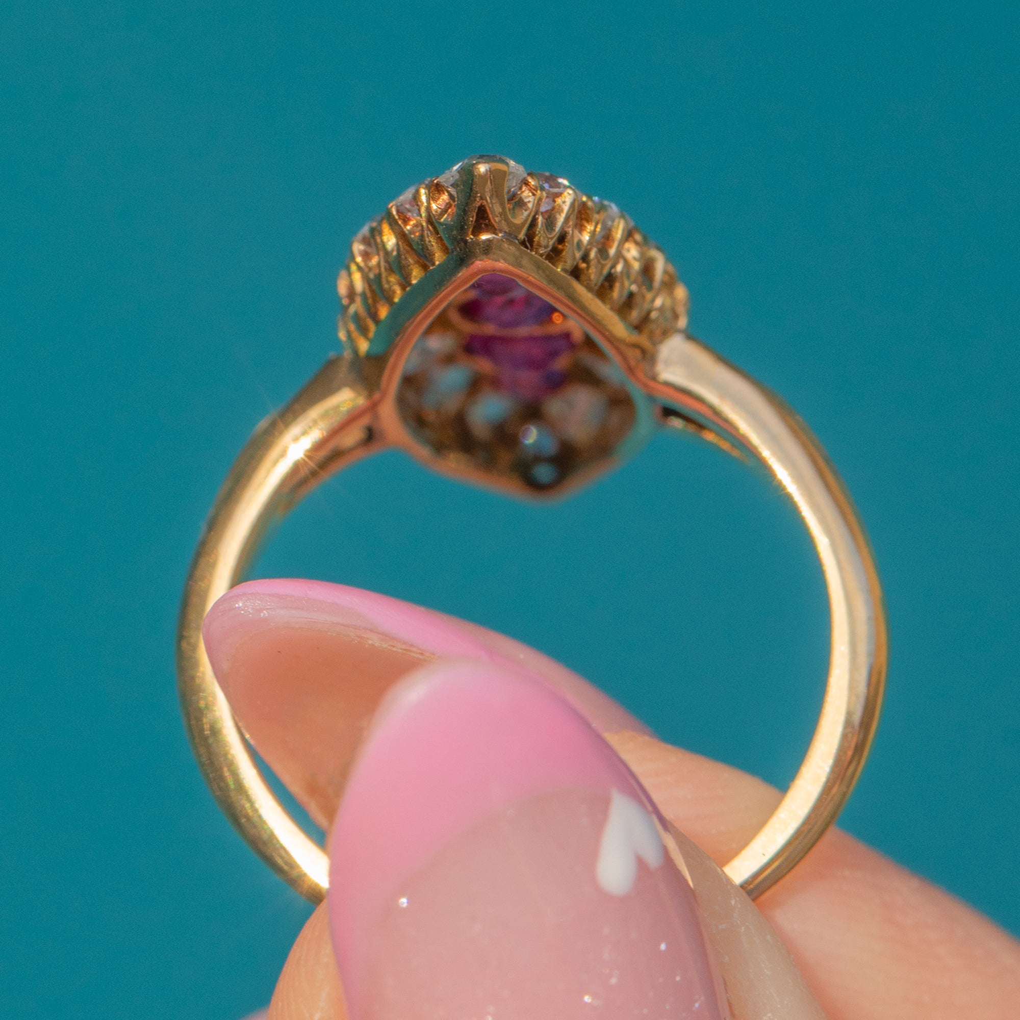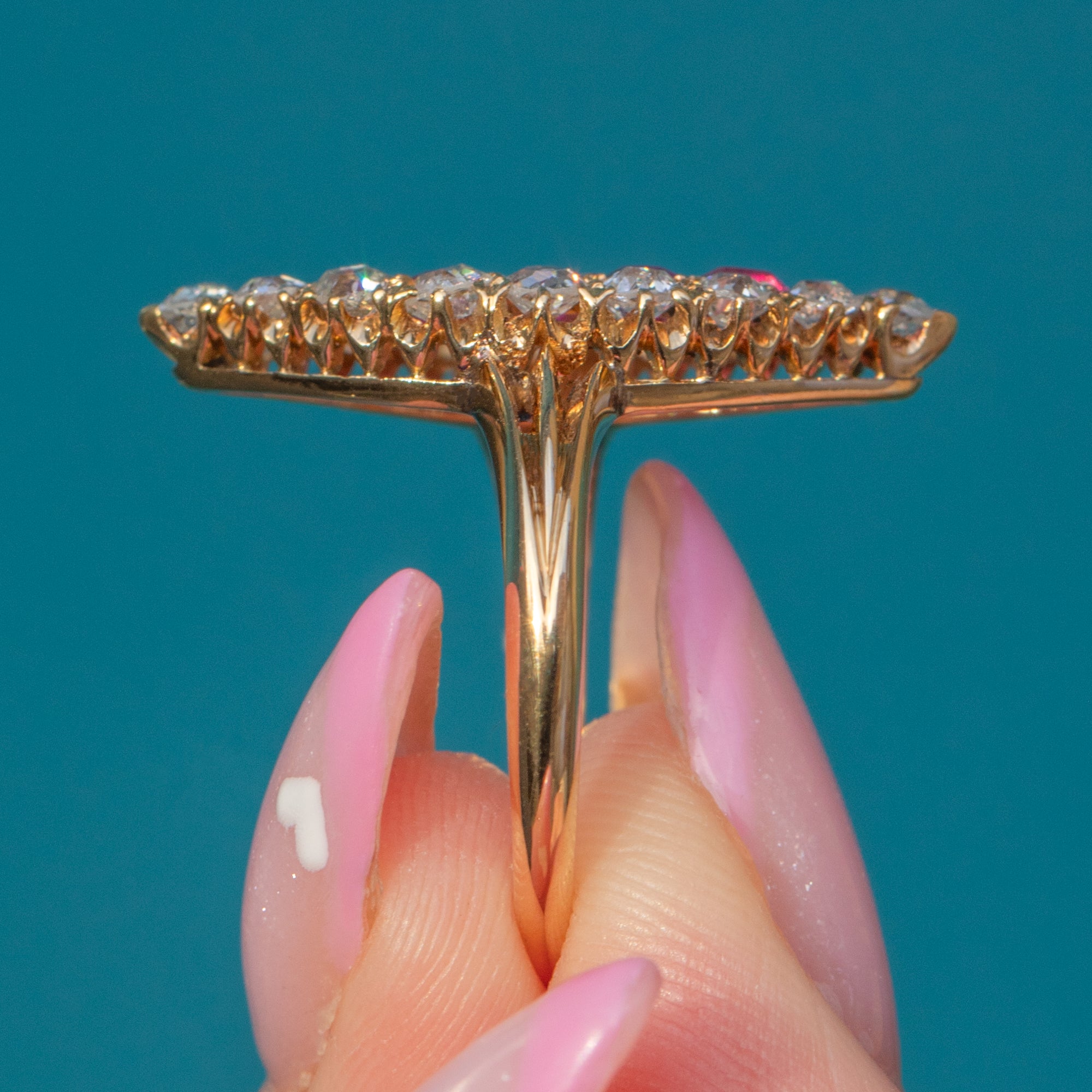This magnificent Victorian navette ring, hallmarked Chester 1893, is crafted in rich 18ct Gold and set with a striking arrangement of Rubies and Old Mine Cut Diamonds. The vivid pink-red Rubies, totalling approximately 0.50cts, contrast beautifully against the 0.75cts of twinkling antique Diamonds, arranged in a classic elongated cluster formation.