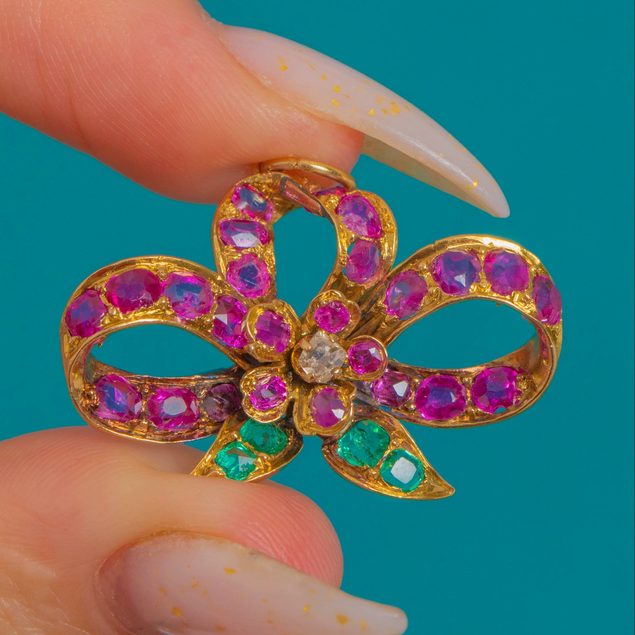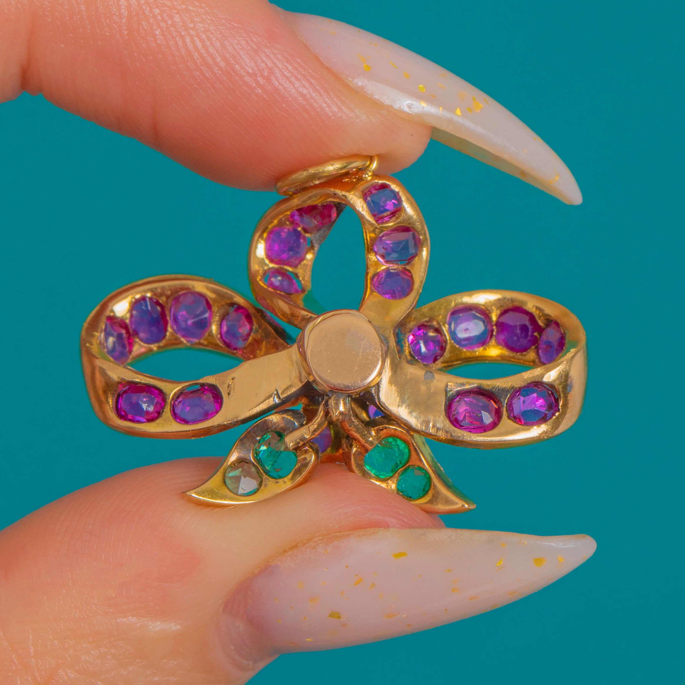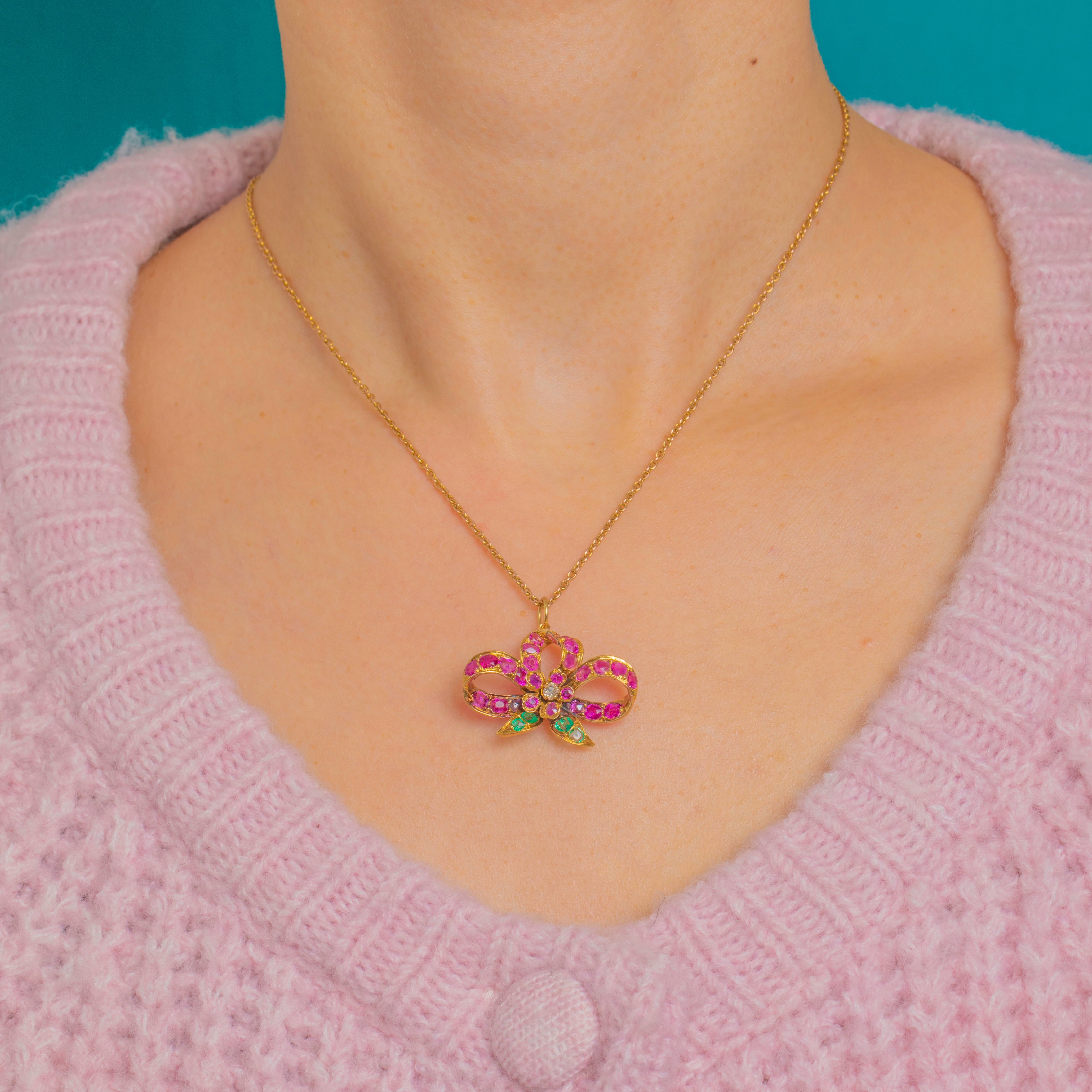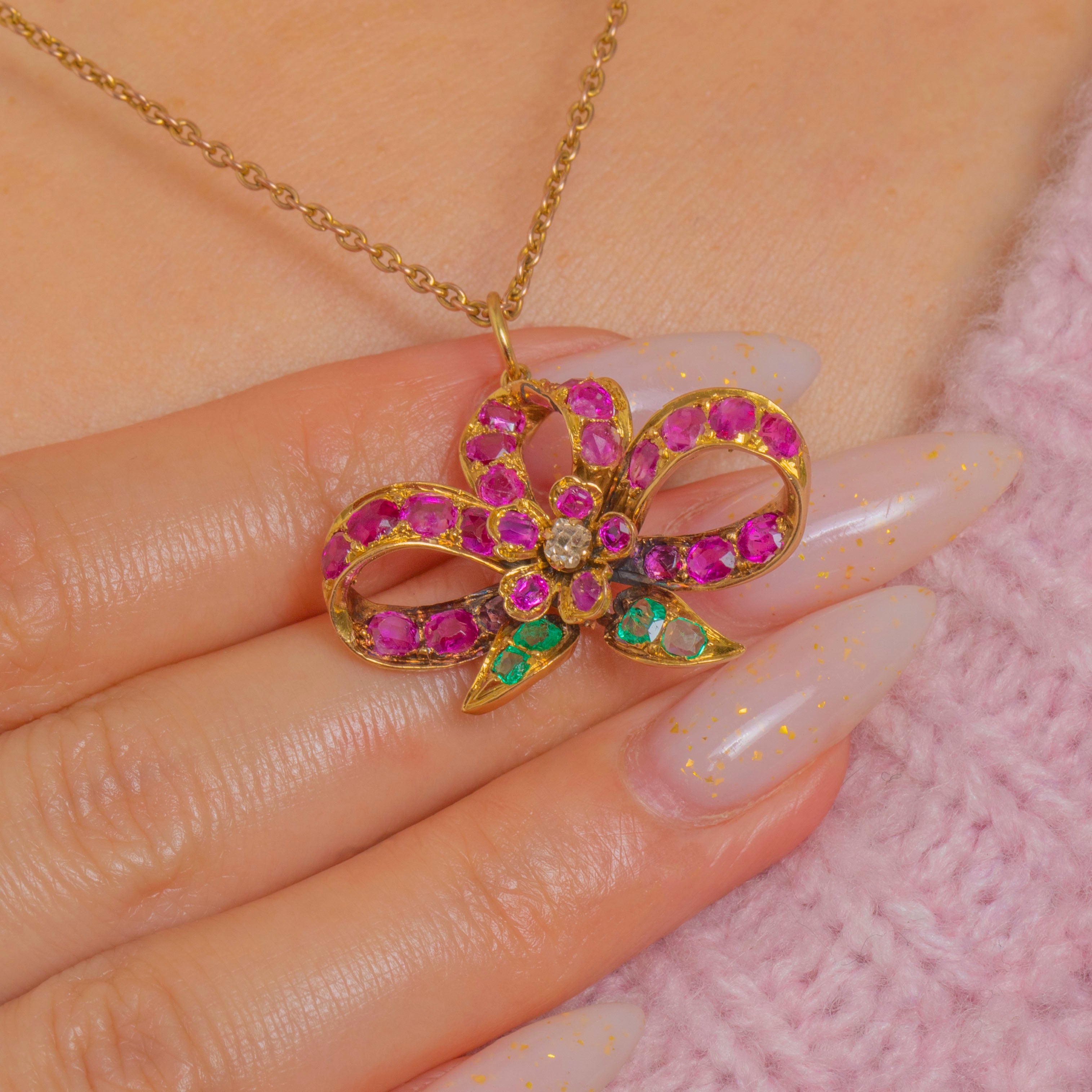 Rich with antique, turn-of-the-Century charm, this 18ct Gold natural Ruby & Emerald bow pendant is alive with jewel-toned colour and romantic detail!