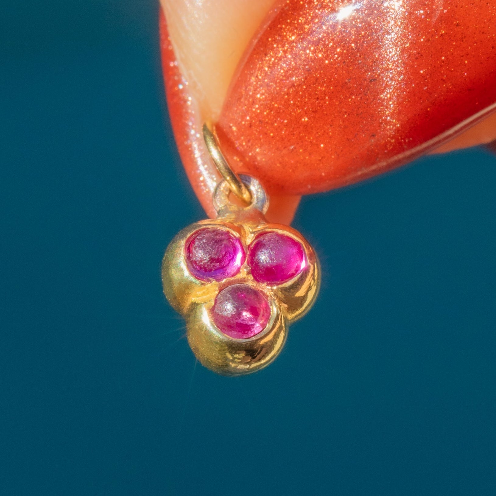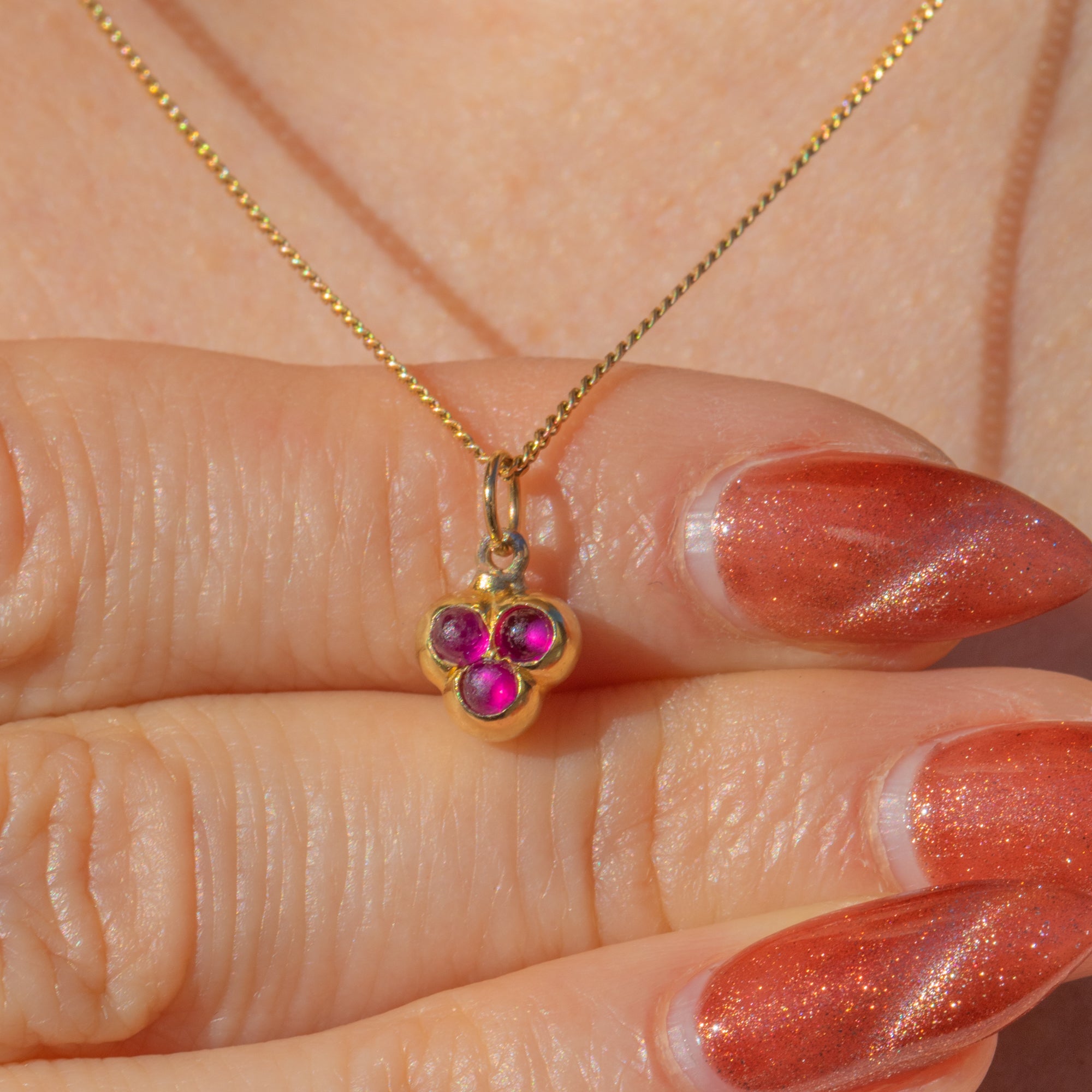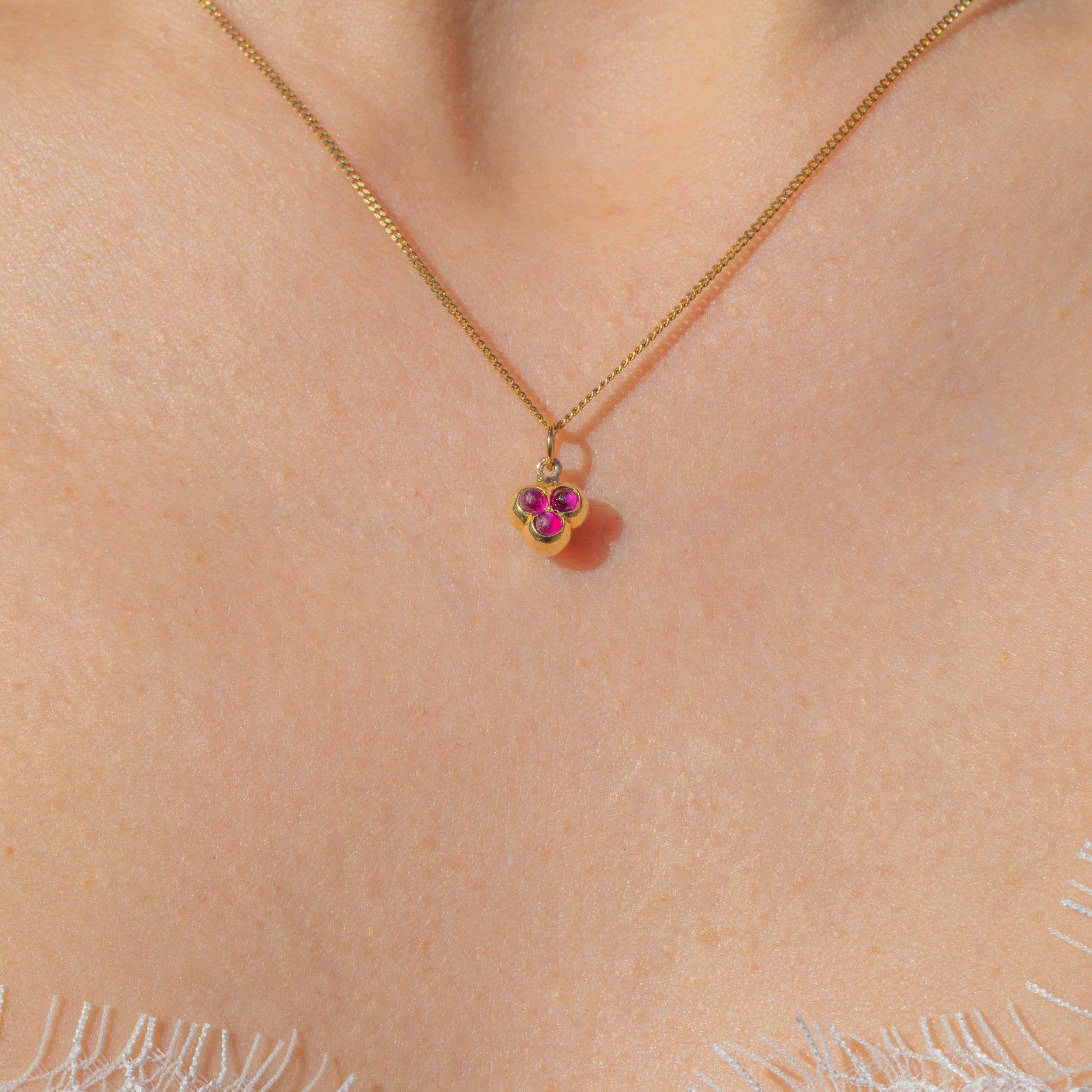 This 18ct Gold Ruby Sapphire trefoil charm is a lovely versatile piece! With six juicy gemstones set within buttery 18ct Gold bezels, this vintage charm is a dainty delight full of character.