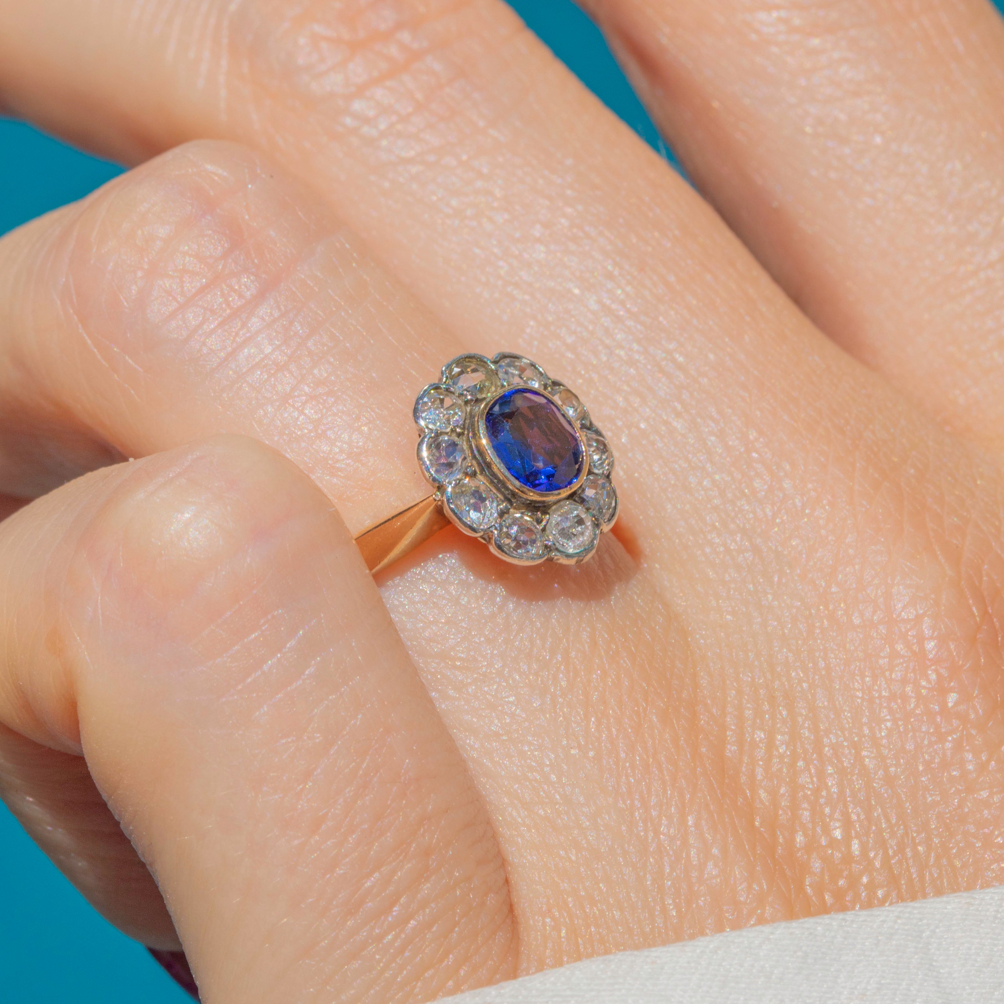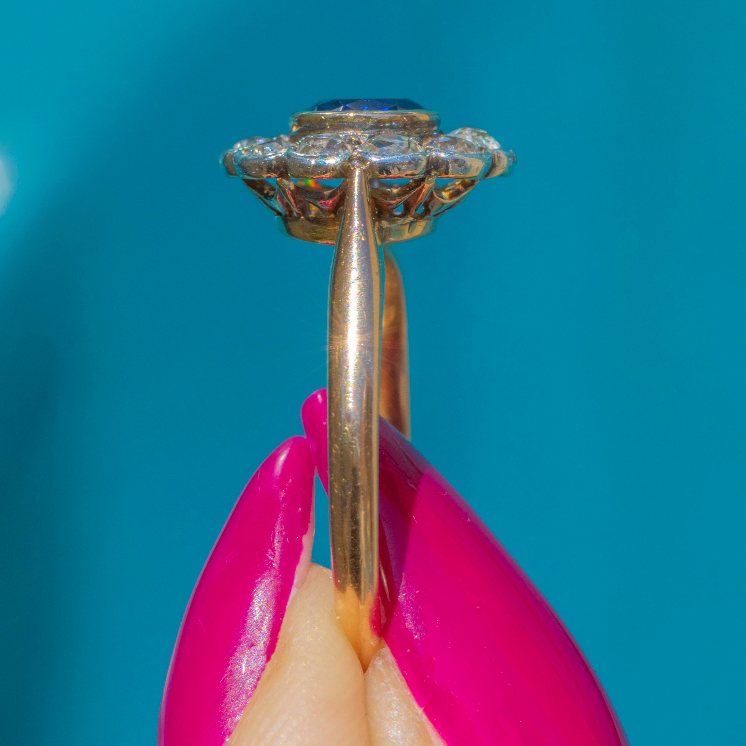 18ct Gold Sapphire Old Mine Cut Diamond Cluster Engagement Ring