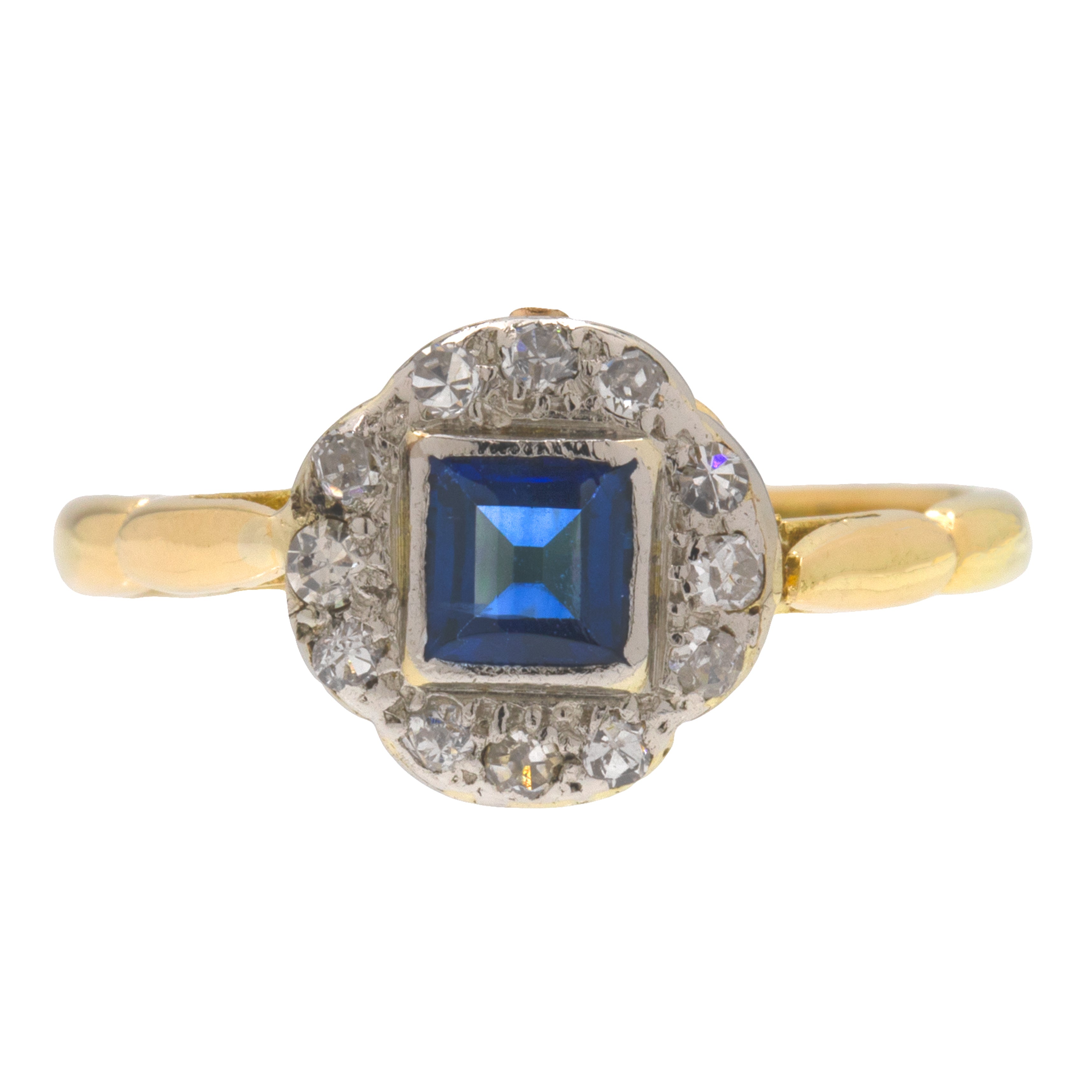 This 18ct Gold Sapphire Diamond cluster ring will make a classy addition to any Vintage jewellery collection. A square-cut Diamond sits poised at her centre, with deep midnight blue hues dancing from facet to facet.
