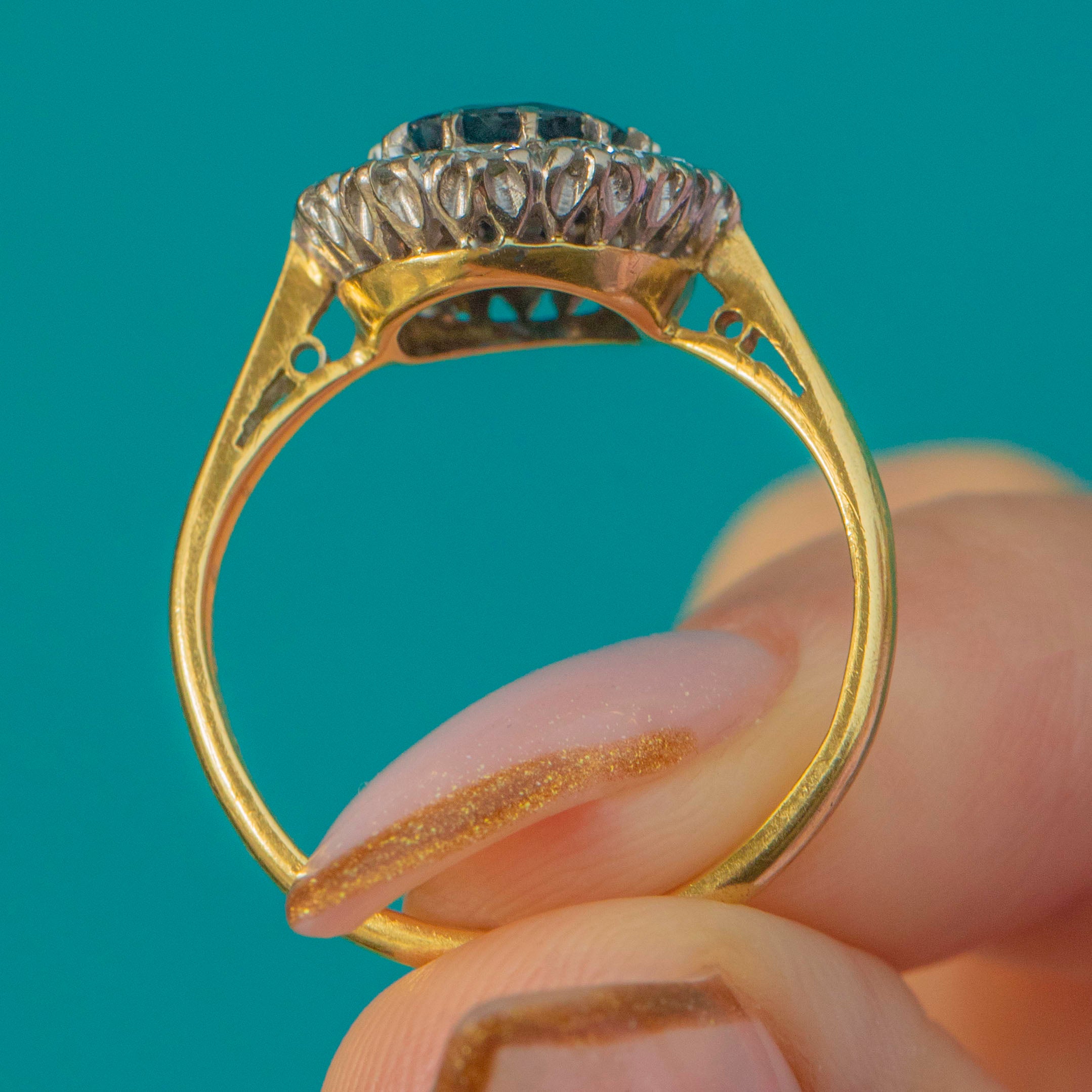 EXCELLENT: The Sapphire is bright and well-polished with no chips or abrasions. The Diamonds are clean and lively, securely set with no damage. The 18ct Gold band shows minimal wear and retains a strong, well-preserved shape. A beautifully maintained Vintage halo ring.