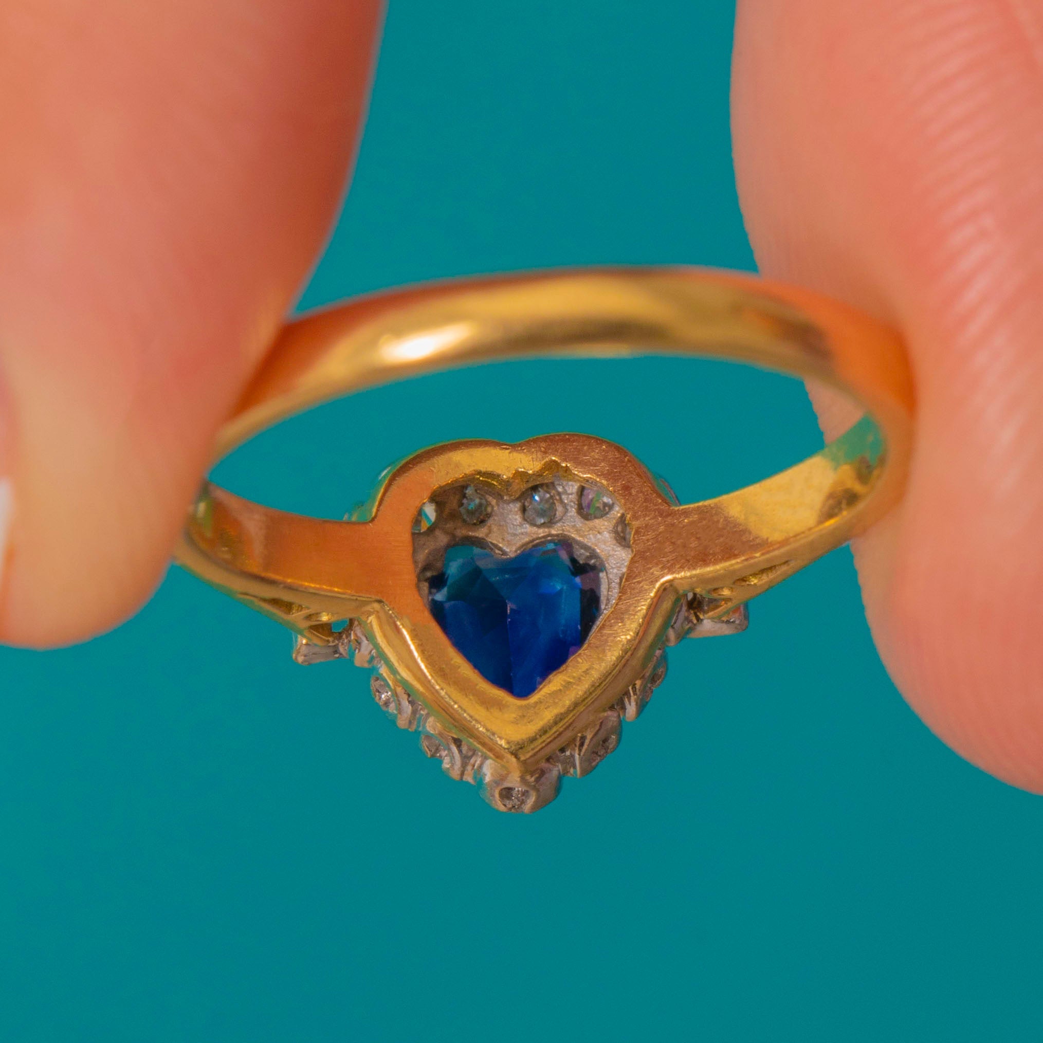 The royal blue Sapphire has been faceted wonderfully, hugged by Platinum claws and resting elegantly on a buttery 18ct Gold band. Crafted into an adorable romantic heart shape, this vintage Sapphire and Diamond ring would make the perfect choice for a unique engagement ring!