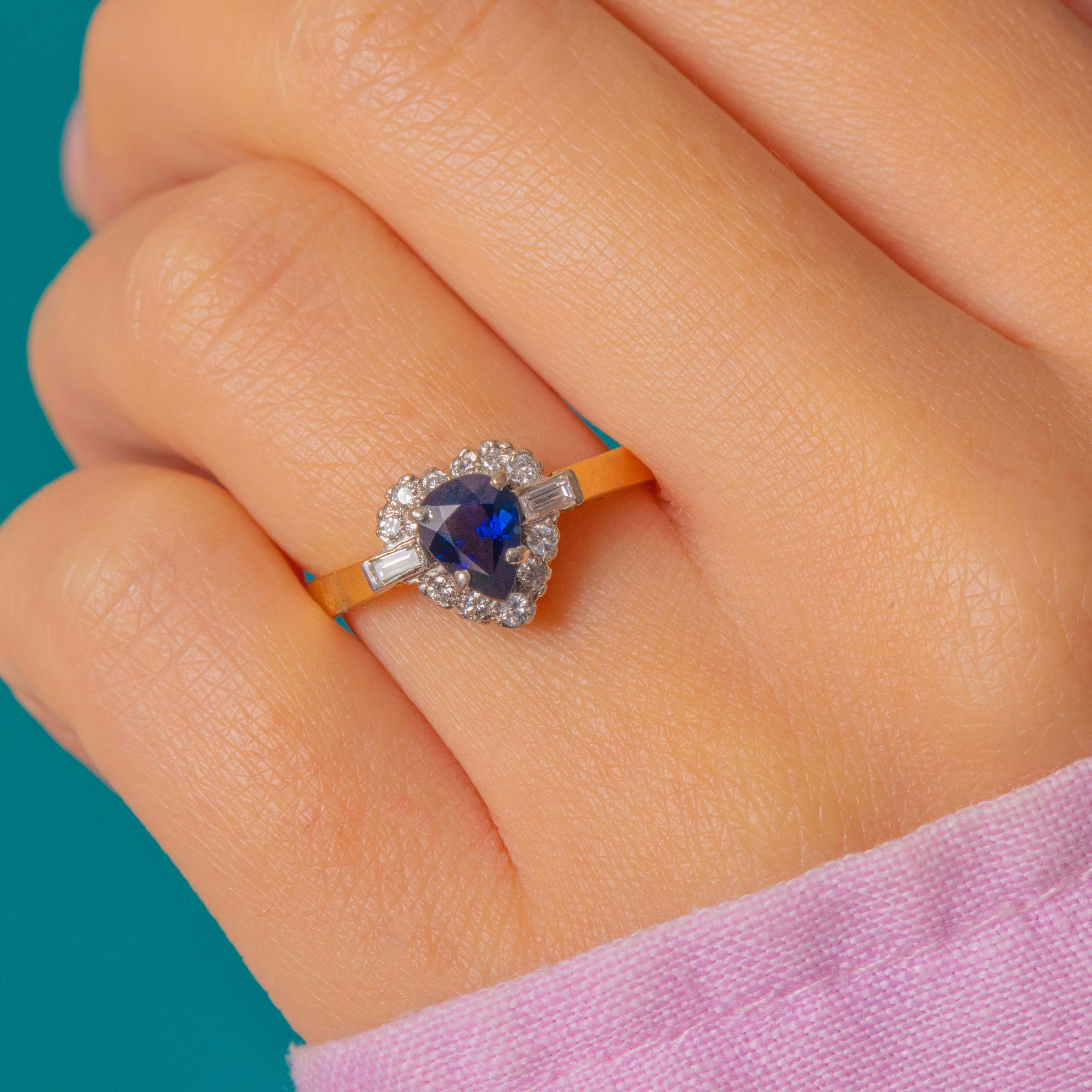 A charming 18ct Gold vintage pear cut natural Sapphire ring, haloed by a cluster of scintillating bright Diamonds akin to a starry night sky!