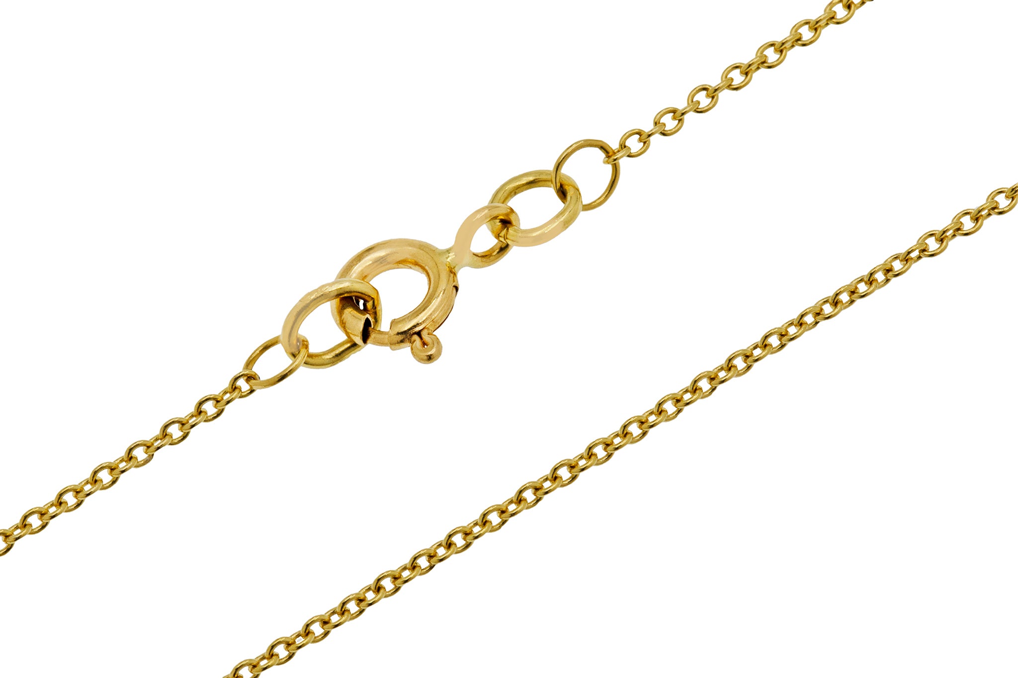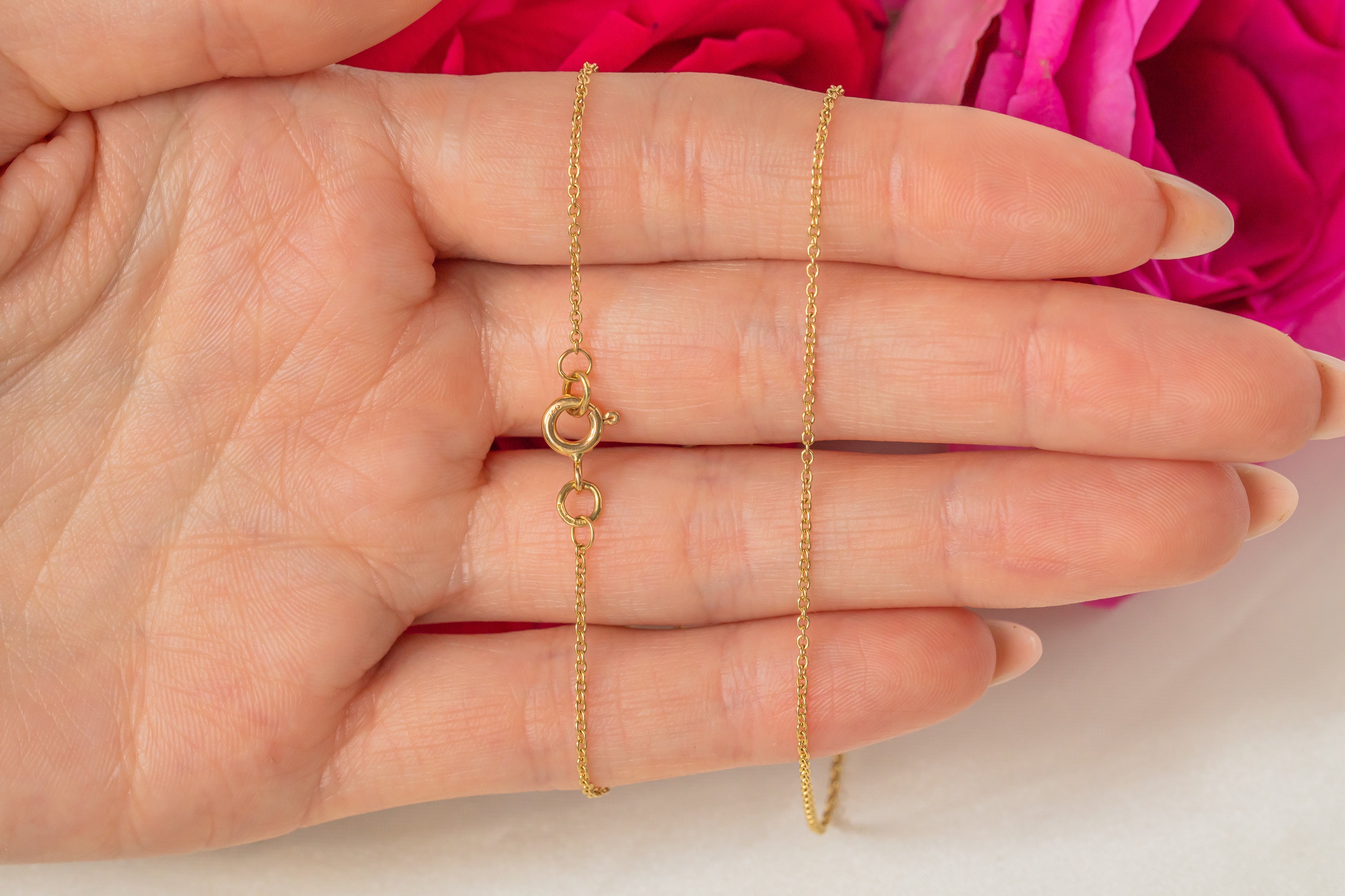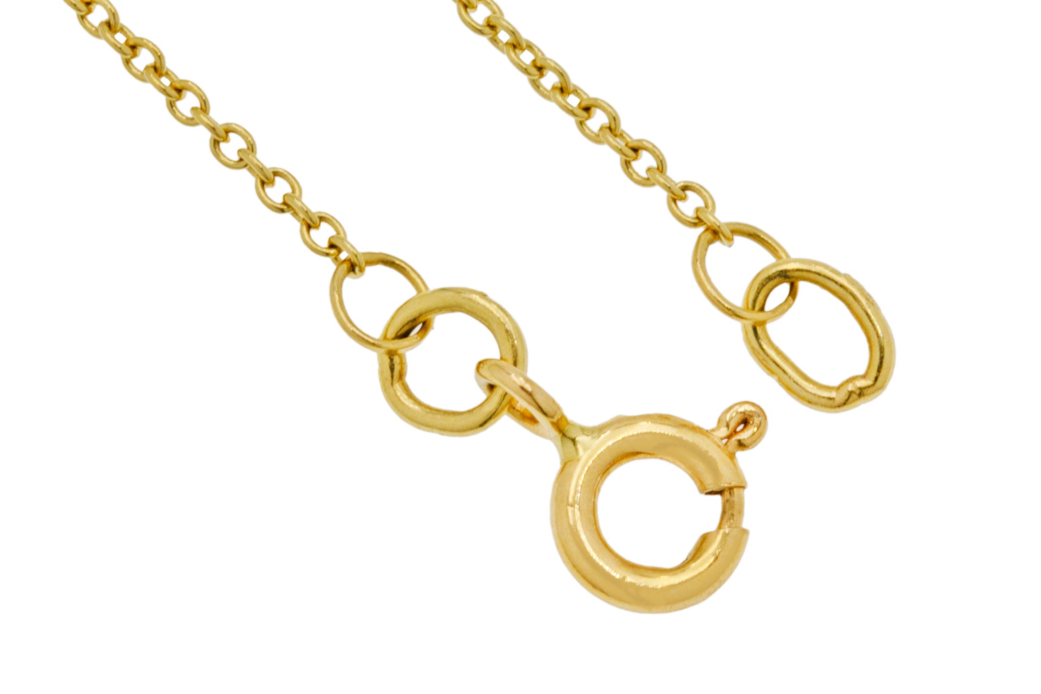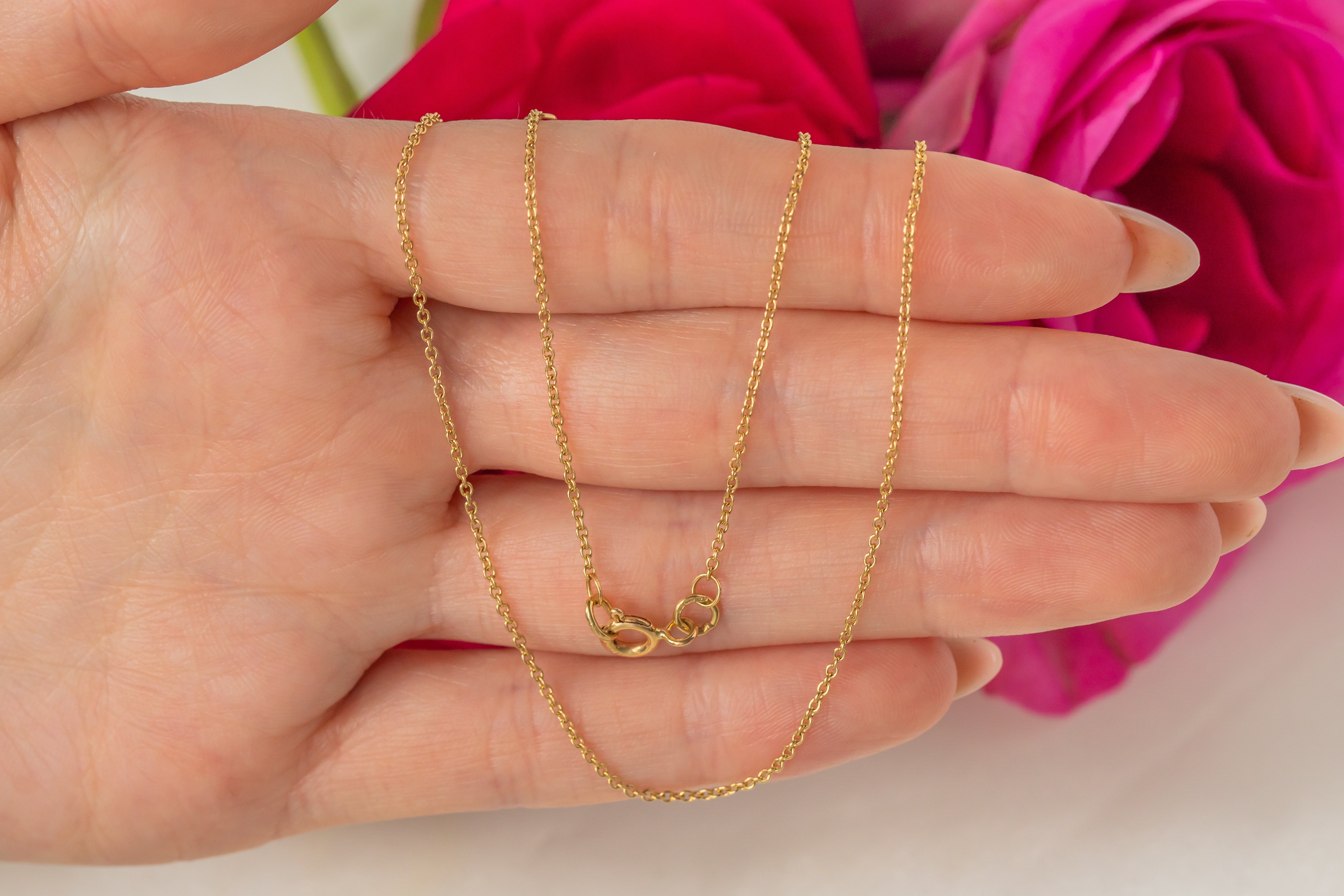 EXCELLENT. This 18ct Gold skinny pendant chain is in excellent condition. This piece has so much wear potential and hasn't aged a day since her mid-century start in life. The links are firmly attached and the bolt ring is in perfect working order, allowing you to wear it with confidence.