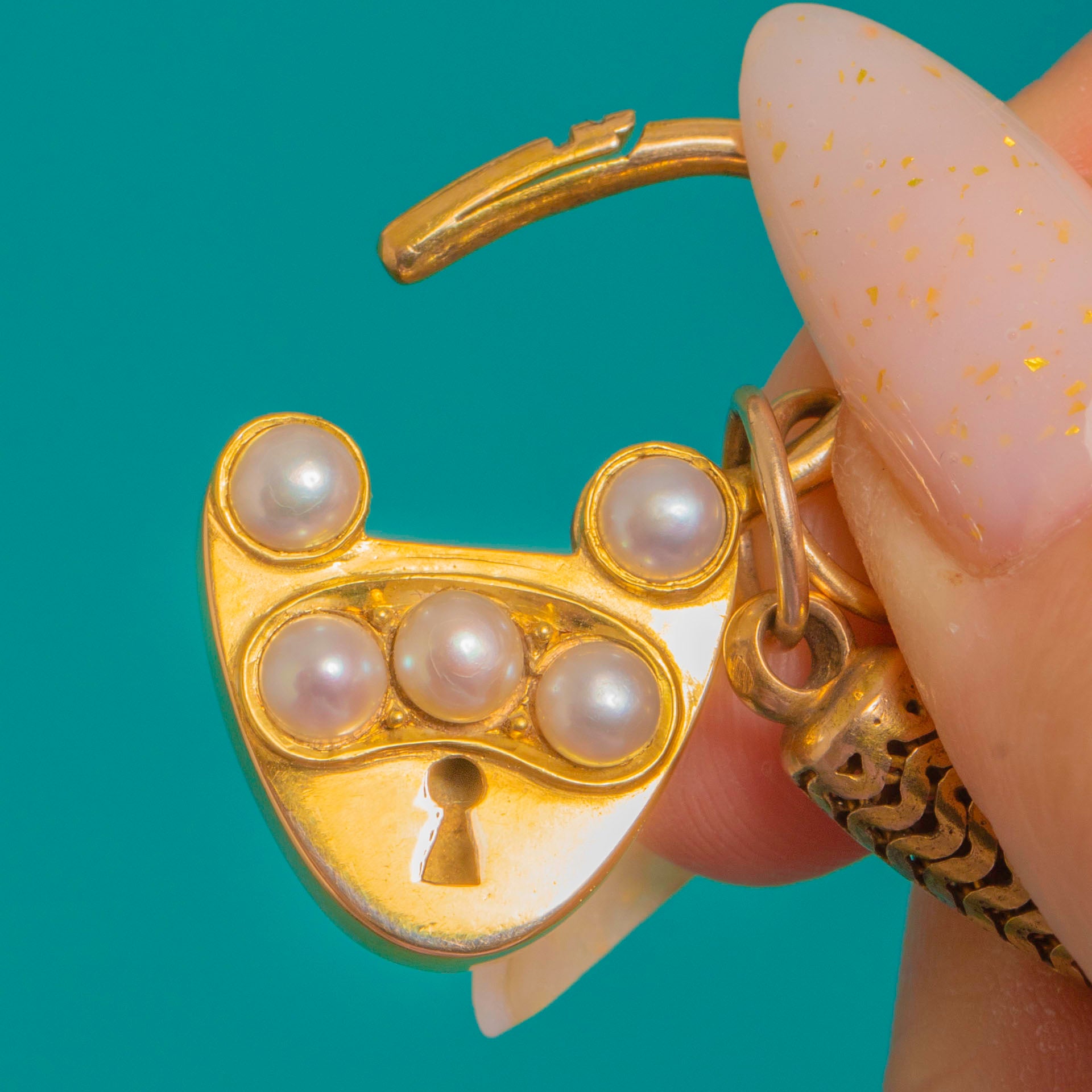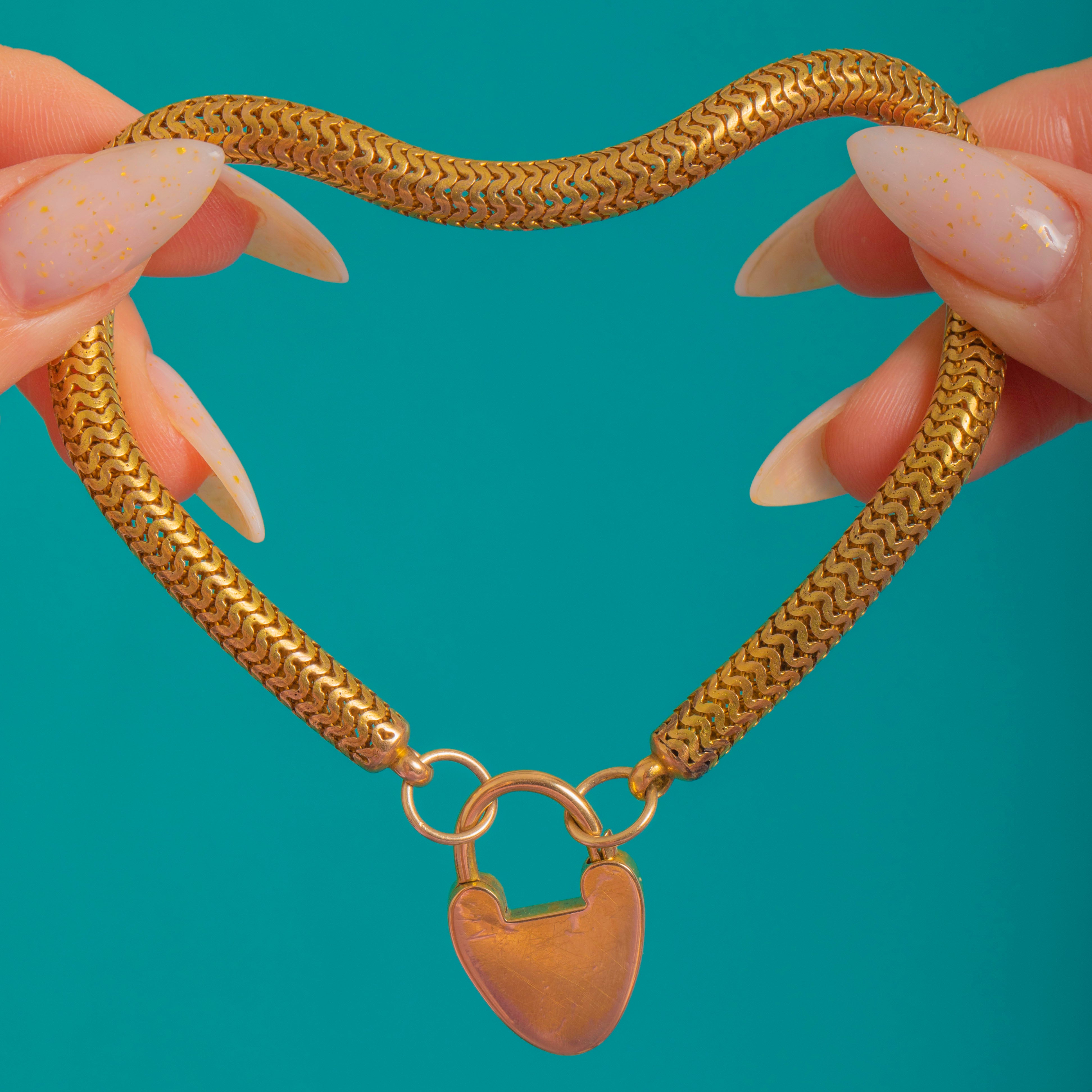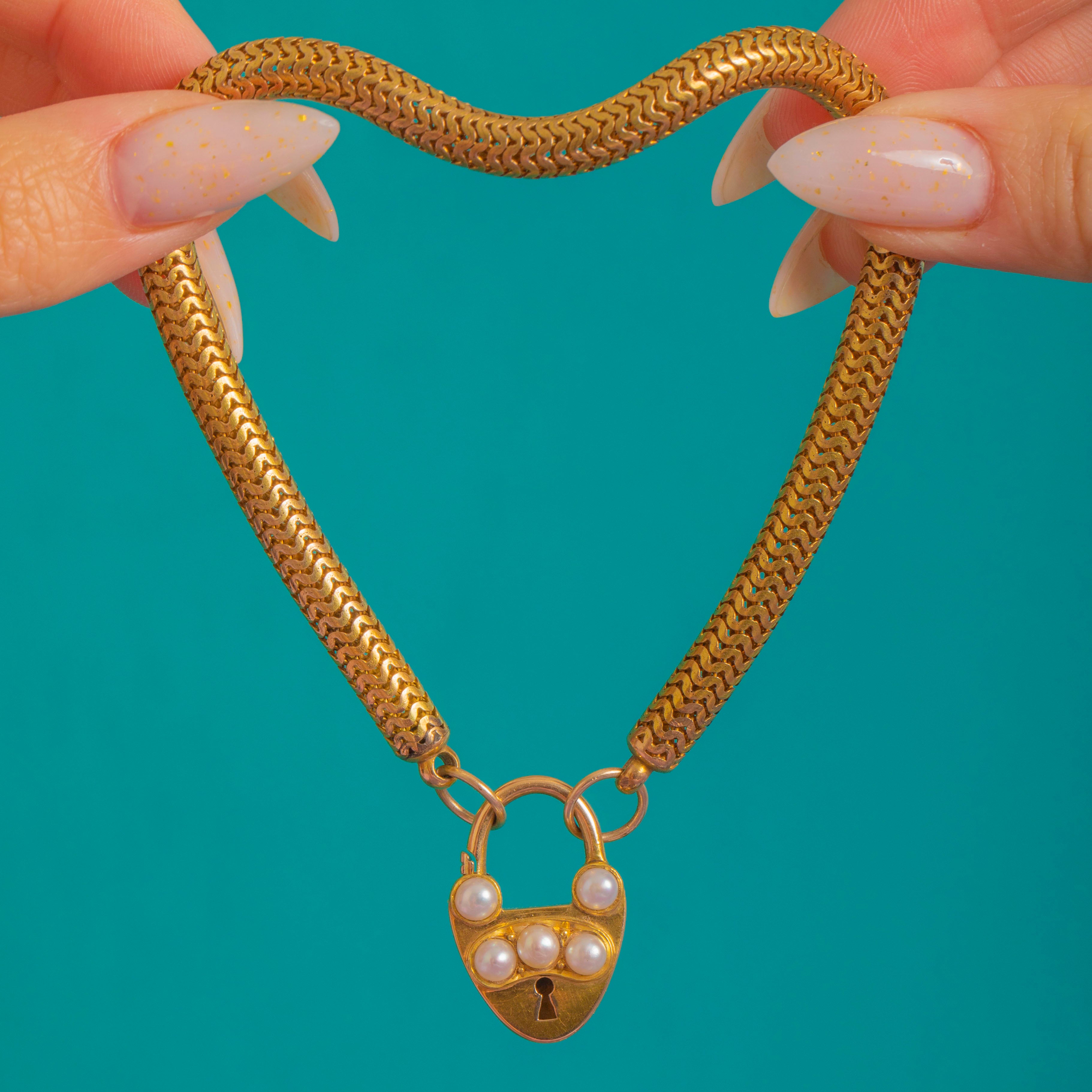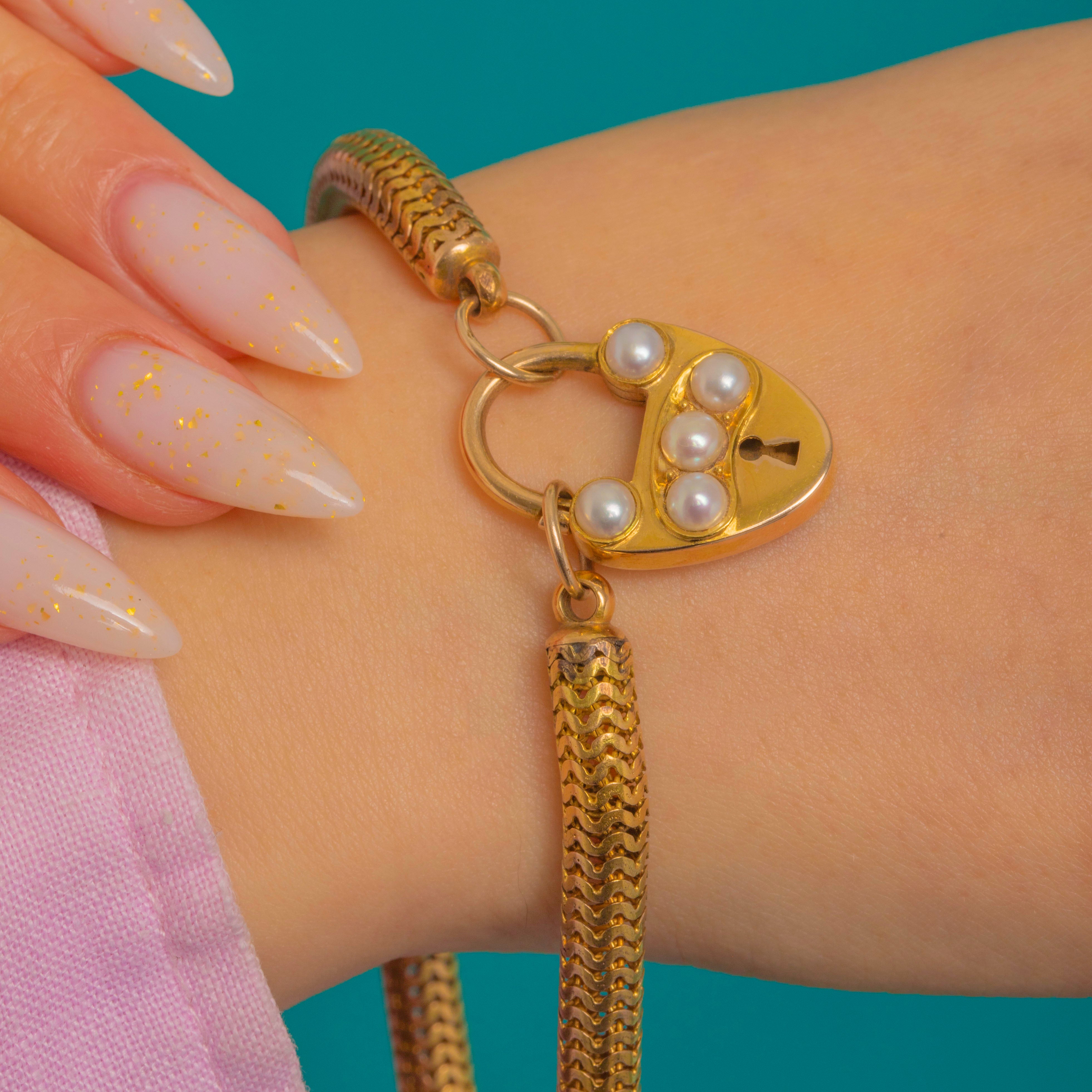 A romantic Victorian sweetheart bracelet marrying fluid 15ct Gold with a charming 18ct Gold heart padlock. The sleek snake chain drapes beautifully on the wrist, while the polished padlock gleams with a keyhole motif and a diagonal line of five creamy Pearls for a soft, luminous accent.