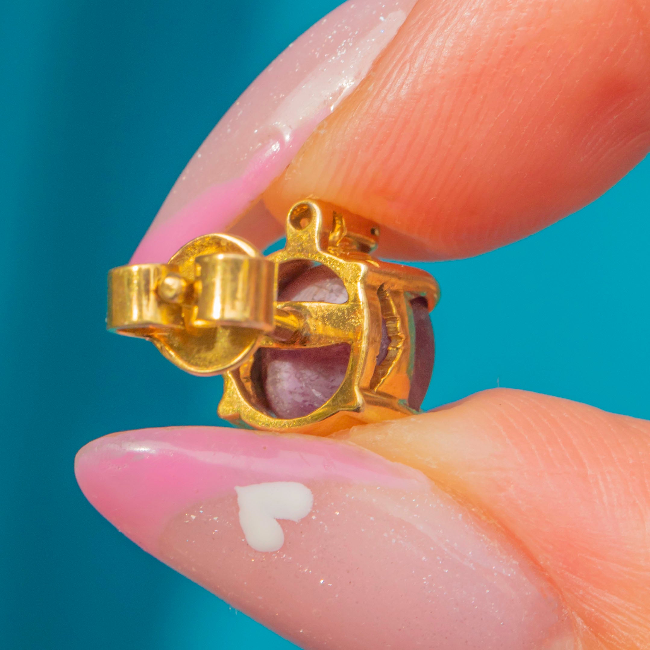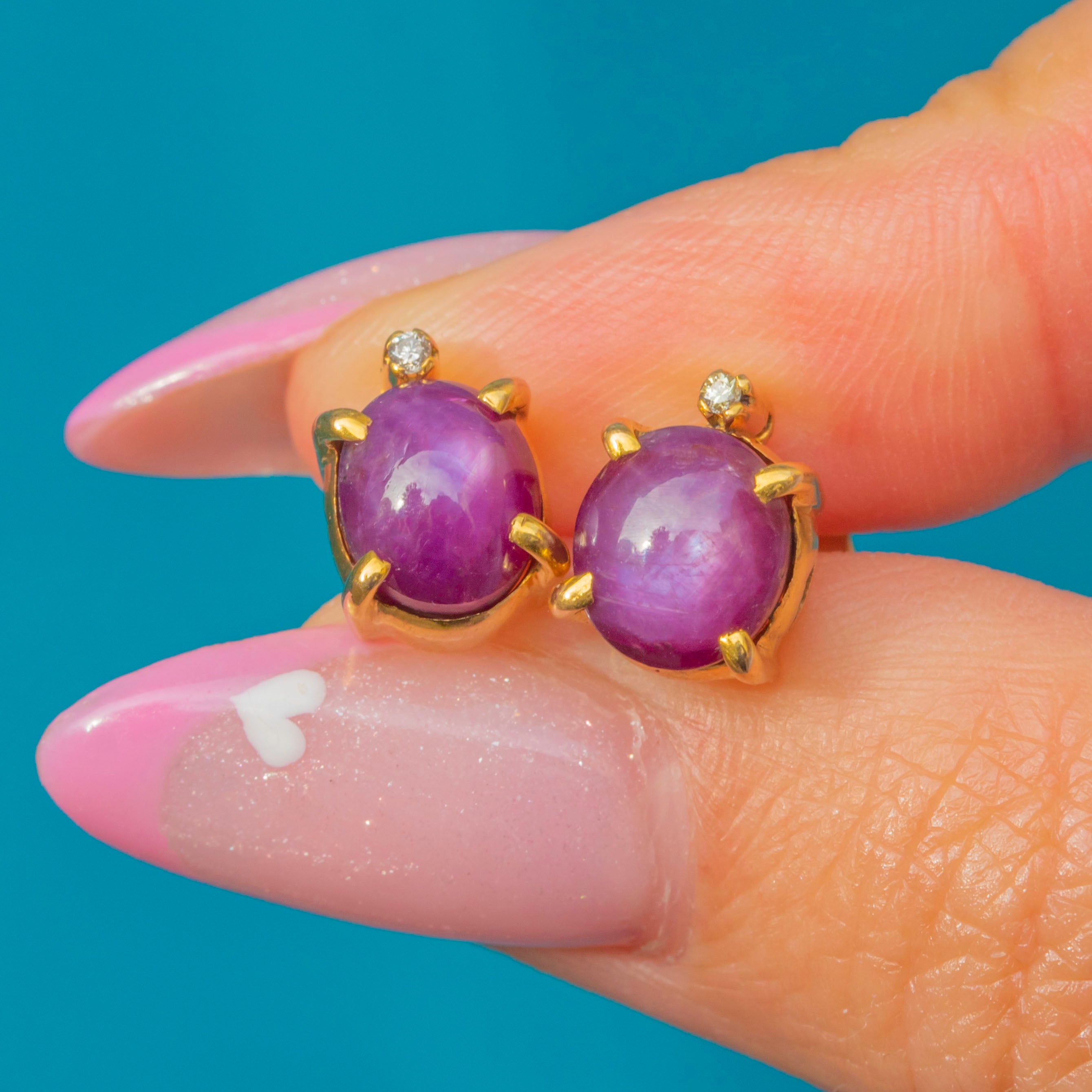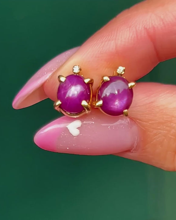 These Vintage 18ct Gold earrings centre on a pair of vivid purplish-red Star Rubies, each displaying a soft six-rayed star under direct light, a captivating natural optical effect known as asterism. The Rubies are framed by petite sparkling Diamonds that add just a touch of contrast and shimmer.