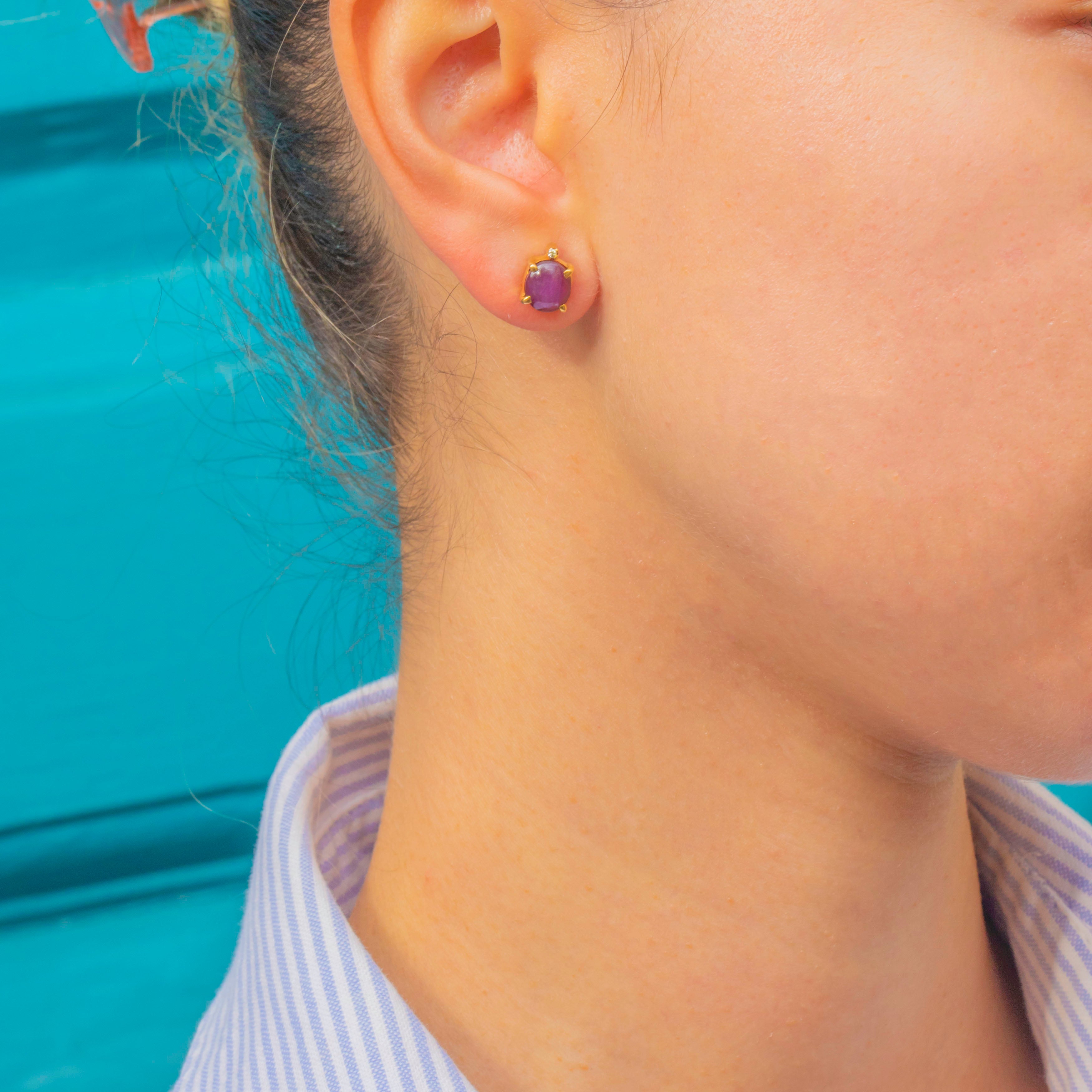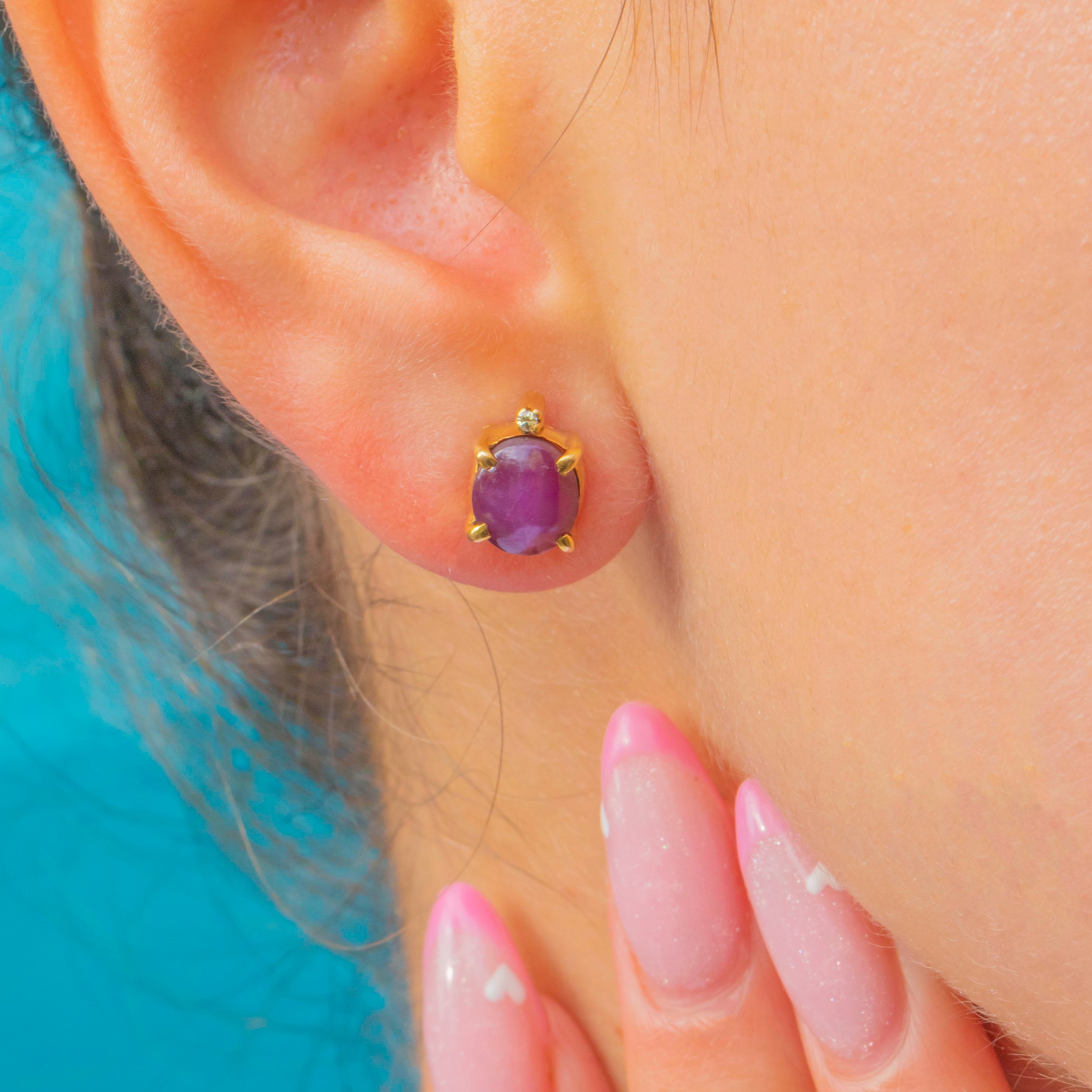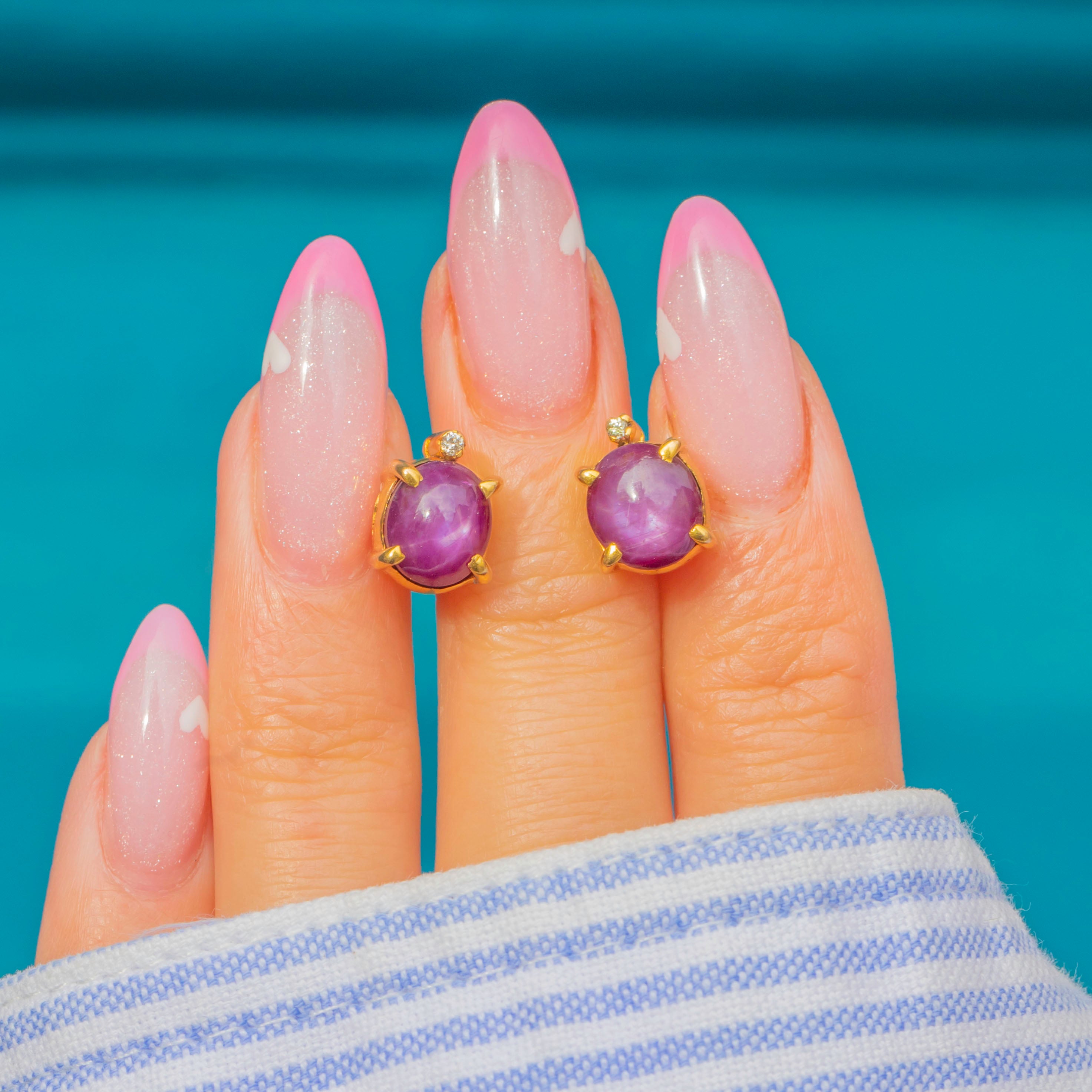 These Vintage 18ct Gold earrings centre on a pair of vivid purplish-red Star Rubies, each displaying a soft six-rayed star under direct light, a captivating natural optical effect known as asterism. The Rubies are framed by petite sparkling Diamonds that add just a touch of contrast and shimmer.