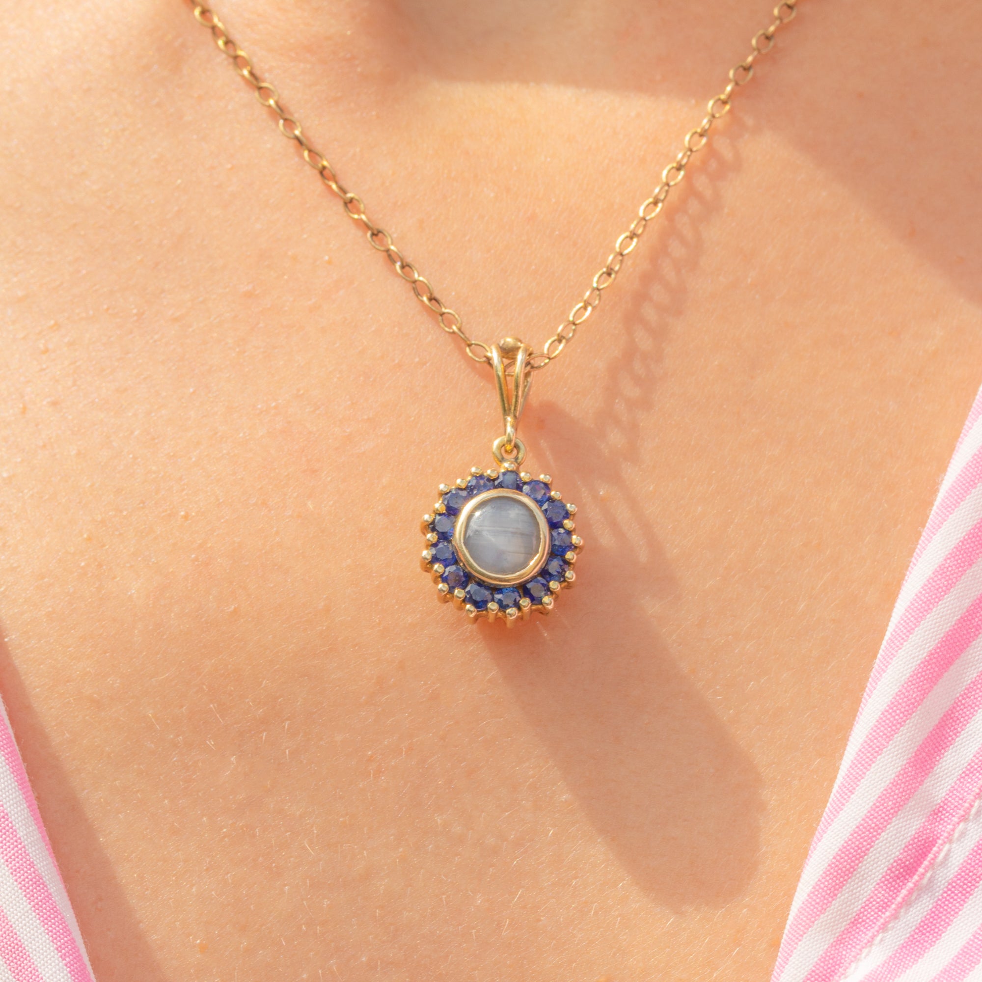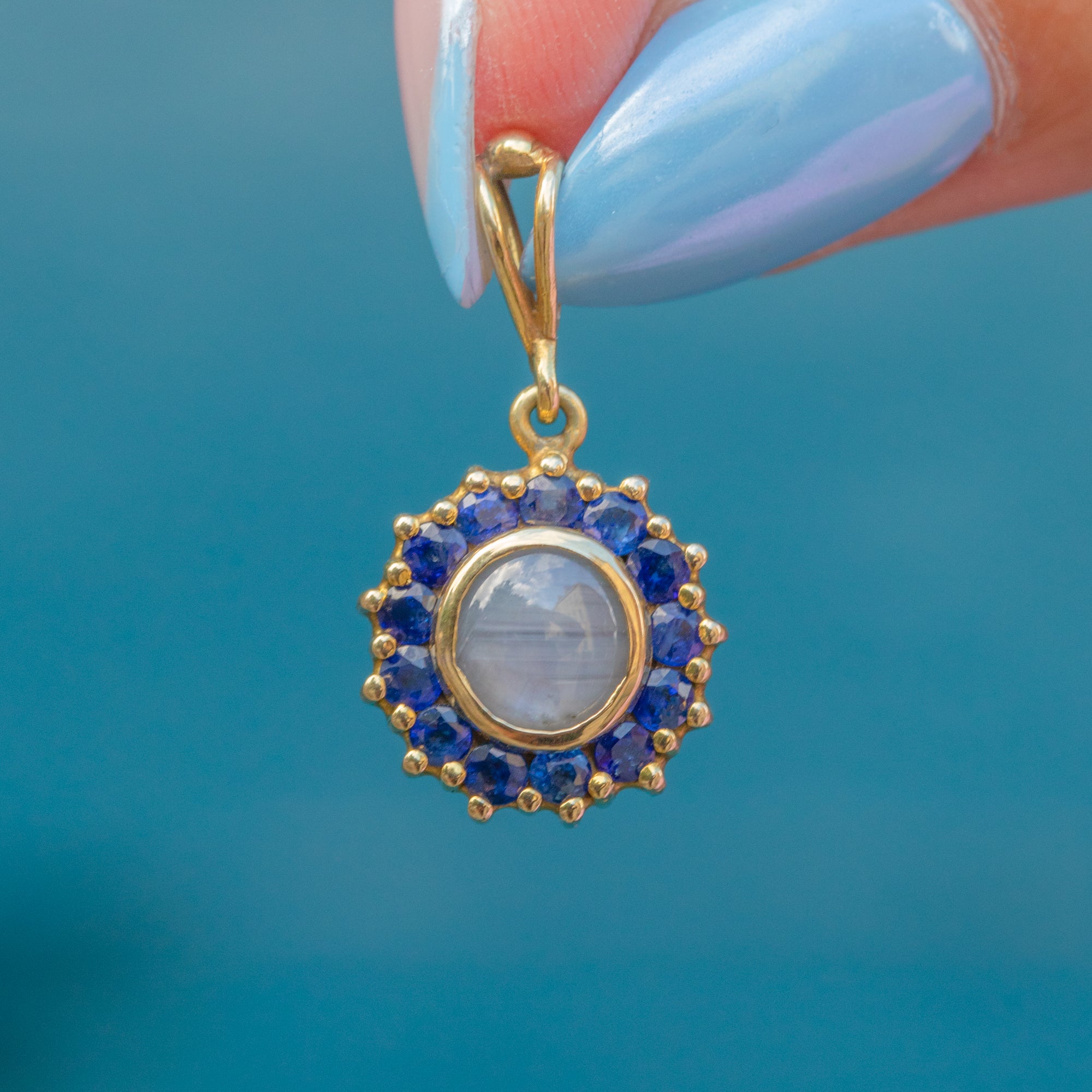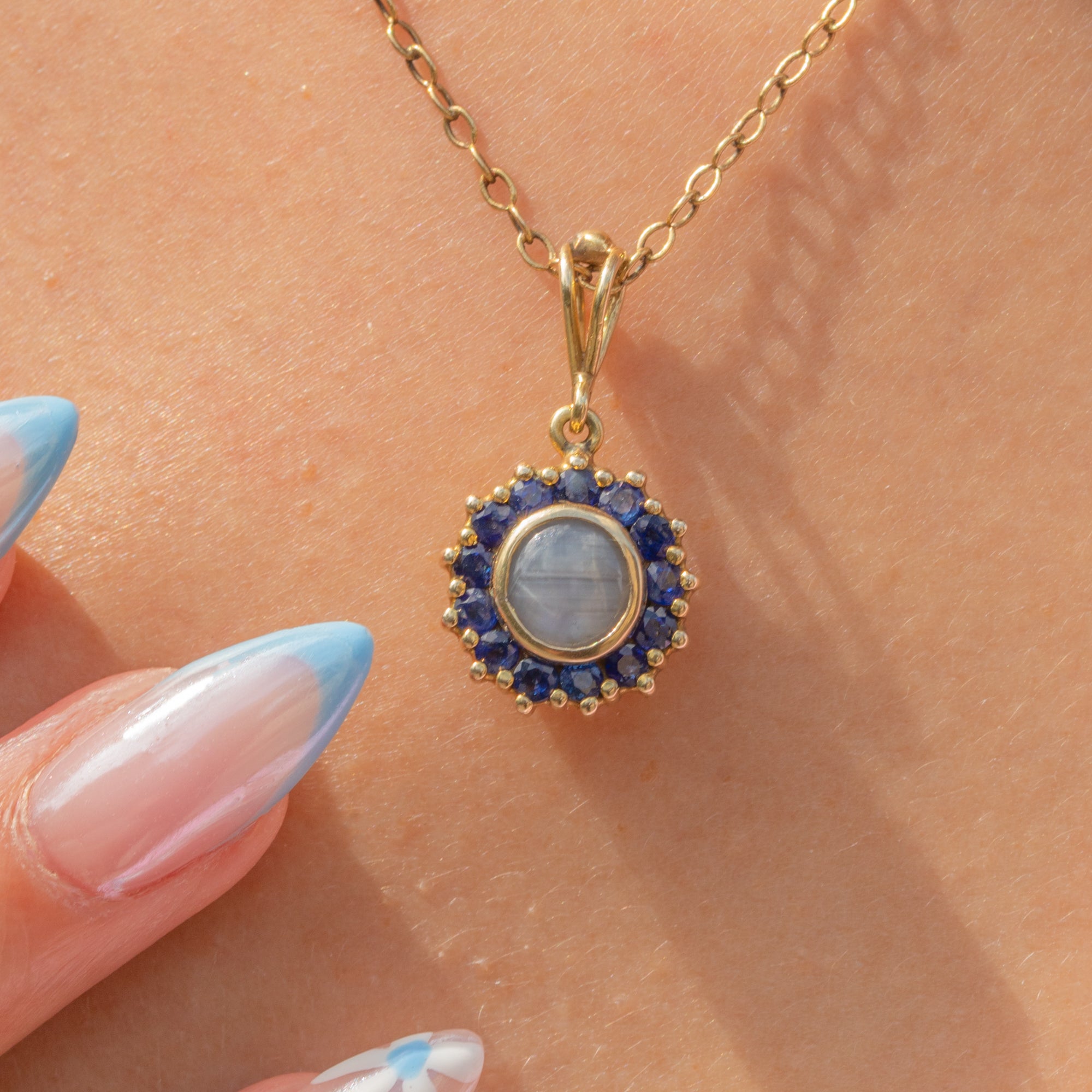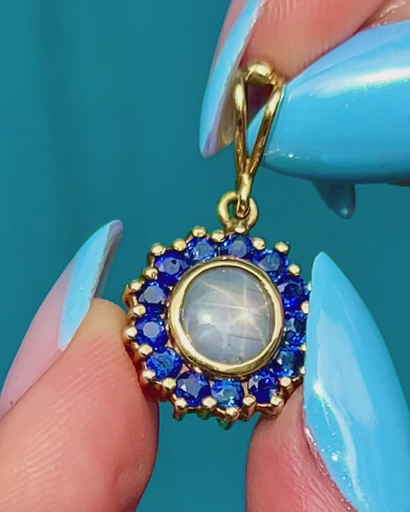 This vintage Sapphire charm is an elegant little treasure! The pendant is finely crafted from radiant 18ct Gold and displays a natural Star Sapphire in its centre, with a distinct asterism that gives it its celestial name, haloed by dainty midnight blue Sapphires that glint subtly in the light.