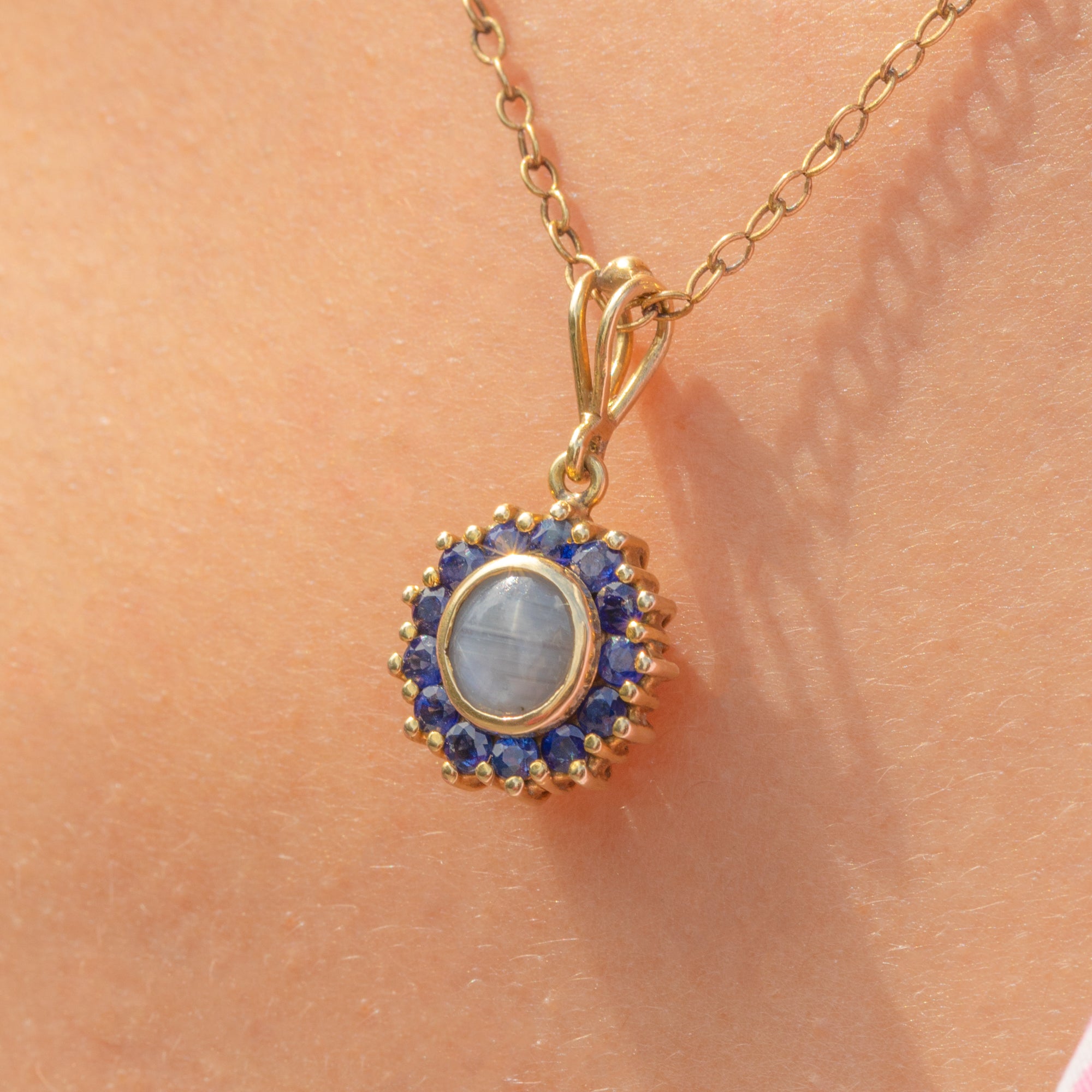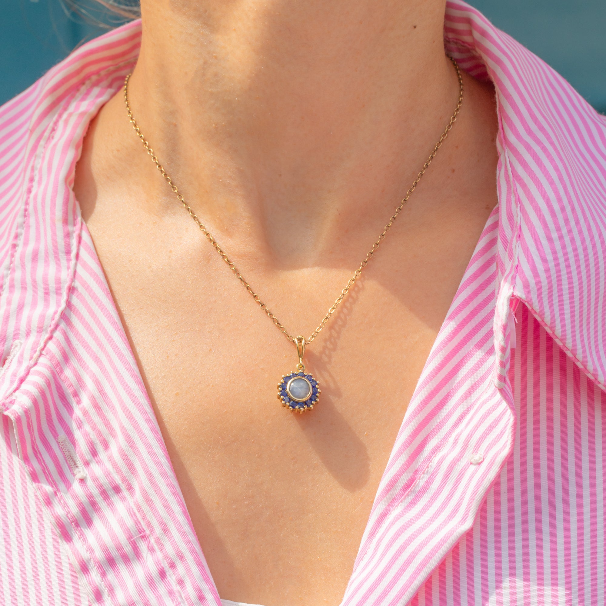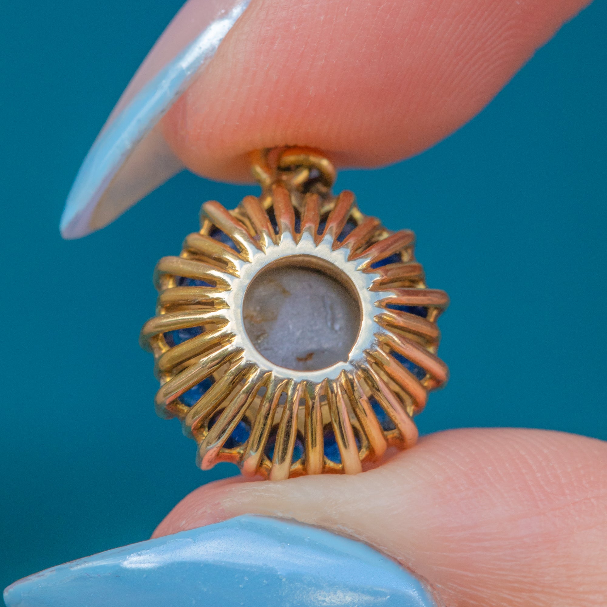 This vintage Sapphire charm is an elegant little treasure! The pendant is finely crafted from radiant 18ct Gold and displays a natural Star Sapphire in its centre, with a distinct asterism that gives it its celestial name, haloed by dainty midnight blue Sapphires that glint subtly in the light.