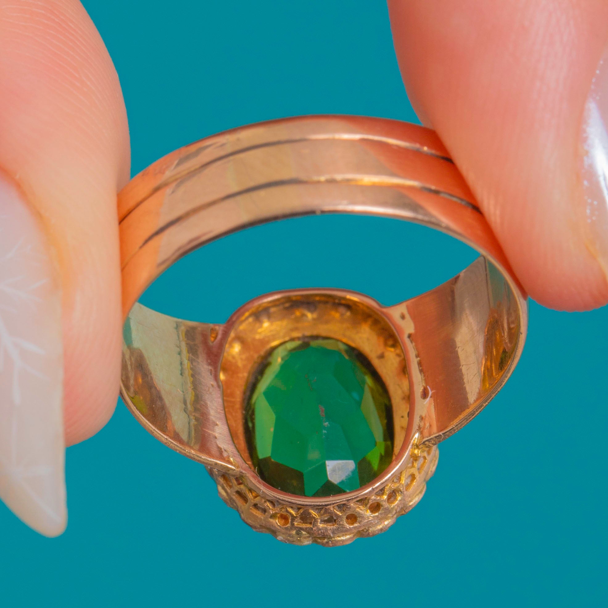 VERY GOOD: The Tourmaline shows light abrasions under magnification (to the underside of the stone); the Seed Pearls are present and neatly set with subtle natural irregularity. The Gold shank and settings show light surface wear and a gentle patina consistent with age, with secure settings throughout.