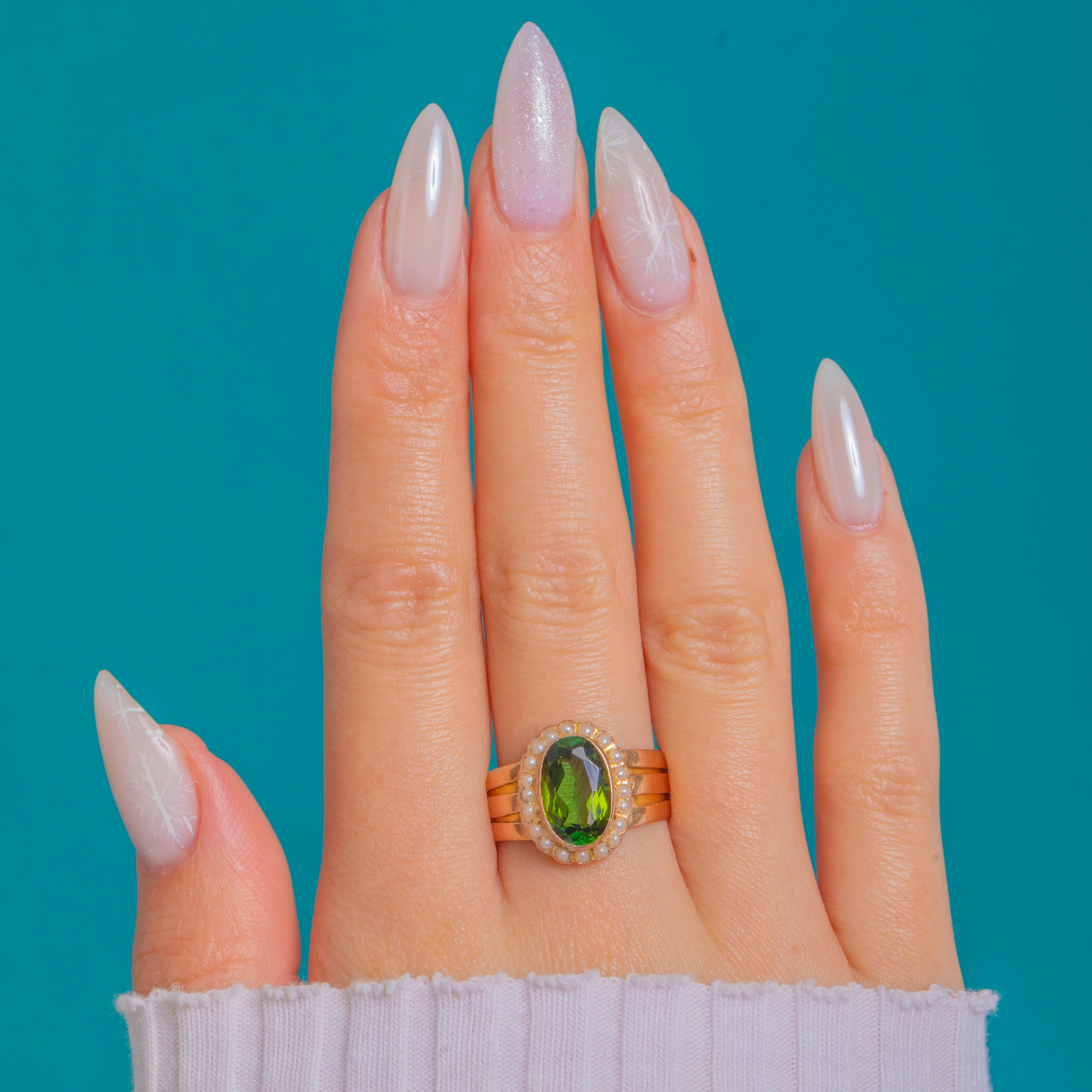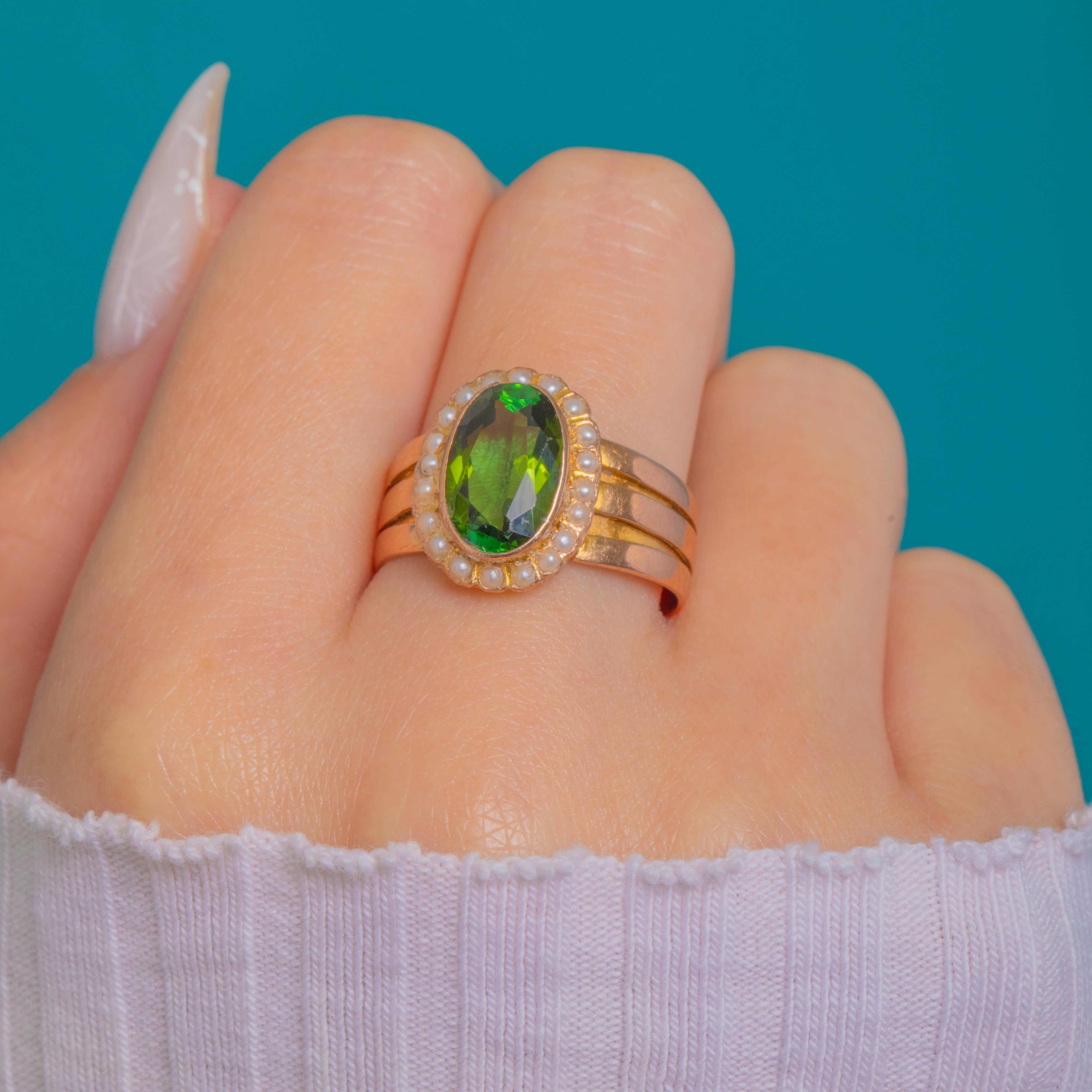 A romantic Victorian cluster ring glowing with fresh spring colour. At its heart sits a bright green oval Tourmaline in a tall closed-back rub-over bezel, encircled by a pristine halo of petite Seed Pearls. The head is lifted on an ornate under-gallery, giving beautiful height and presence on the finger.