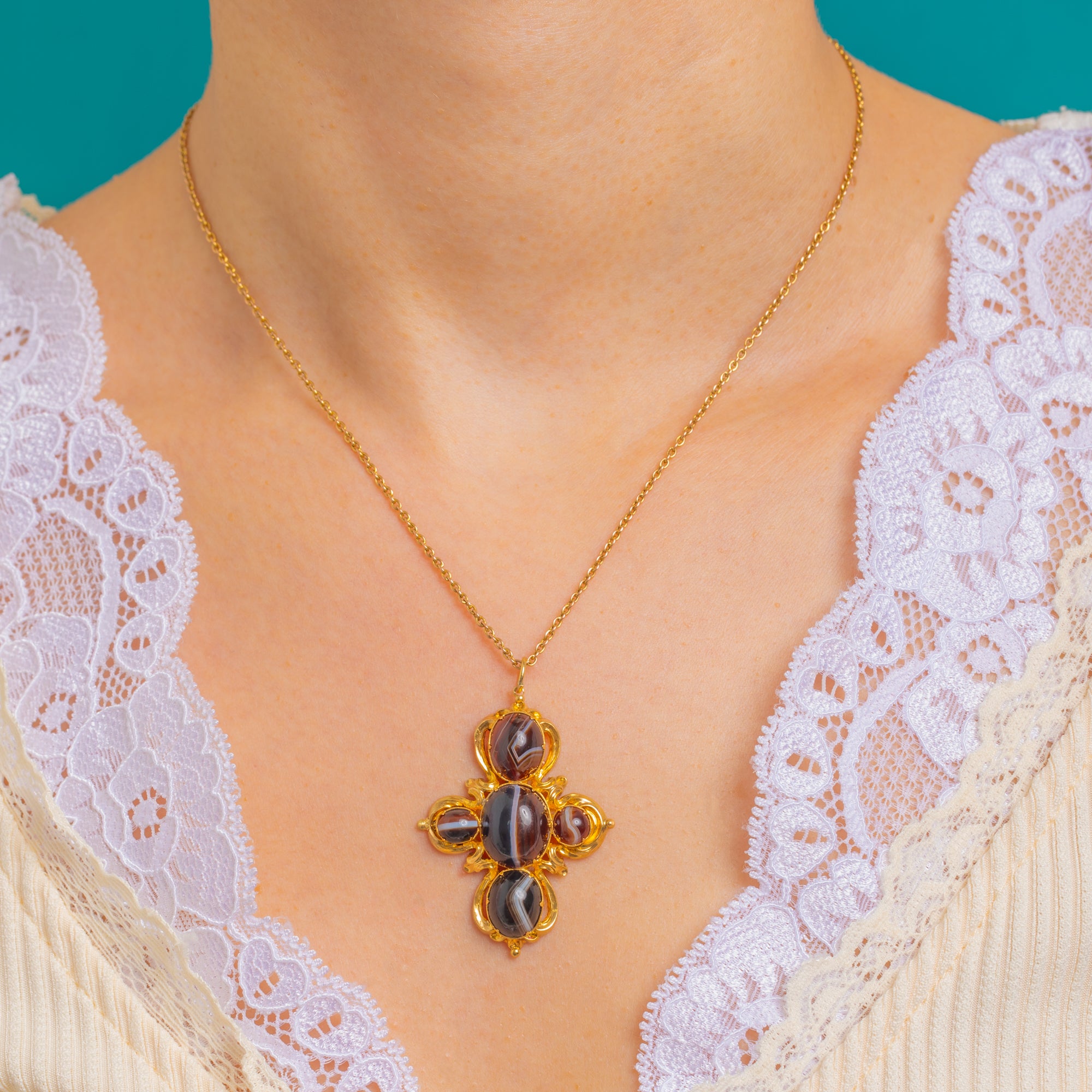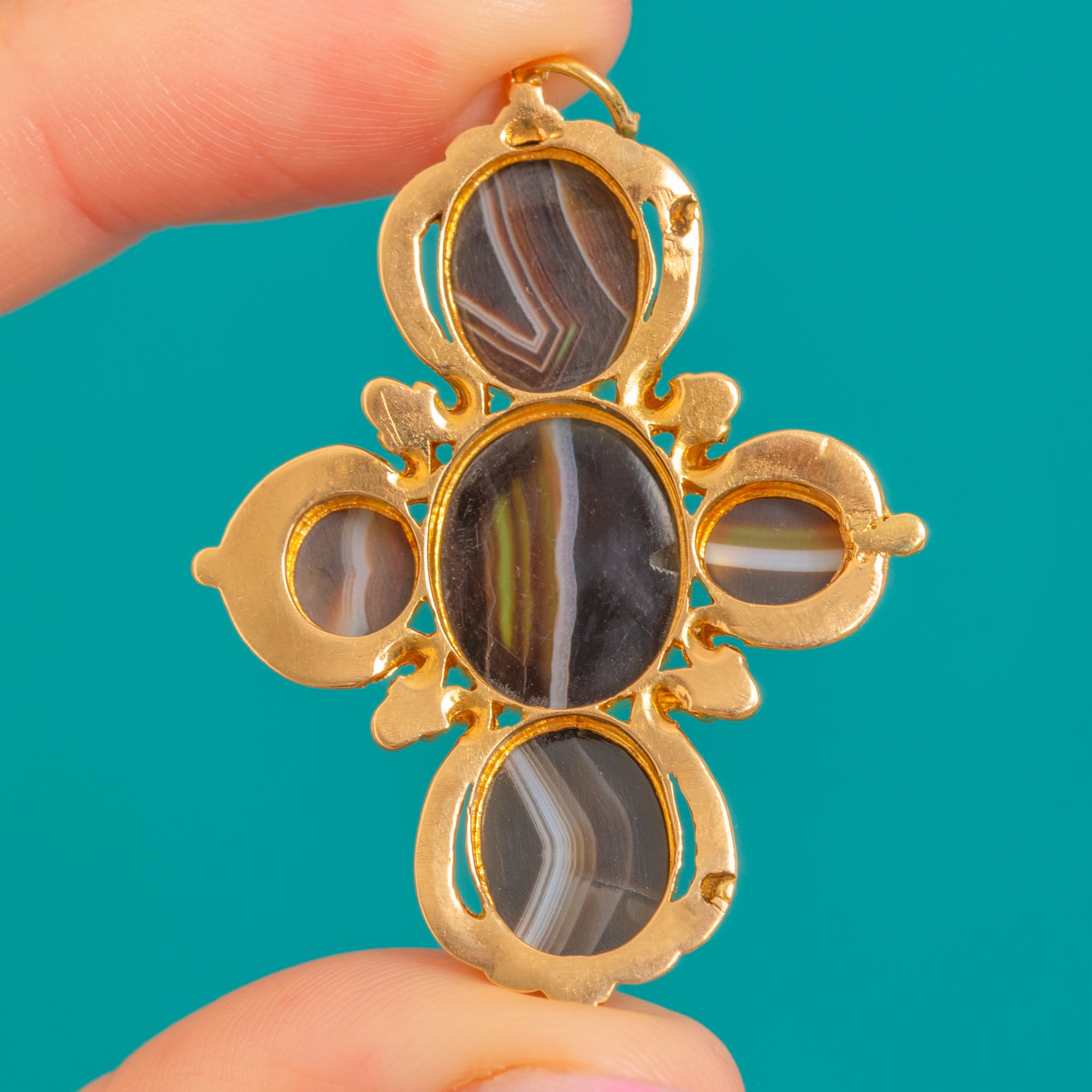 A sumptuous Victorian 18ct Gold “girandole” cross pendant set with five glossy Agate cabochons. The stones display striking natural banding in shades of chocolate, cream and near-black, arranged in a bold, symmetrical cross that feels both romantic and refined.