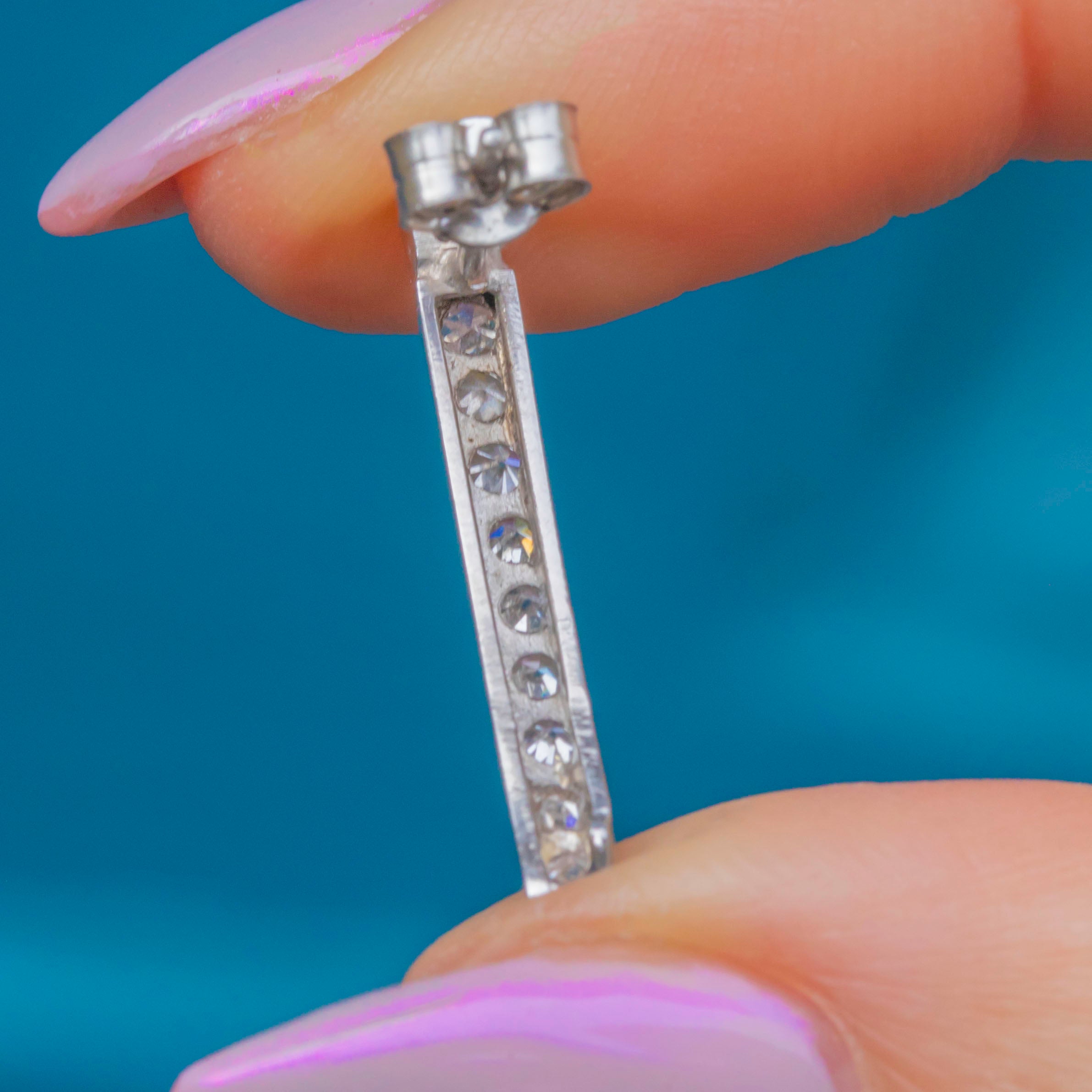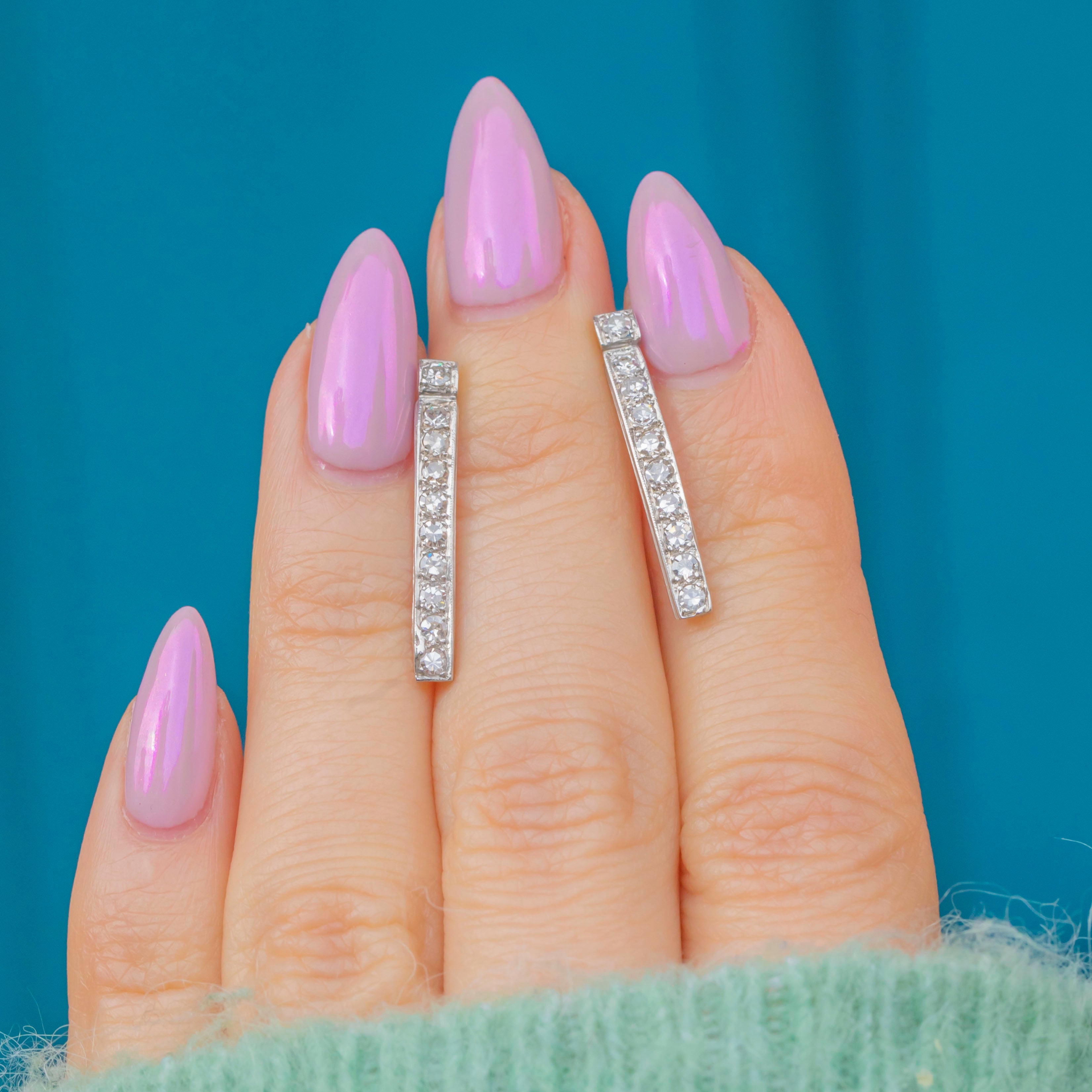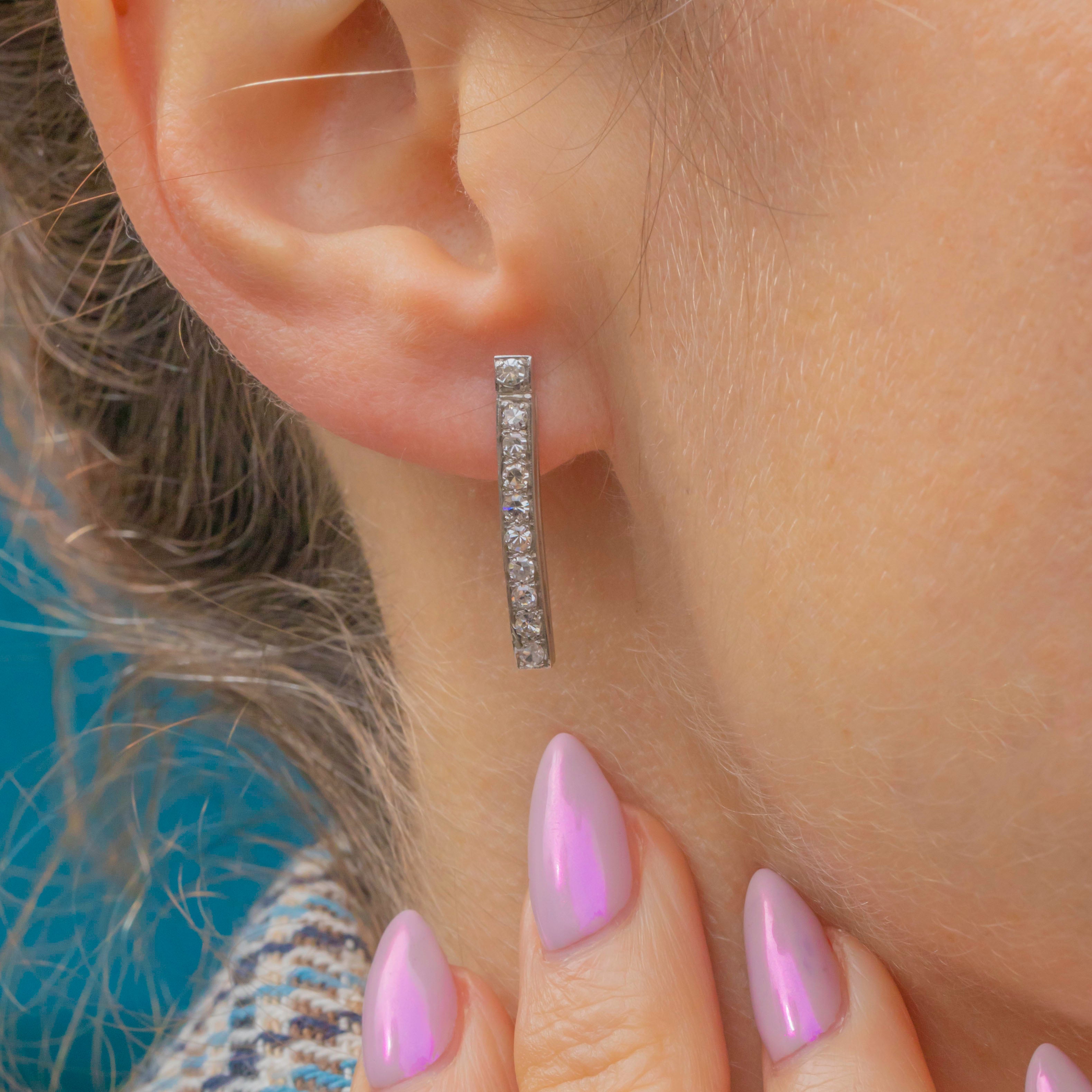 These elegant vintage bar earrings are crafted in rhodium-plated 18ct White Gold and set with sparkling Diamonds totalling approximately 0.60ct. Each earring features a sleek vertical line of bright 2mm Diamonds, creating a refined and timeless look that catches the light beautifully.