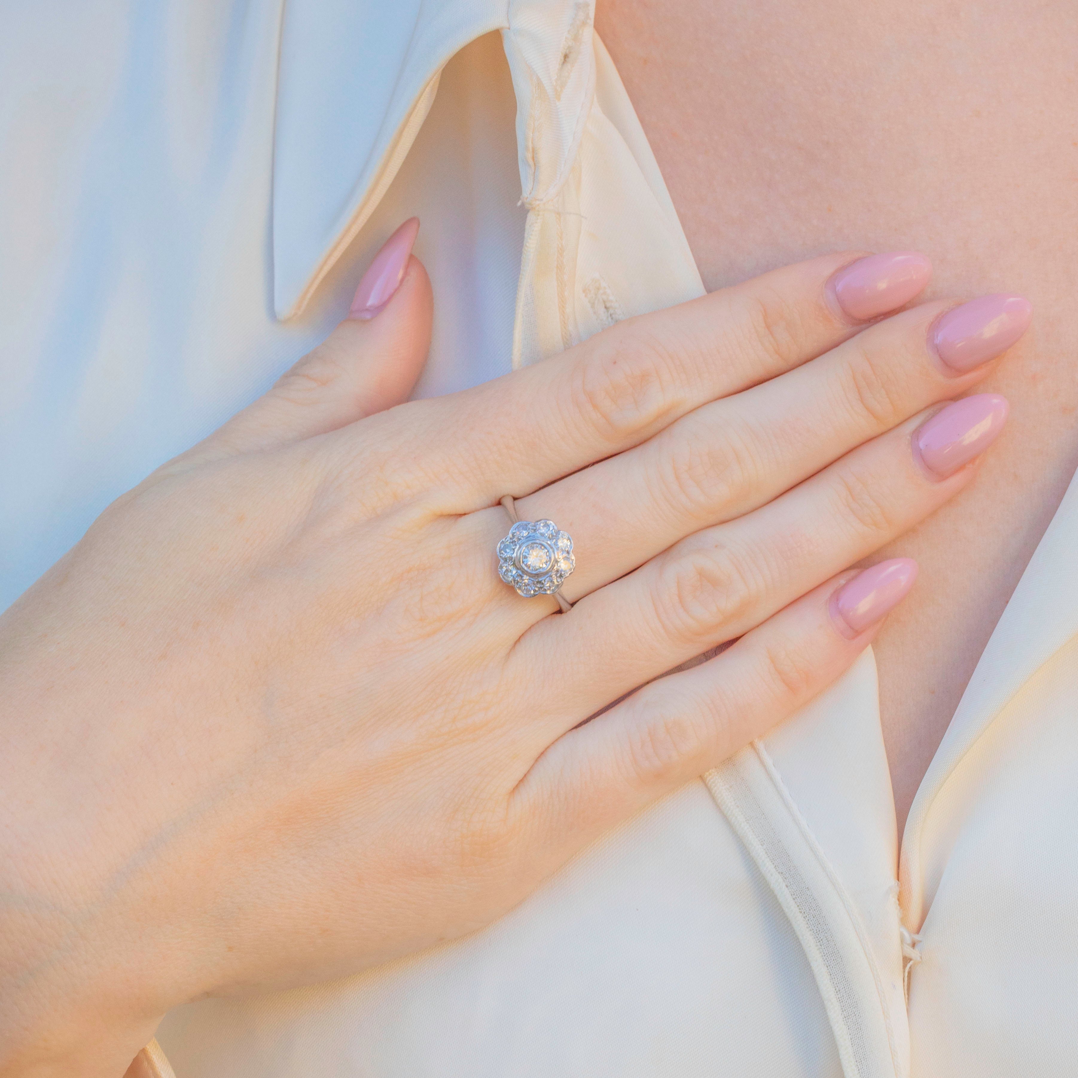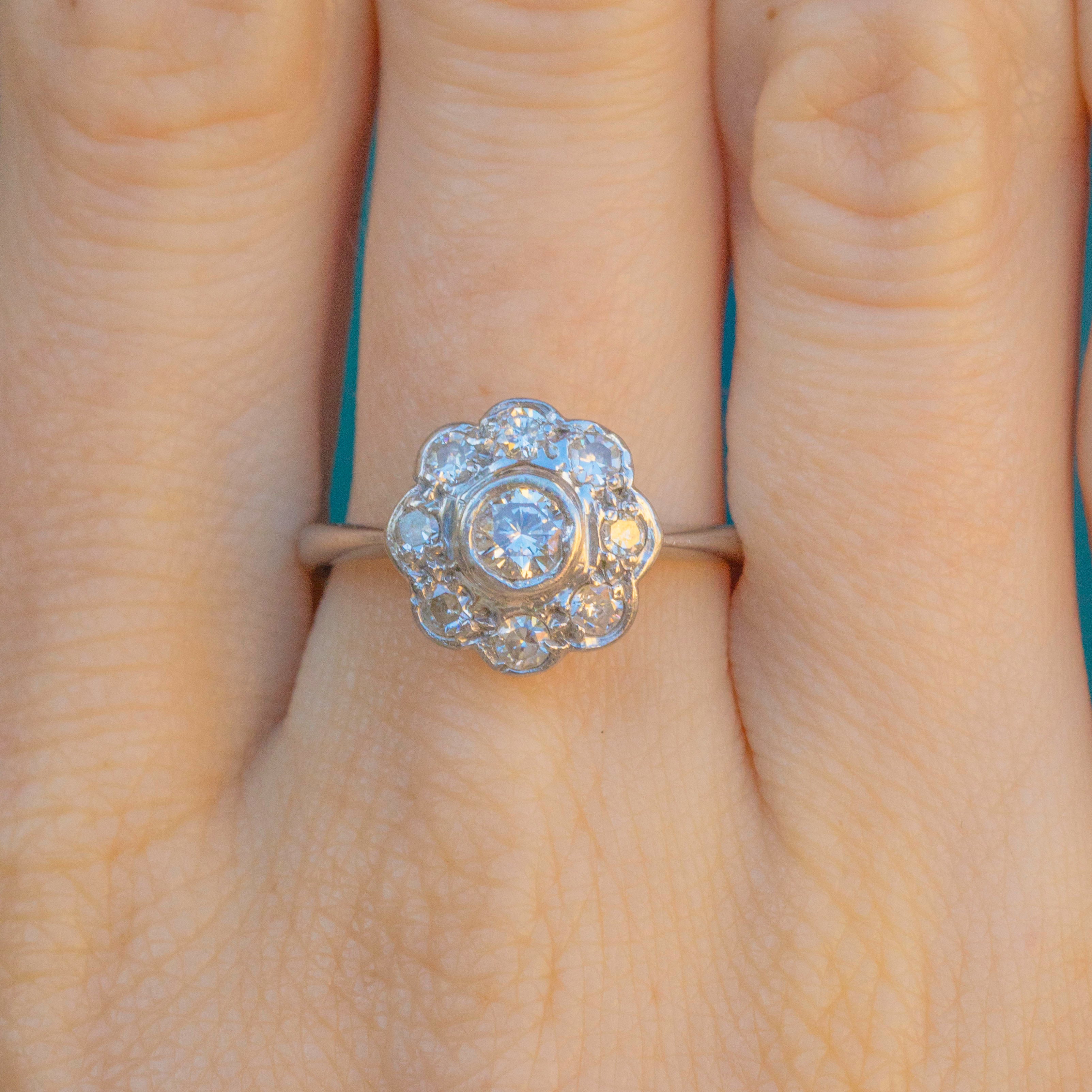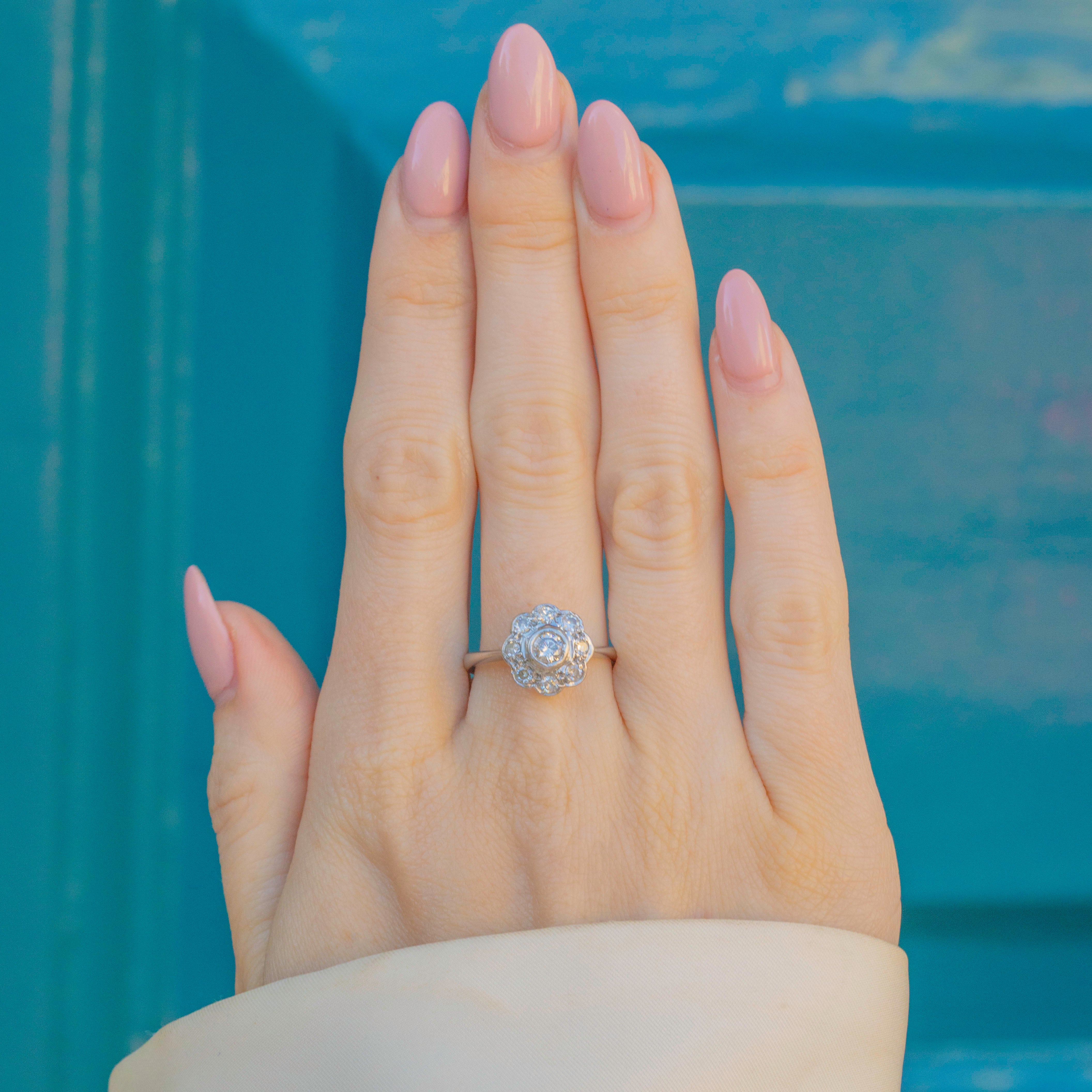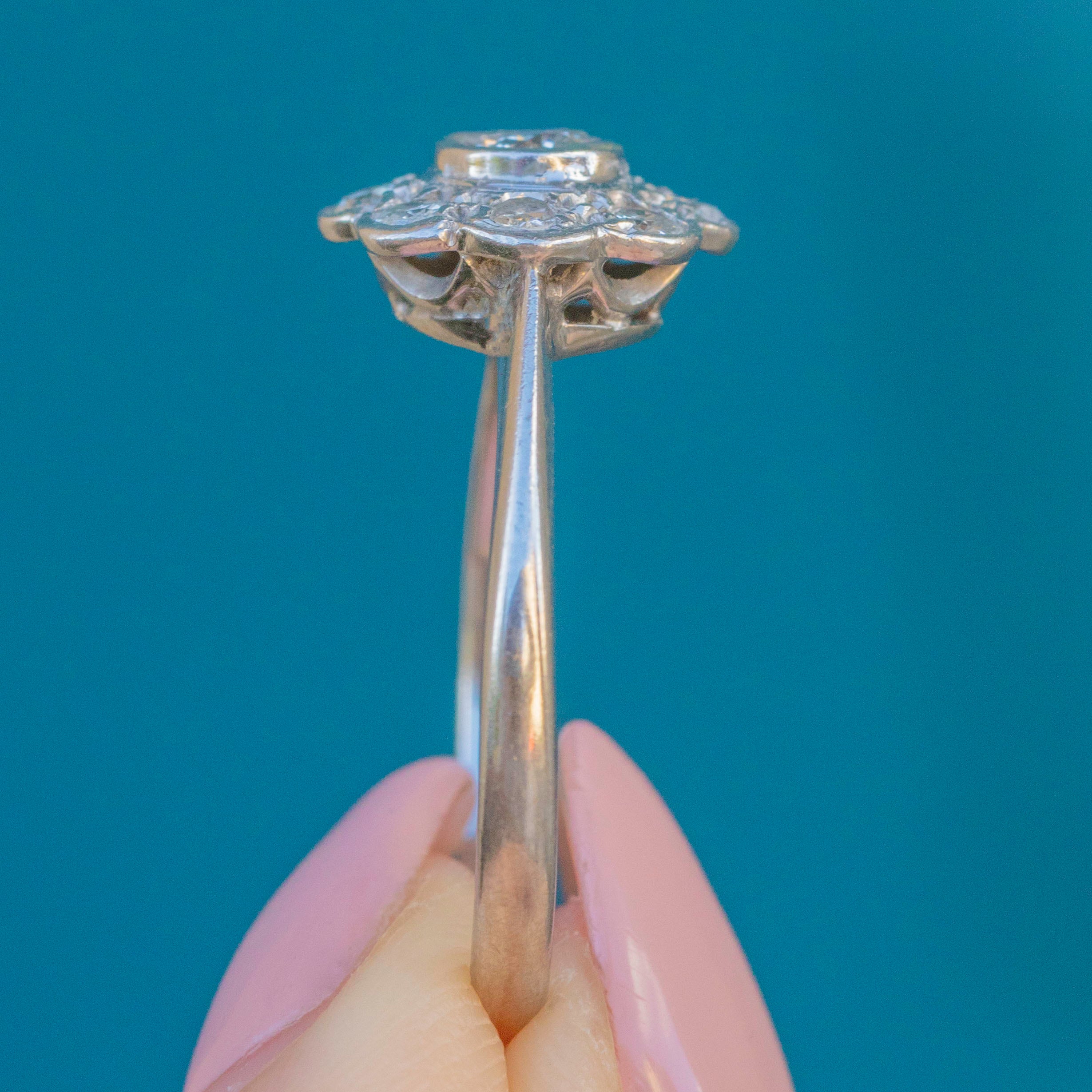 Crafted from the most luxurious 18ct White Gold, she is slender and lightweight, making her so easy to wear. With nine scintillating Diamonds making up the floral cluster, this ravishing Mid-Century vintage ring would make a fine choice for an engagement ring.