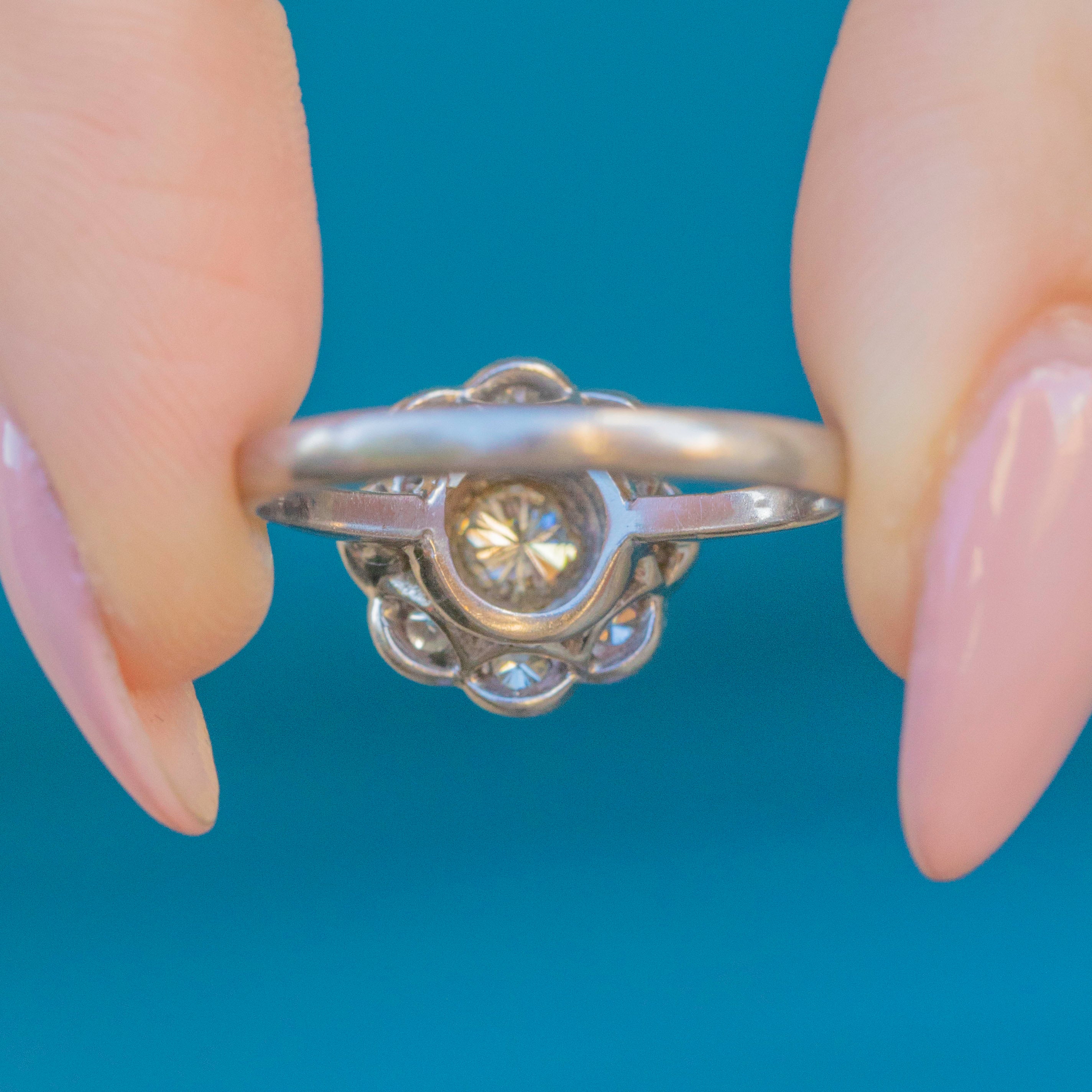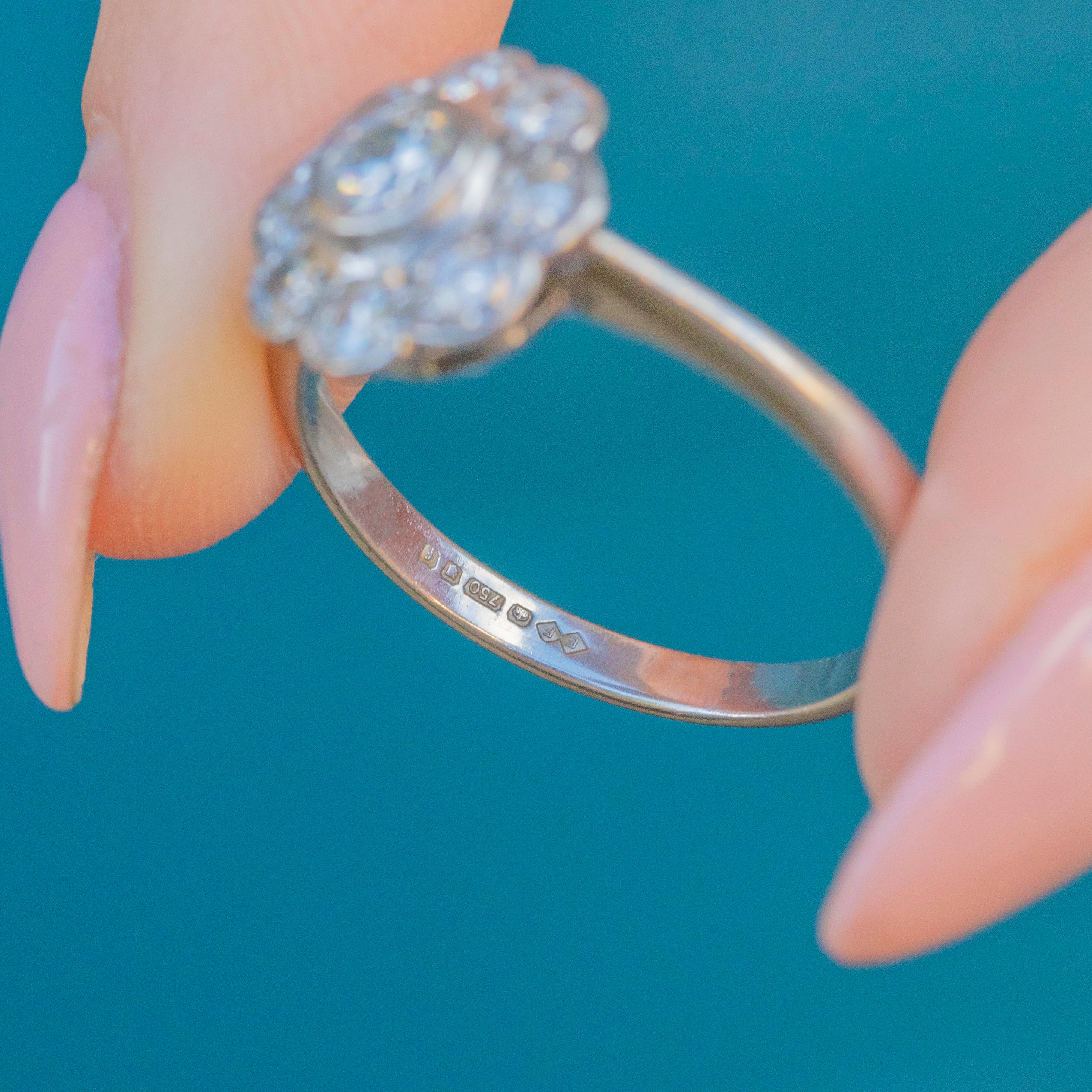 VERY GOOD-EXCELLENT. This 18ct White Gold Diamond daisy cluster ring is in wonderful condition. Each Diamond is securely set and free from damage, possessing a brilliantly bright sparkle to delight its wearer. Her 18ct White Gold shank is also in glorious condition, free from dings, dents or scratches. There is some evidence of resizing in the past, however this is not visible during wear. A distinctly feminine beauty to add to your collection!