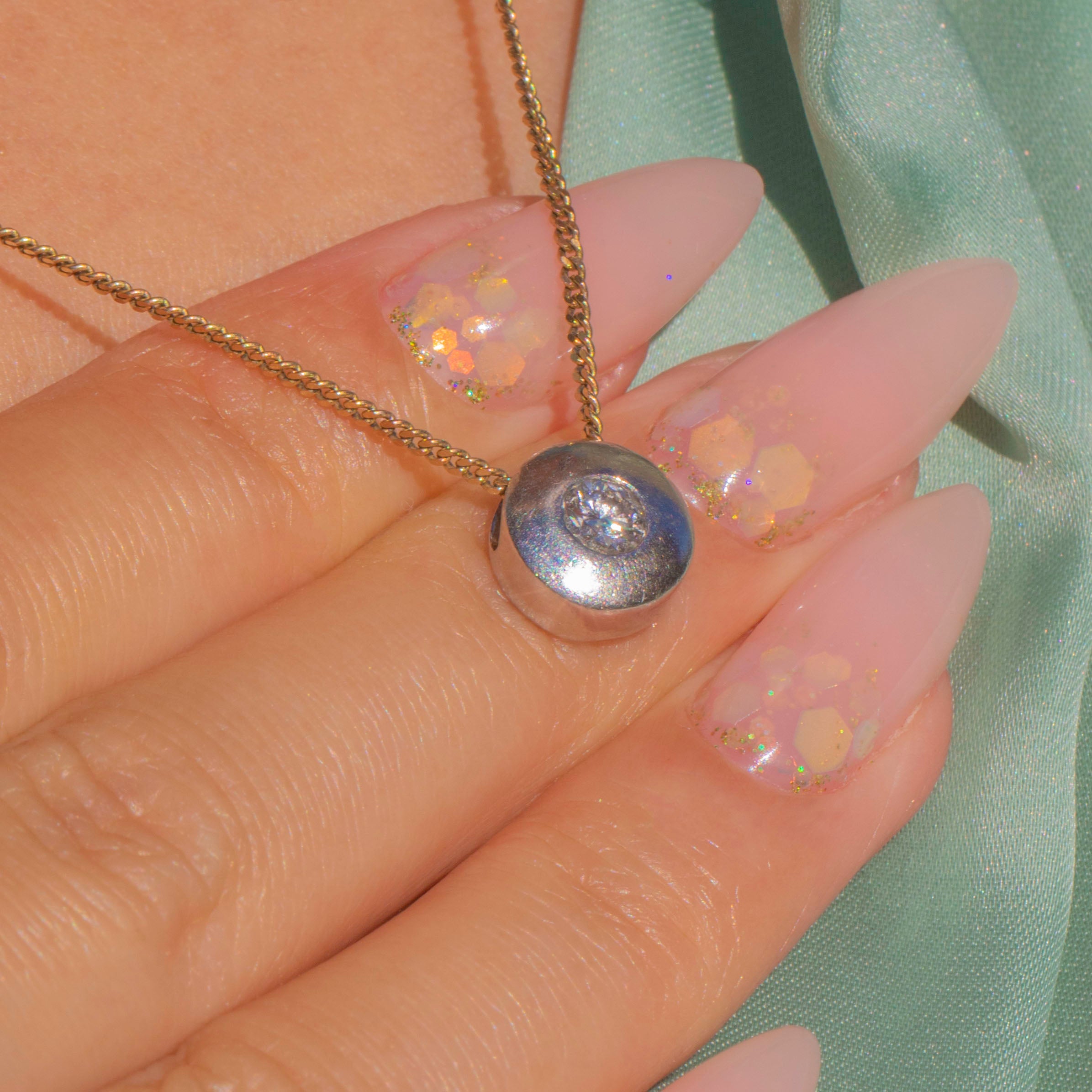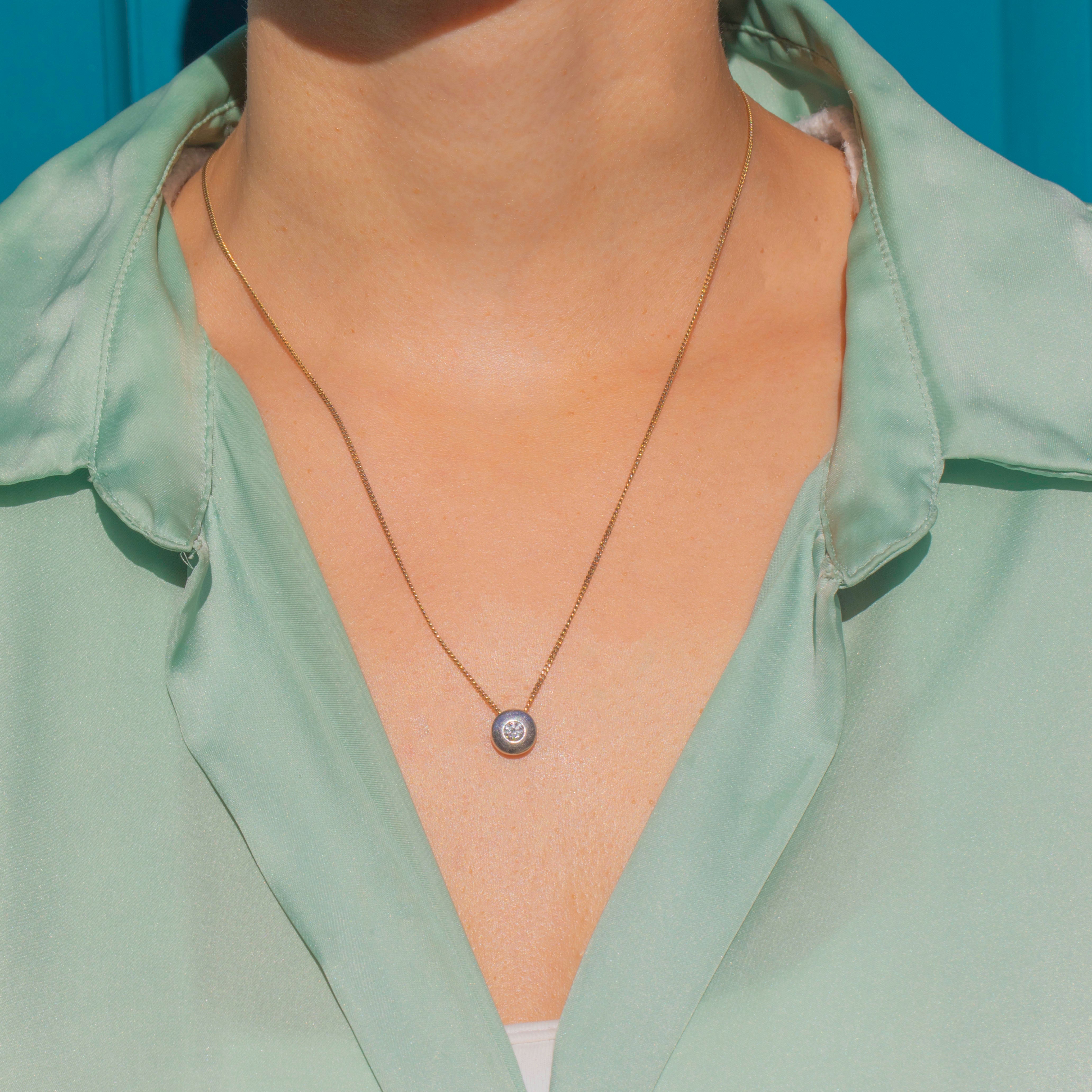 Sleek and wearable, this Vintage Diamond slider is crafted in 18ct White Gold with a minimalist, modern look. The softly domed form is gypsy-set with a bright round brilliant-cut Diamond that sits flush to the surface, giving a clean sparkle that works with everything.