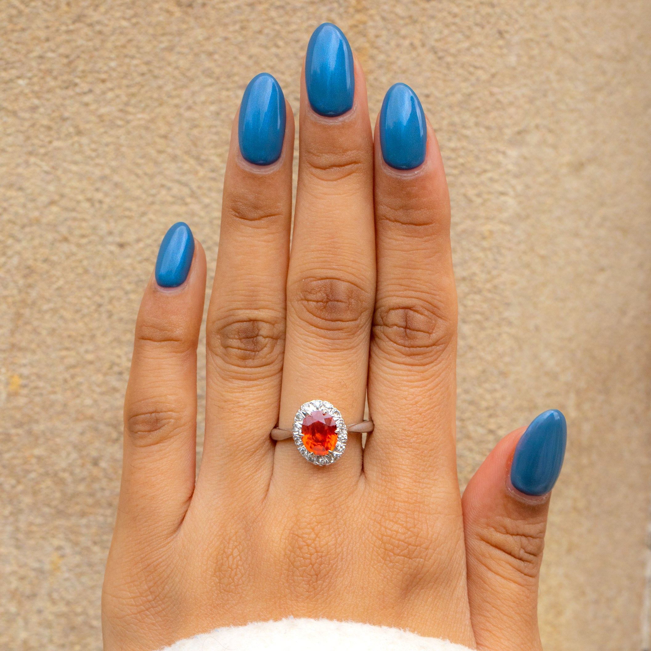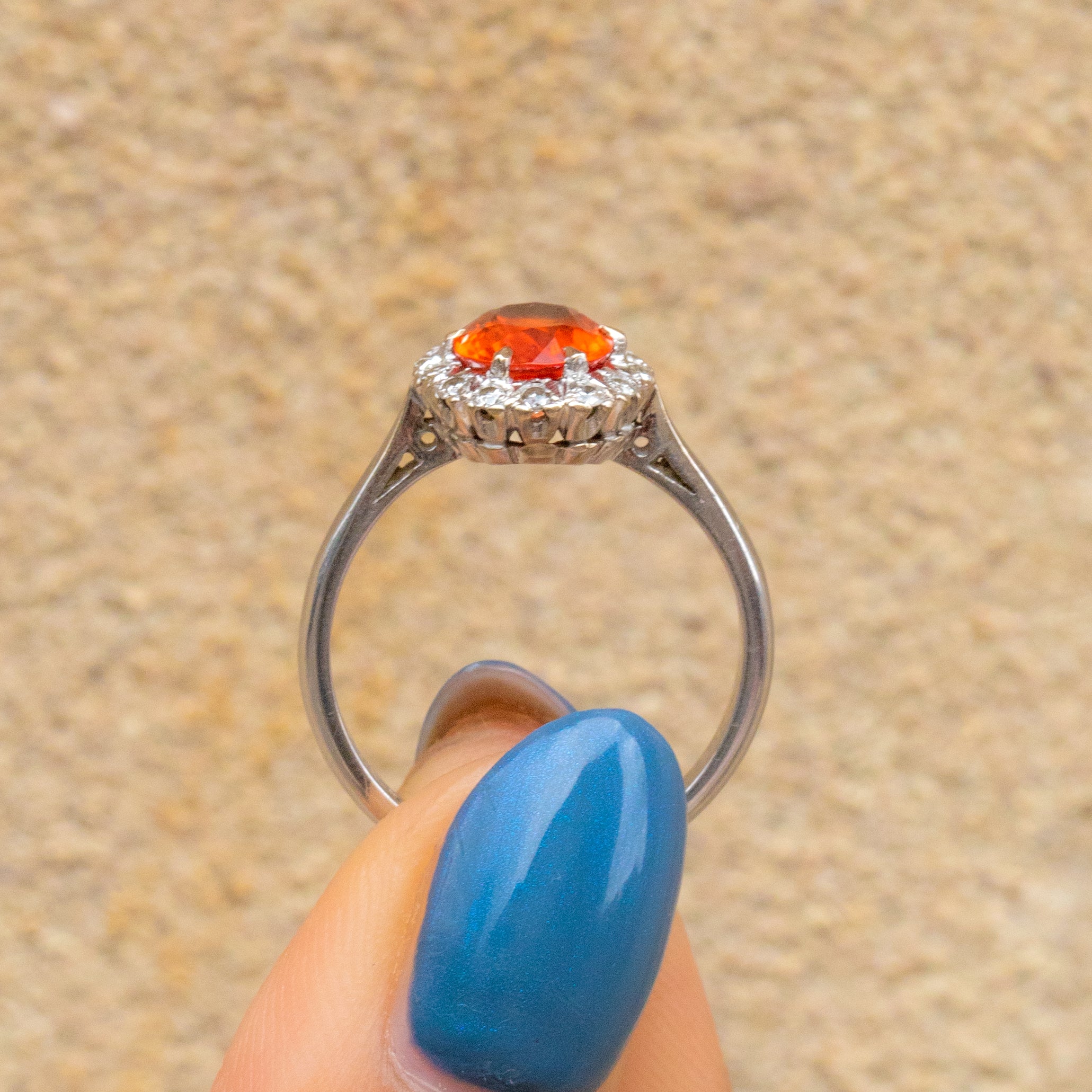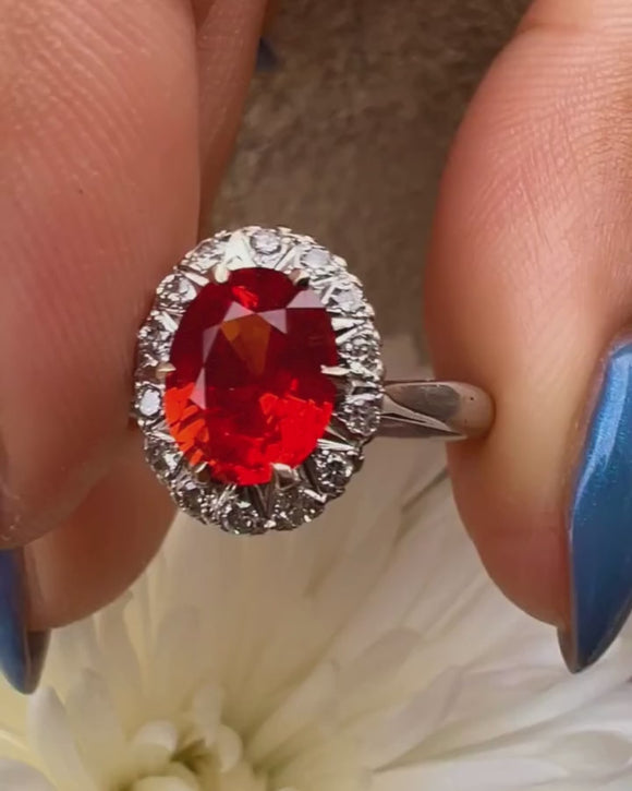 This exquisite 18ct White Gold Fire Opal Diamond cluster ring boasts a mesmerising 0.94ct Fire Opal, emitting a fiery spectrum of colours that dance with every movement. The Fire Opal, with its captivating play of reds and oranges, is a symbol of passion and vitality. Intricately set in a cluster formation, 14 scintillating Diamonds halo the Opal enhancing the opulence of this timeless vintage ring.