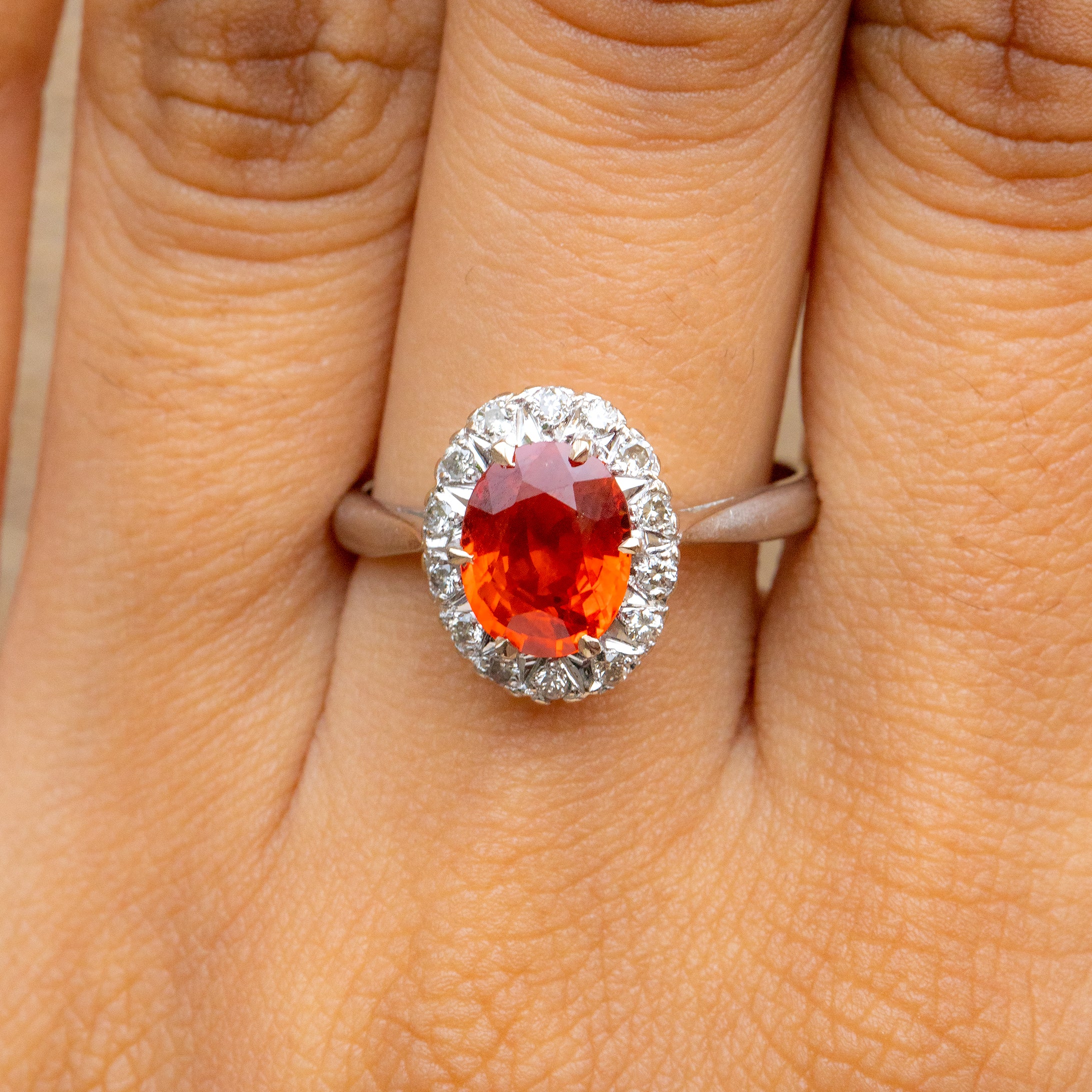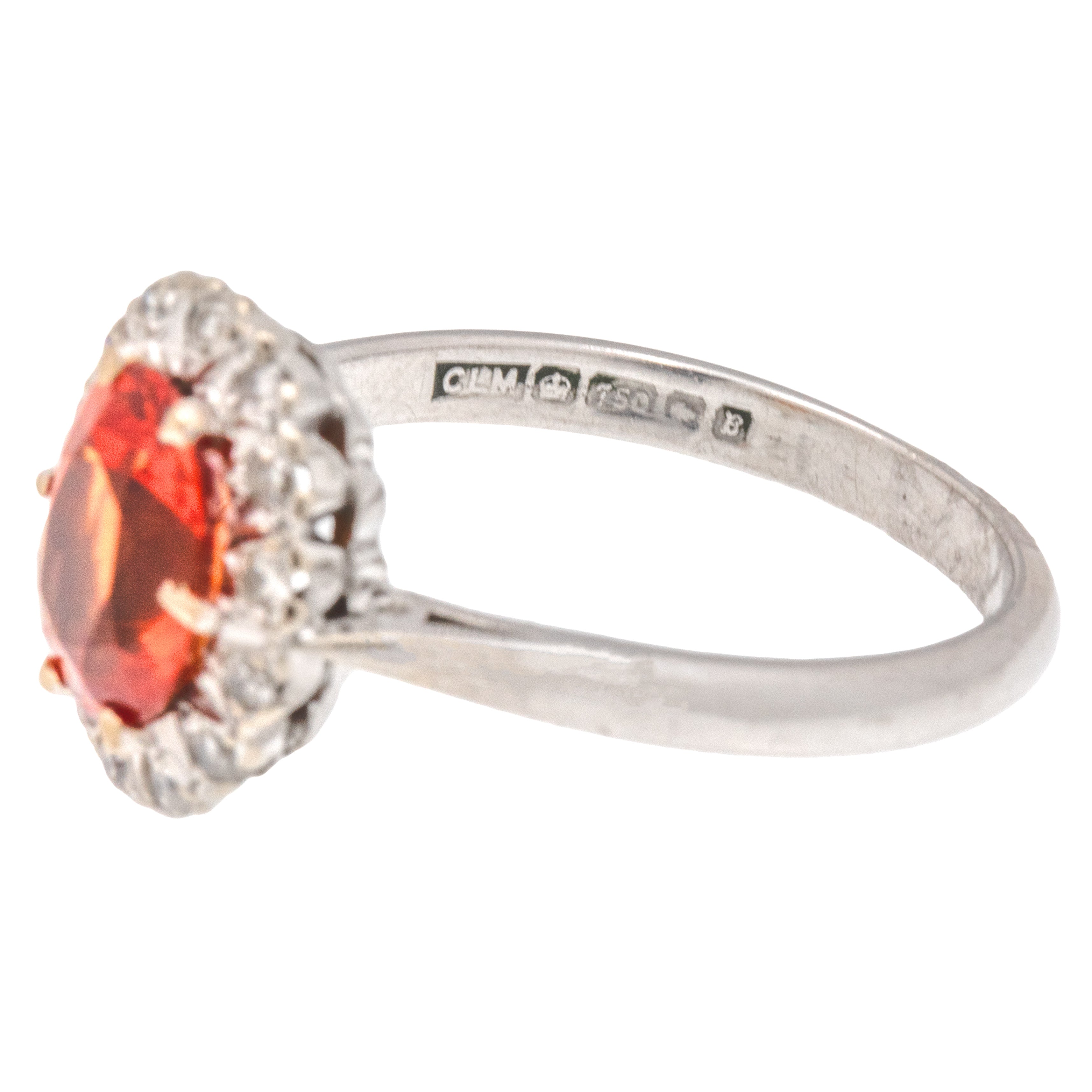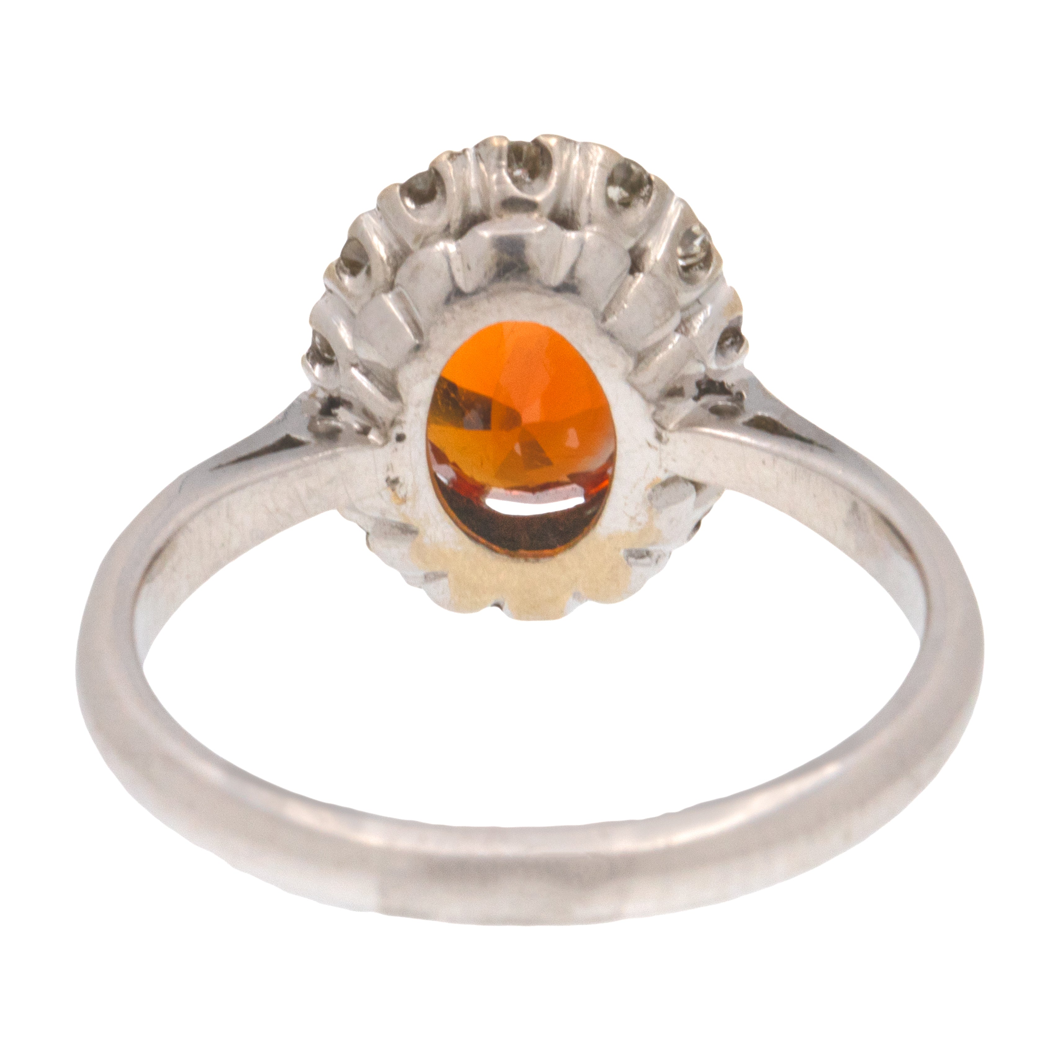 EXCELLENT. This 18ct White Gold Fire Opal Diamond cluster ring is in excellent condition. The Opal is vivid with a crisp set of facets and the Diamonds are bright, all of the gemstones are securely set and free from any signs of wear. The band has retained its form well and is robust, promising you many more years of wear and enjoyment!