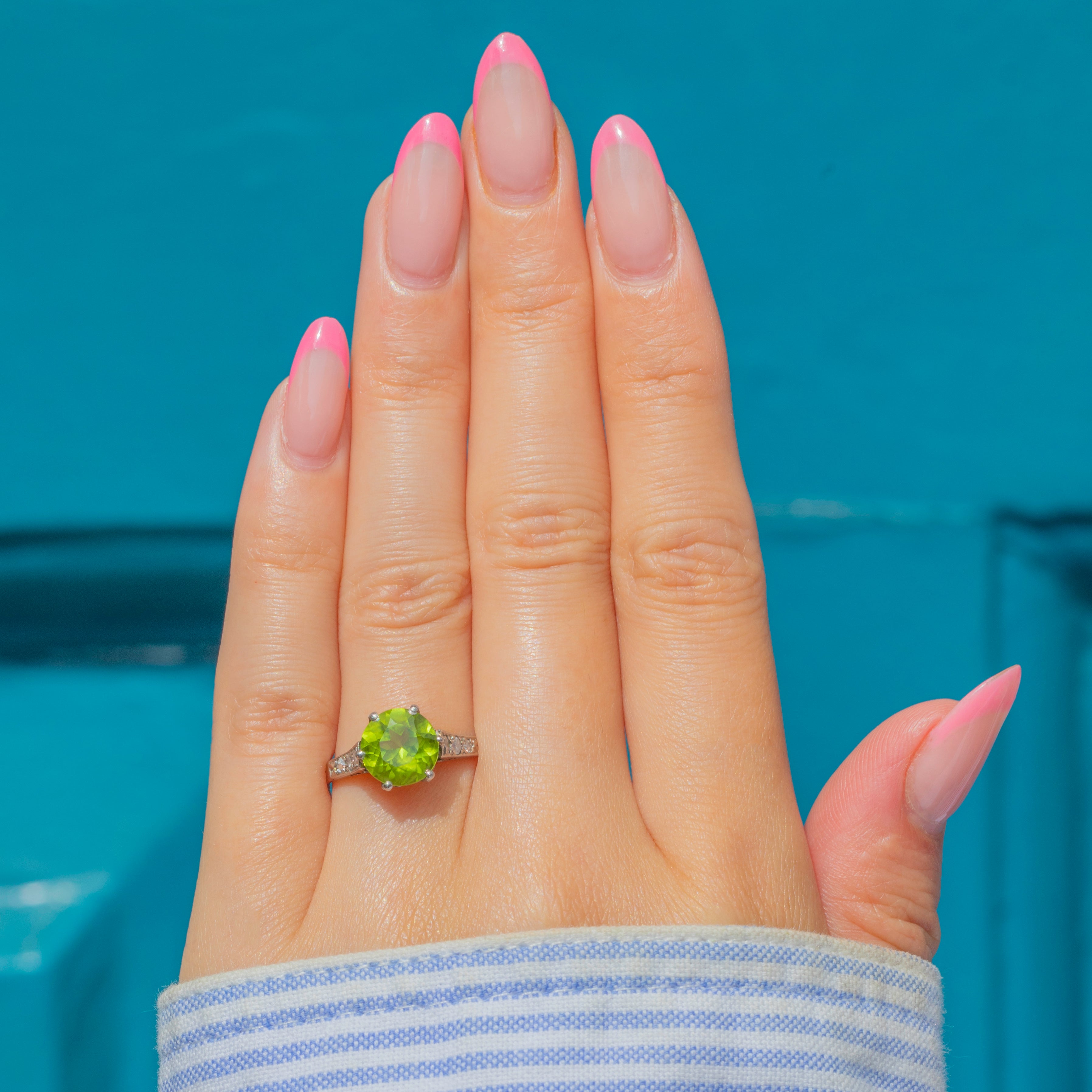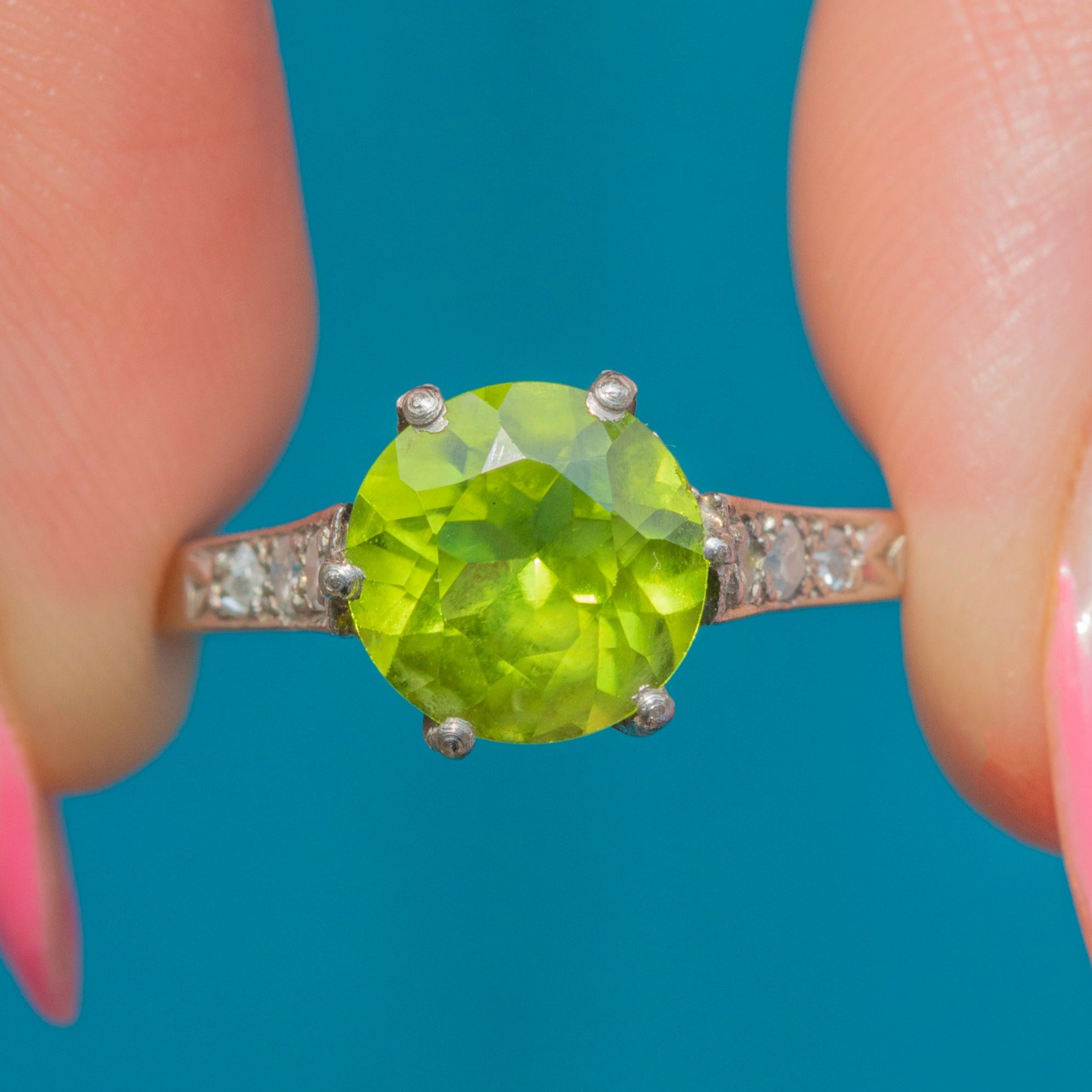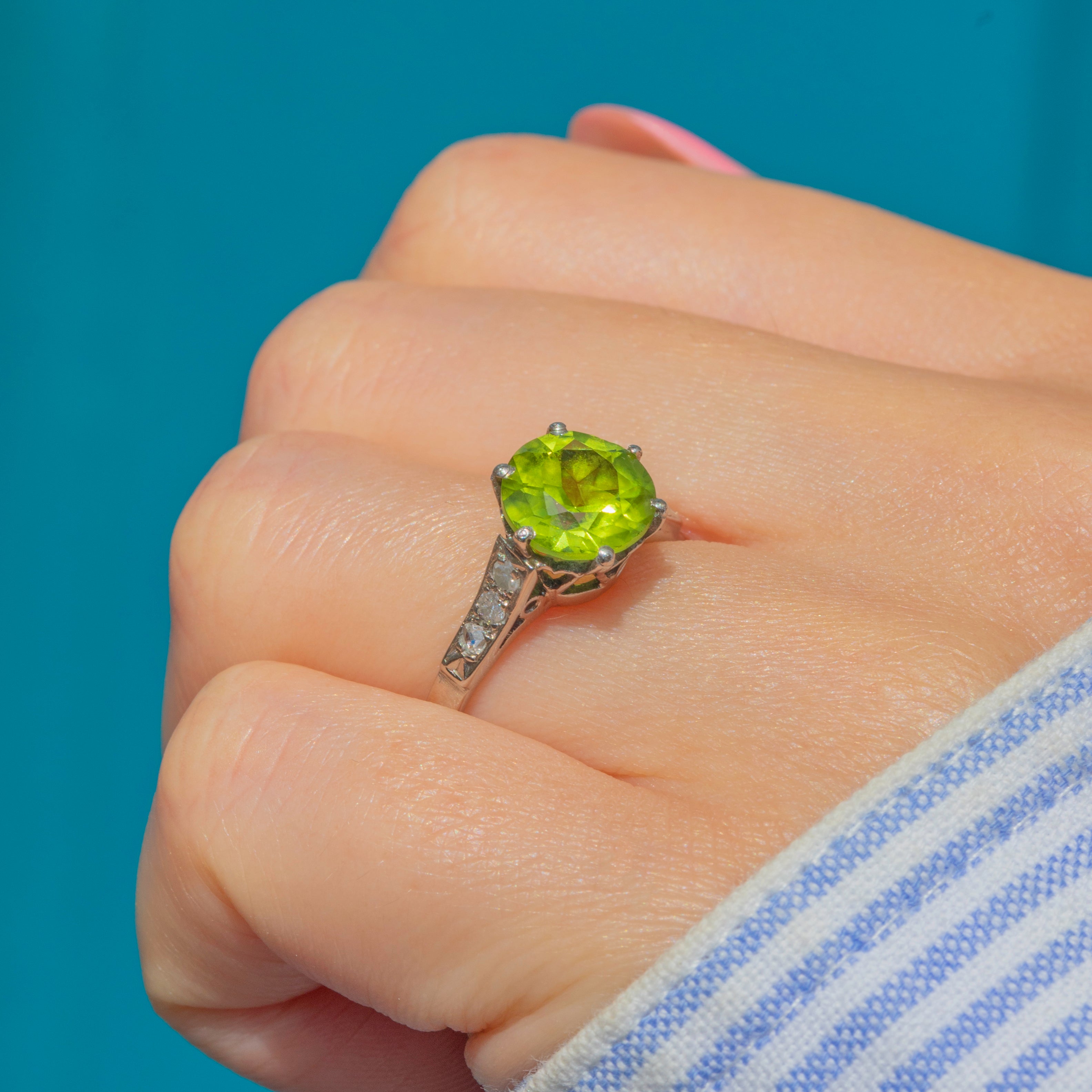 This exquisite vintage Peridot Diamond ring will make a timeless addition to your collection! Featuring a captivating 2.14ct Peridot, radiating a mesmerising lime-green hue, flanked by Diamond-encrusted shoulders.