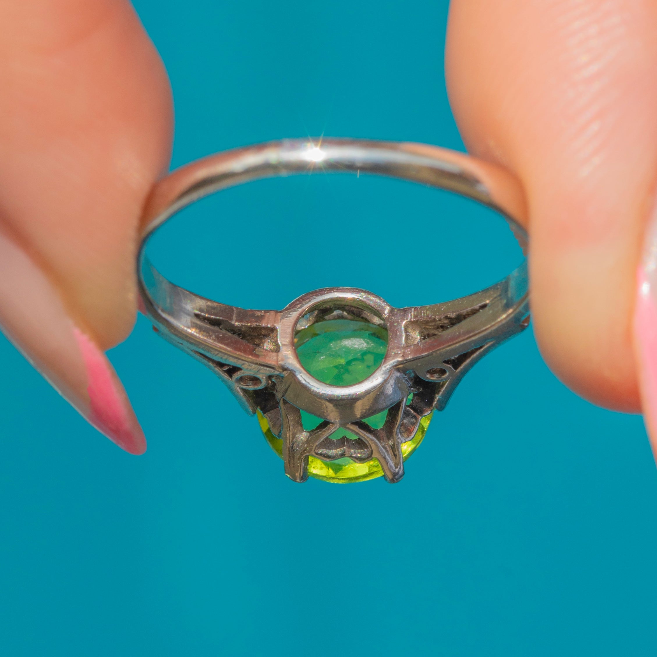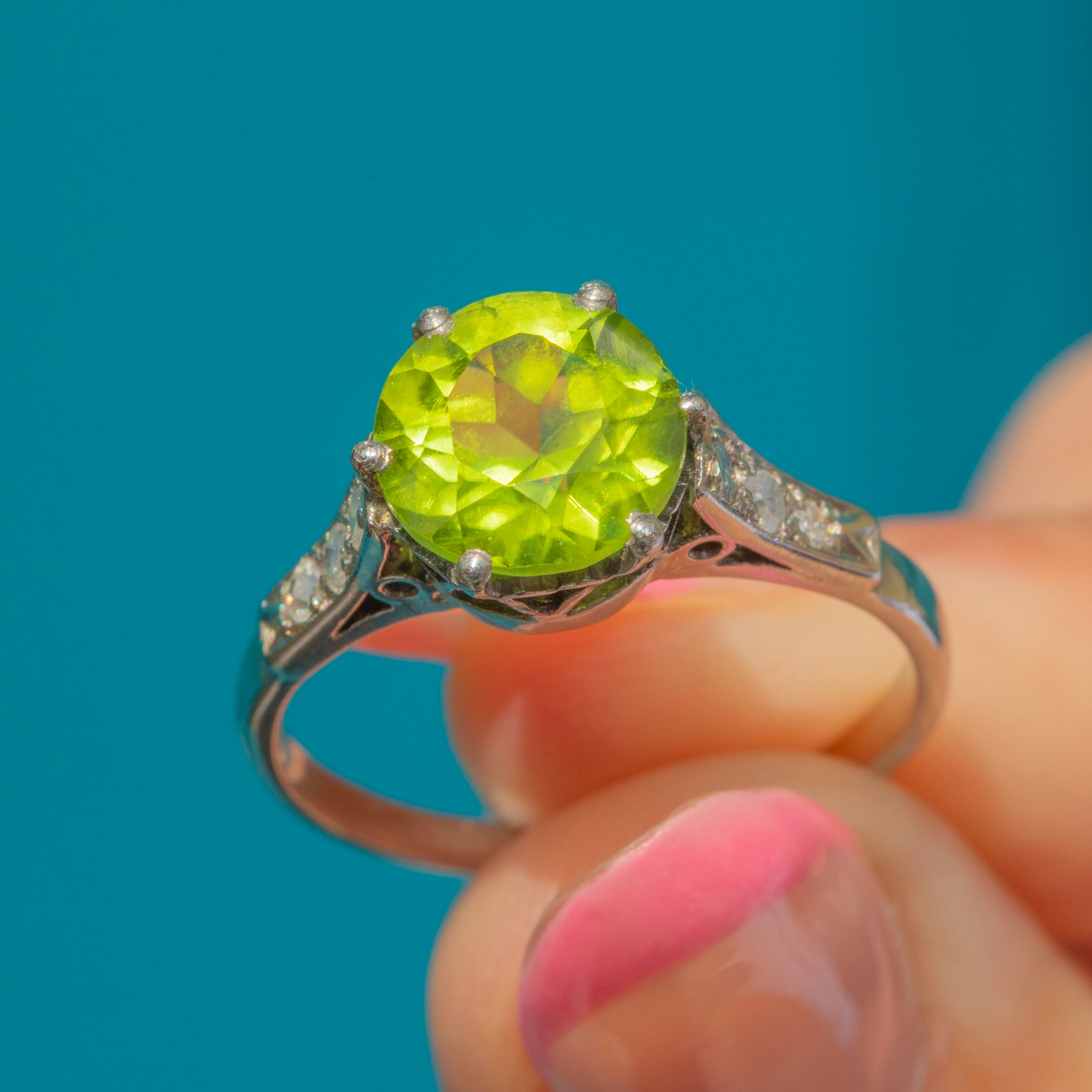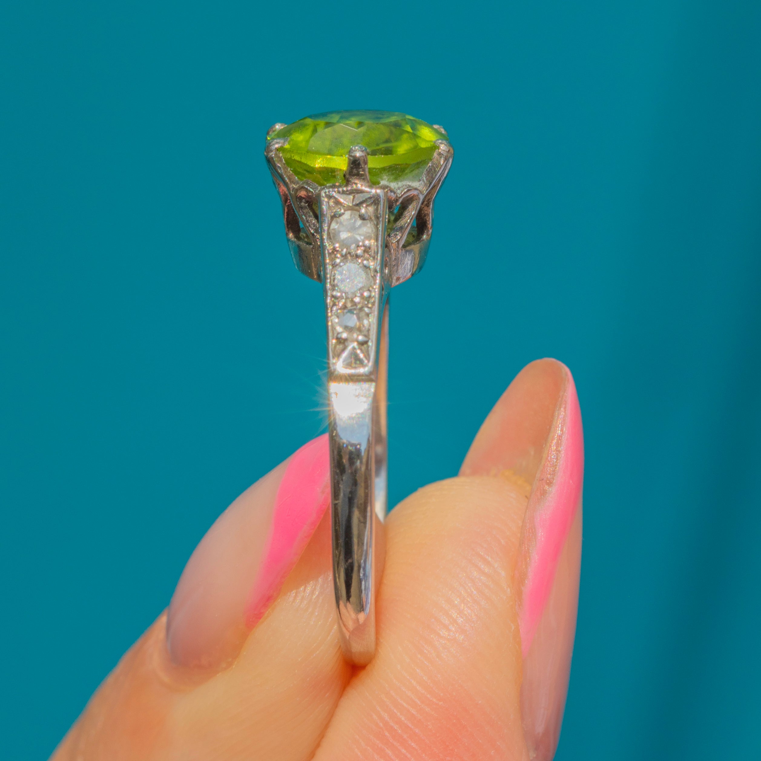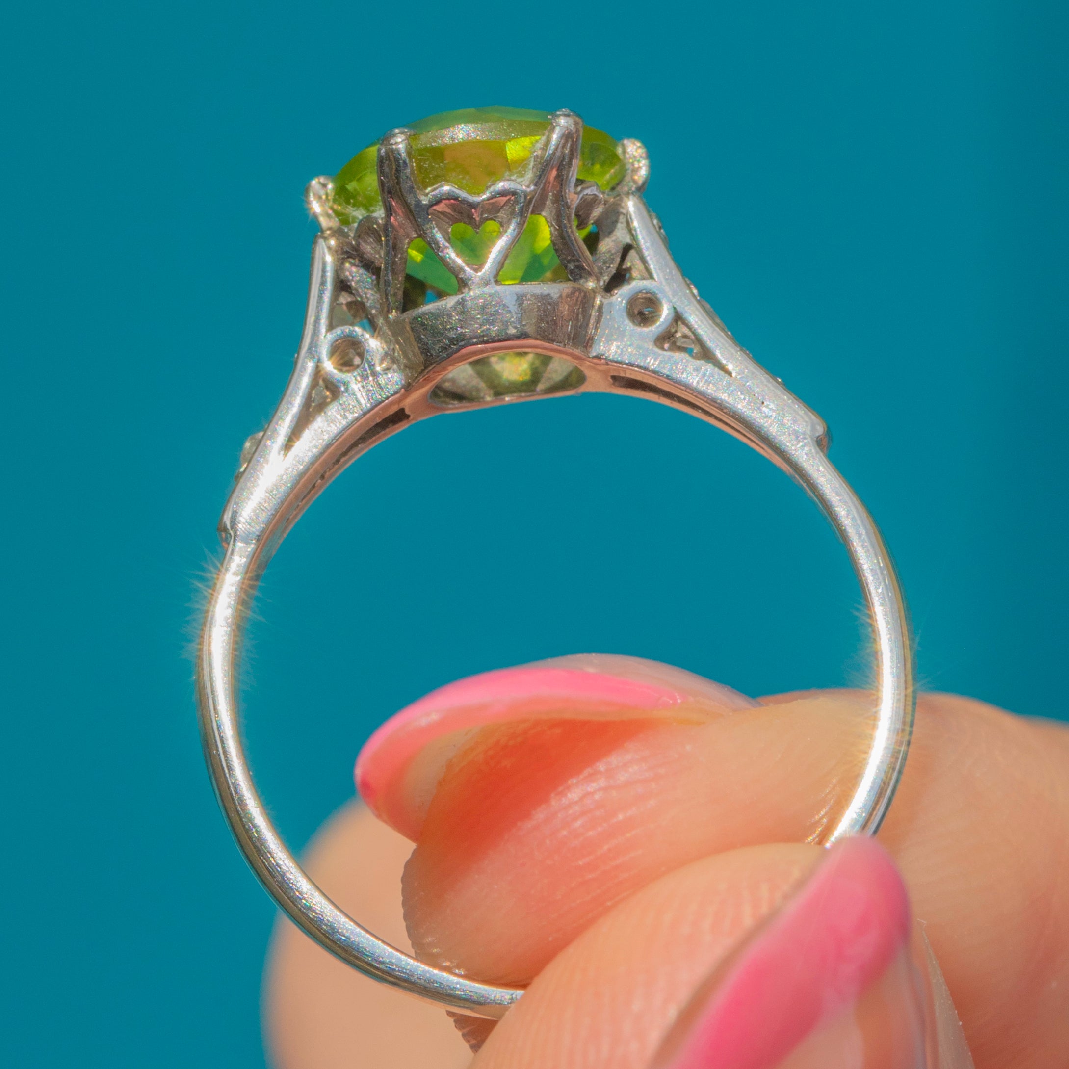 Every millimetre of this vintage ring has been carefully considered, with the high profile boasting little heart details allowing the light to stream through the Peridot from every direction. Crafted from solid 18ct White Gold and providing excellent finger coverage, this Peridot Diamond ring will bring years of wearing pleasure!