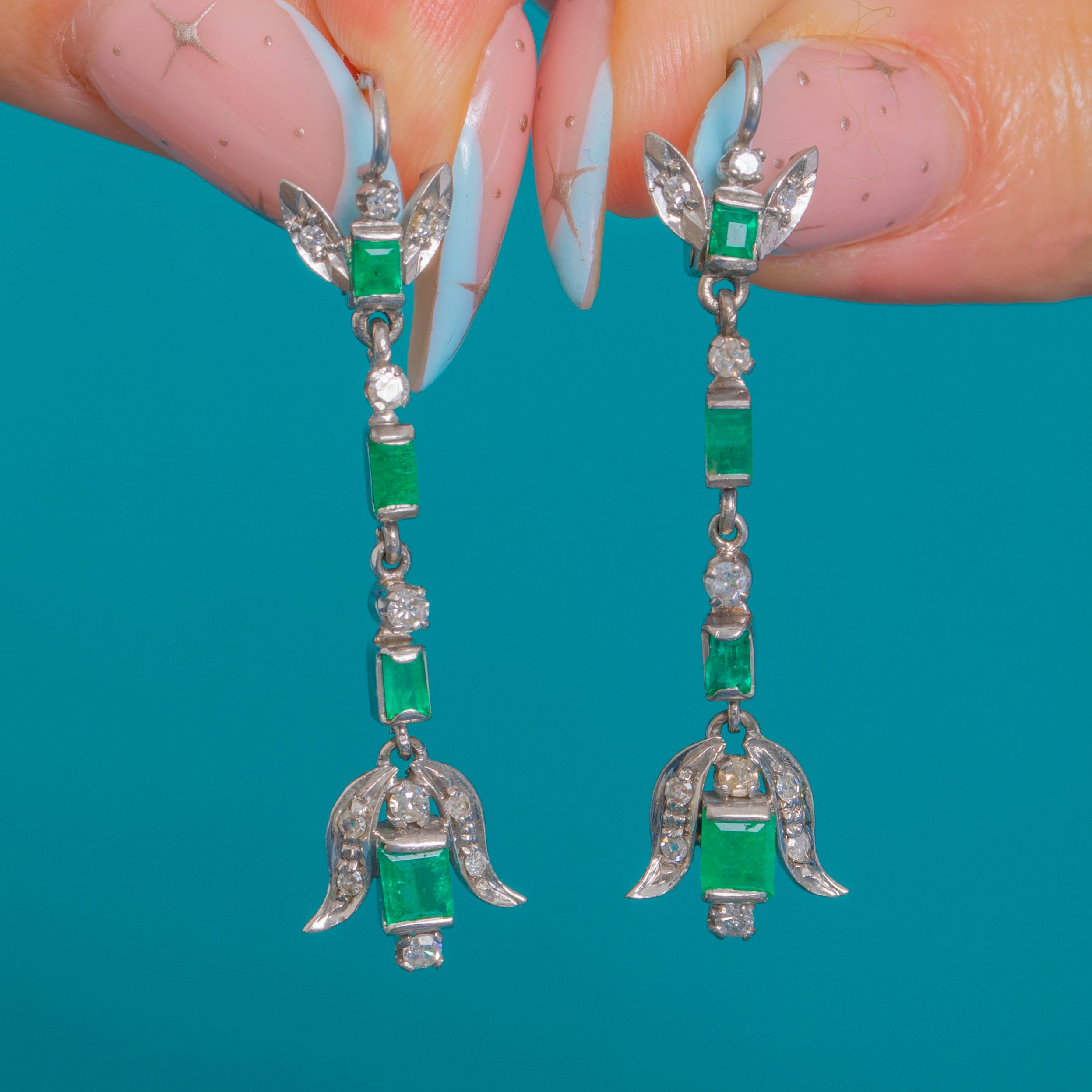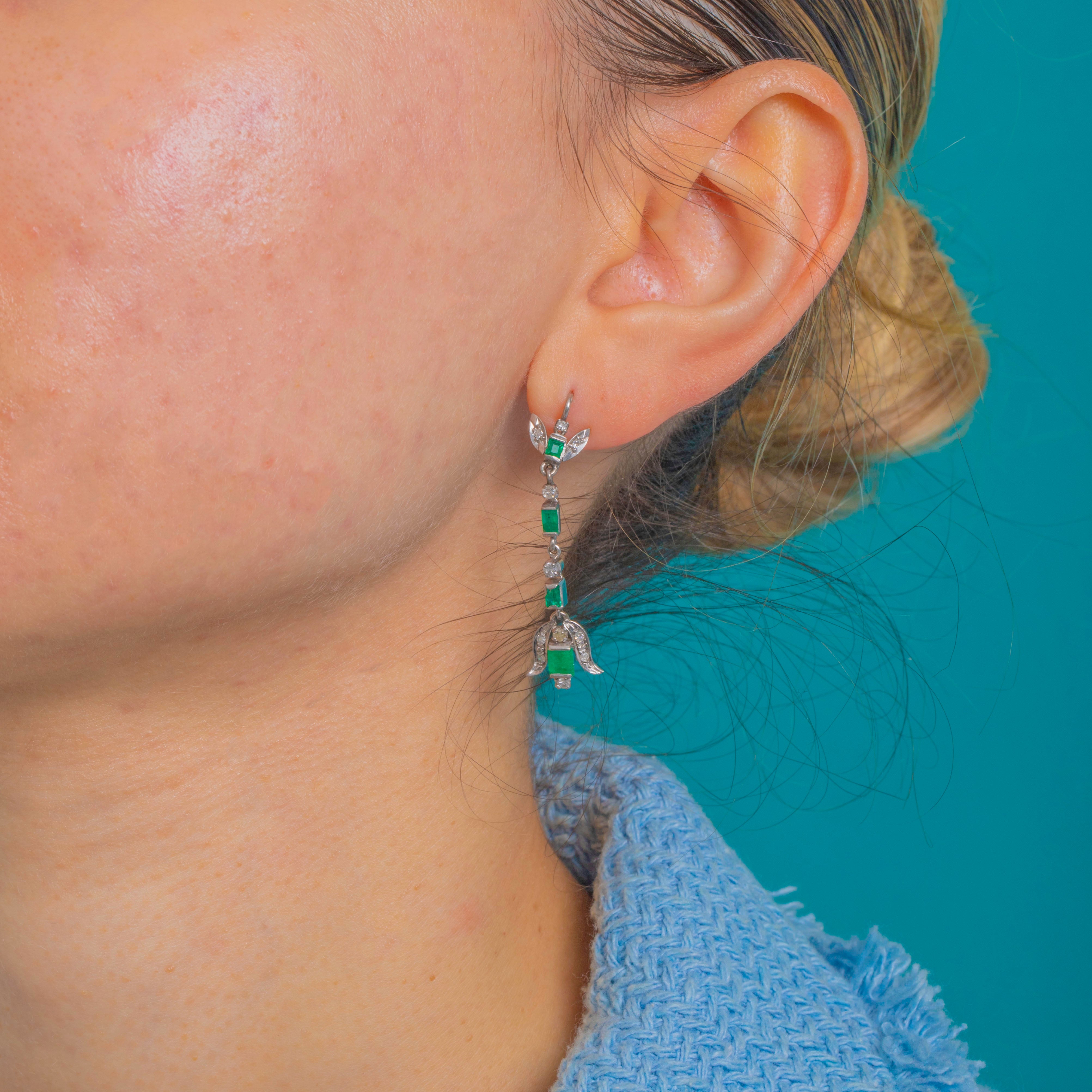 Sleek, elongated and irresistibly Deco, these articulated drop earrings marry crisp geometry with delicate foliate flourishes. Crafted in 18ct White Gold with Platinum settings, a vertical line of step-cut Emeralds is punctuated by glittering Diamond spacers, flowing into a stylised bow/leaf motif finely edged with milgrain.