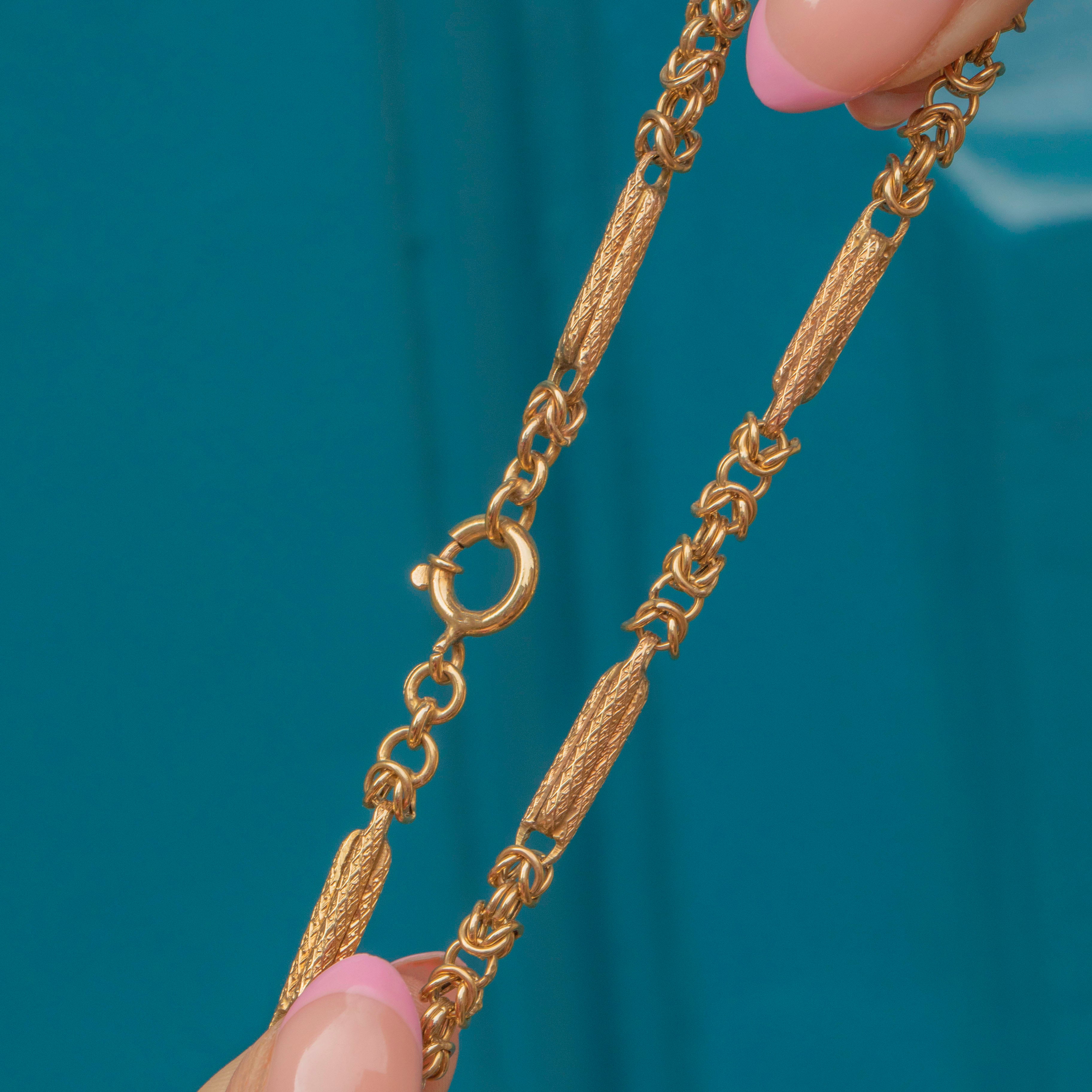 This fine antique solid Gold chain is an impressive 19.3 grams and secured with a classic and rather chunky bolt-ring clasp- ensuring that the chain and any charms or pendants are held securely.