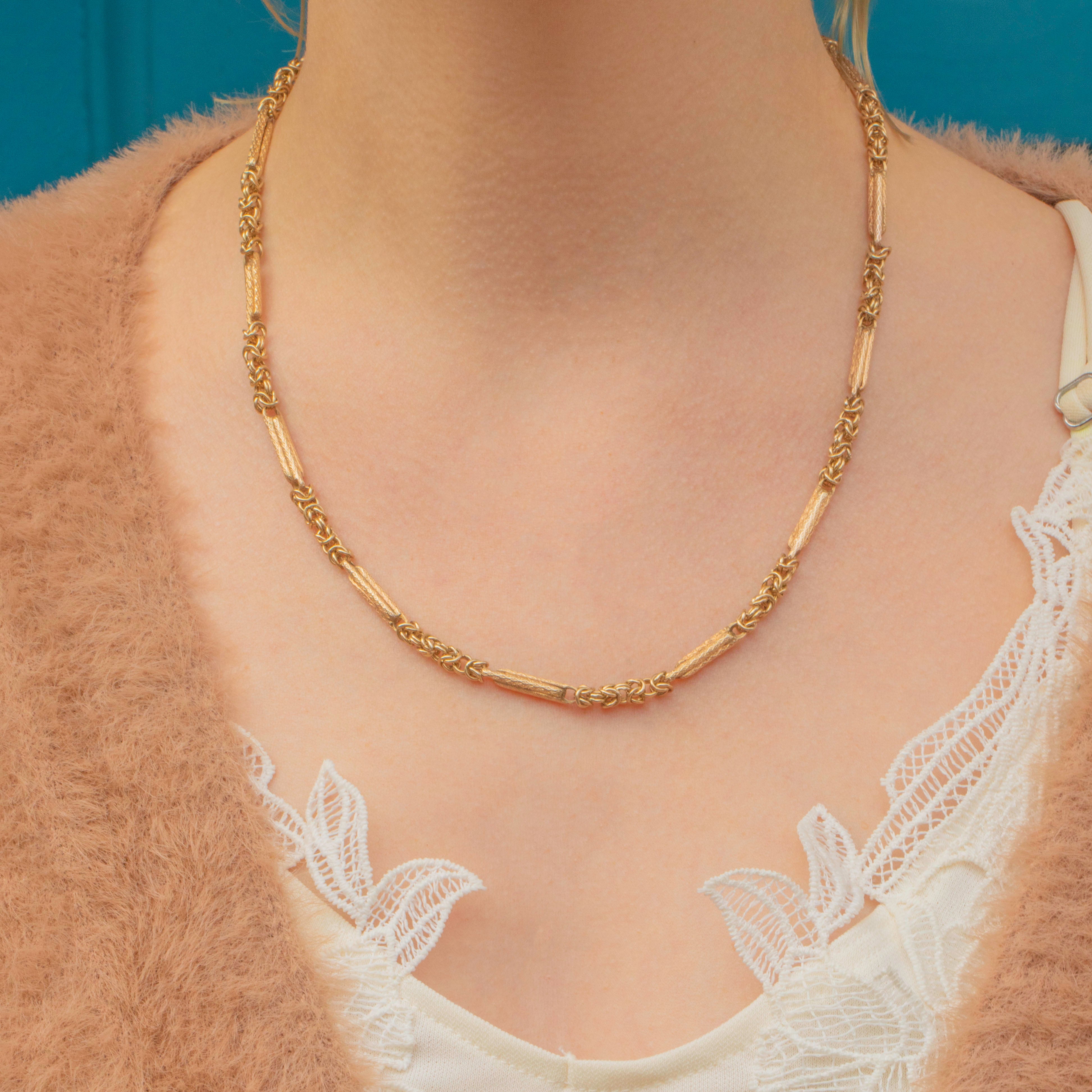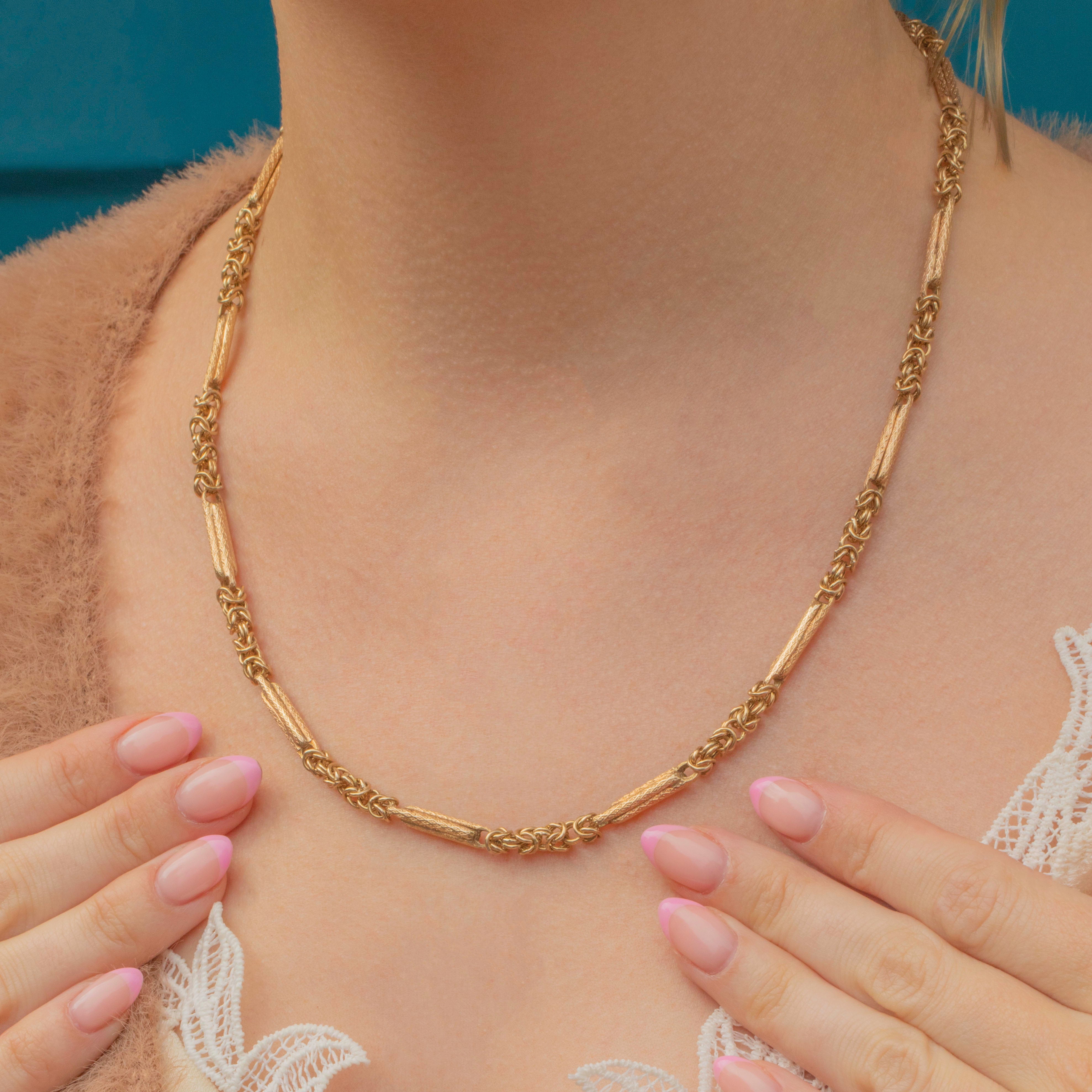 This exquisite antique 9ct Gold fancy link chain features smooth and densely textured Byzantine-style links interspersed with buttery and bright knotted links with a generous 19.5" drape! The lozenge-shaped links are carefully interwoven, creating a textured and elegant design.