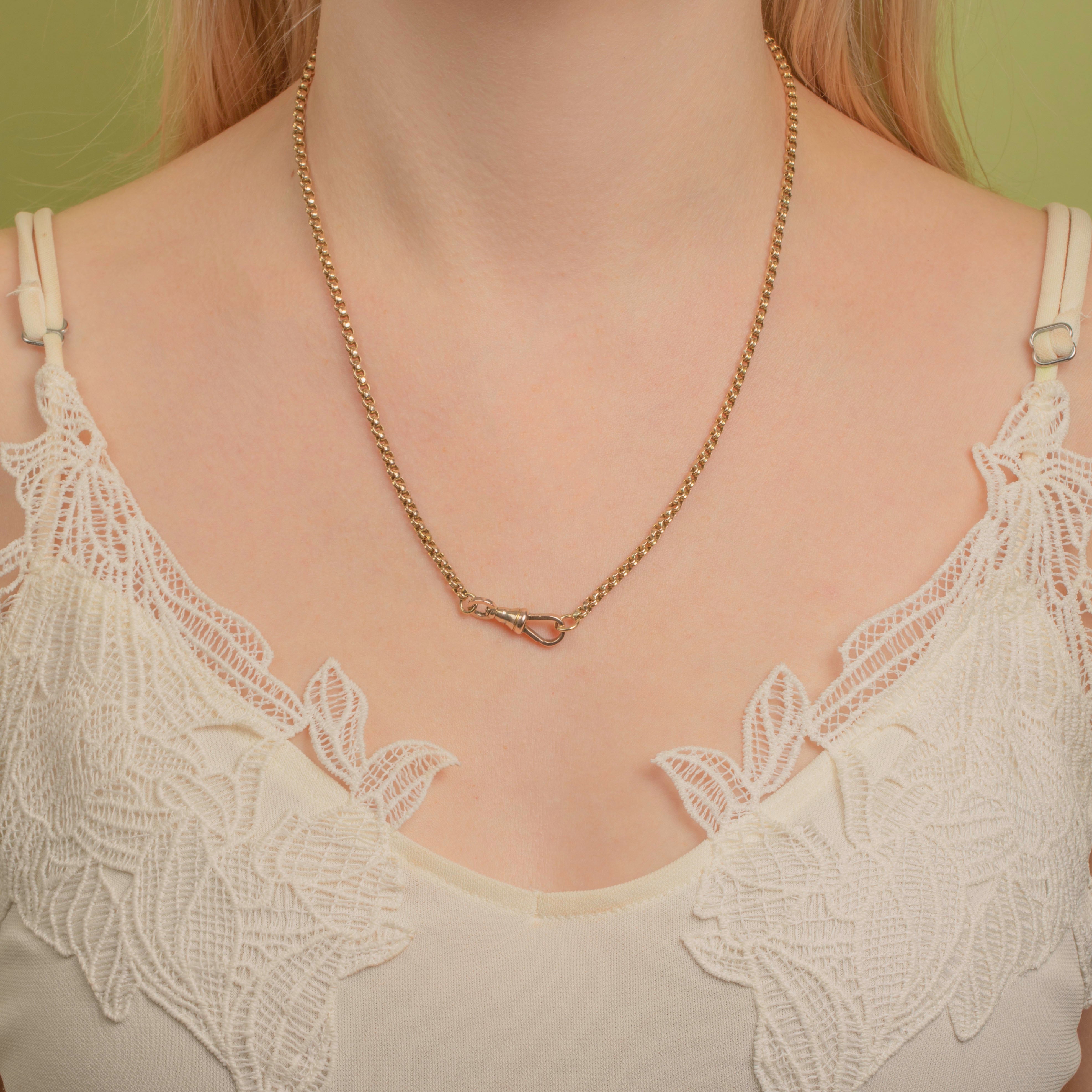 This Victorian Gold chain is formed of faceted belcher links on one side, and belcher links with a groove running down the middle on the other, taking a unique twist on the classic belcher. Complete with an antique dog-clip, she will hold all your favourite charms and pendants safely; you can wear them night and day without a care in the world!