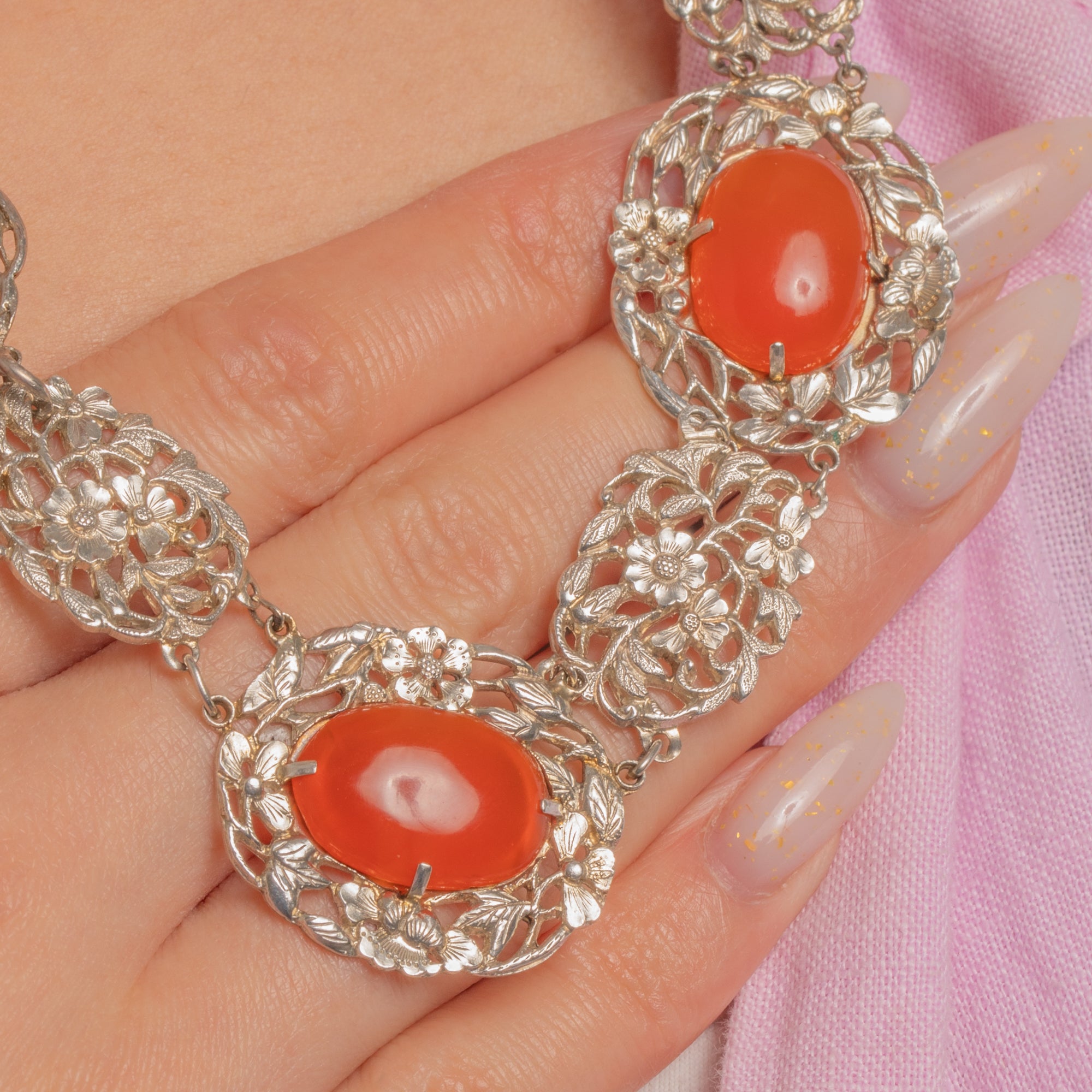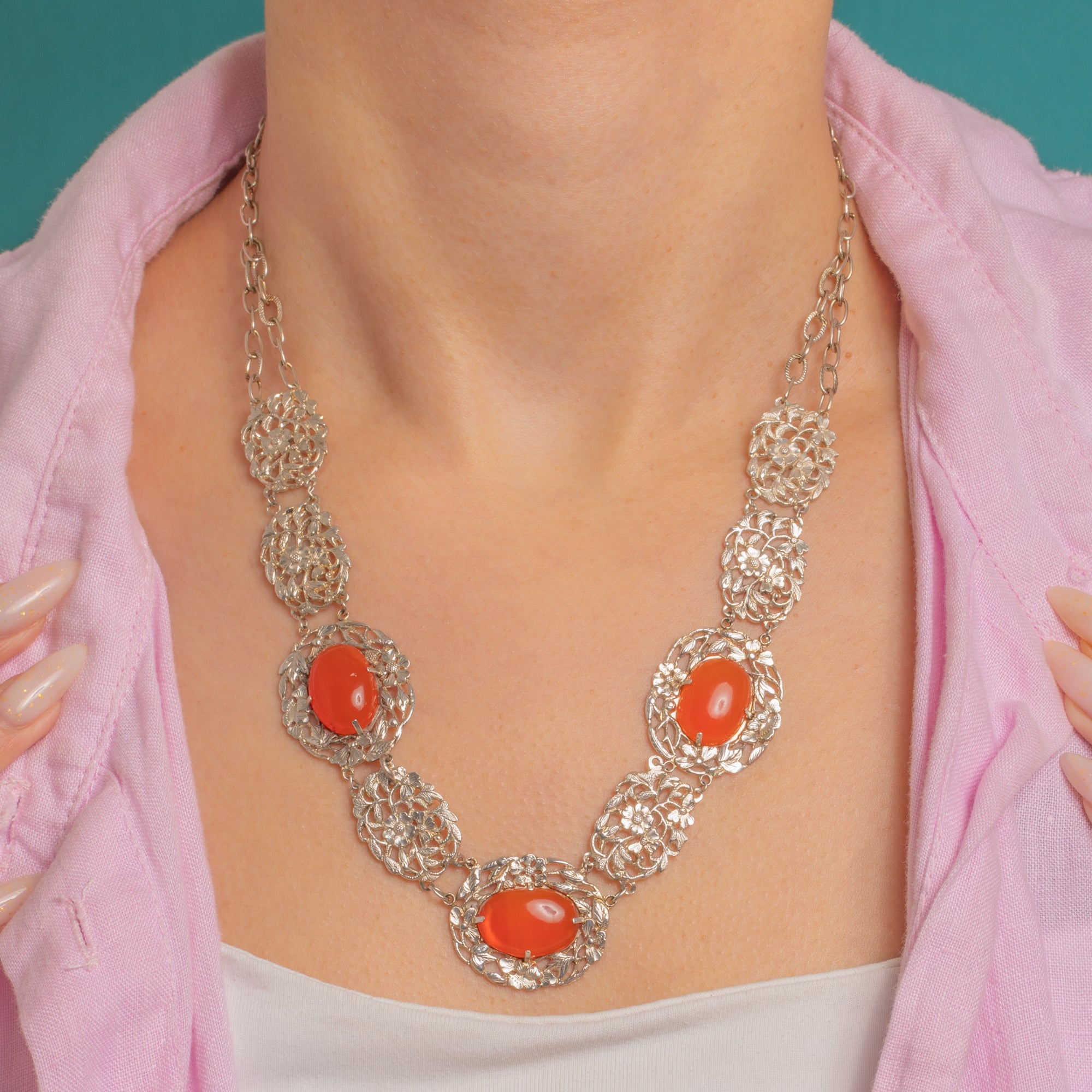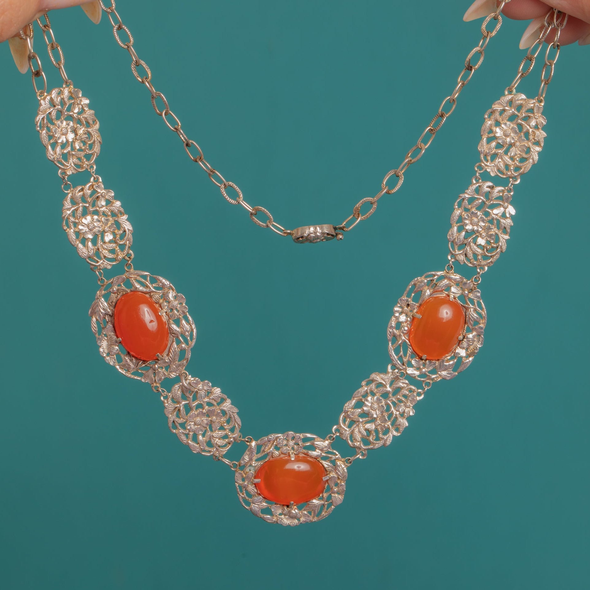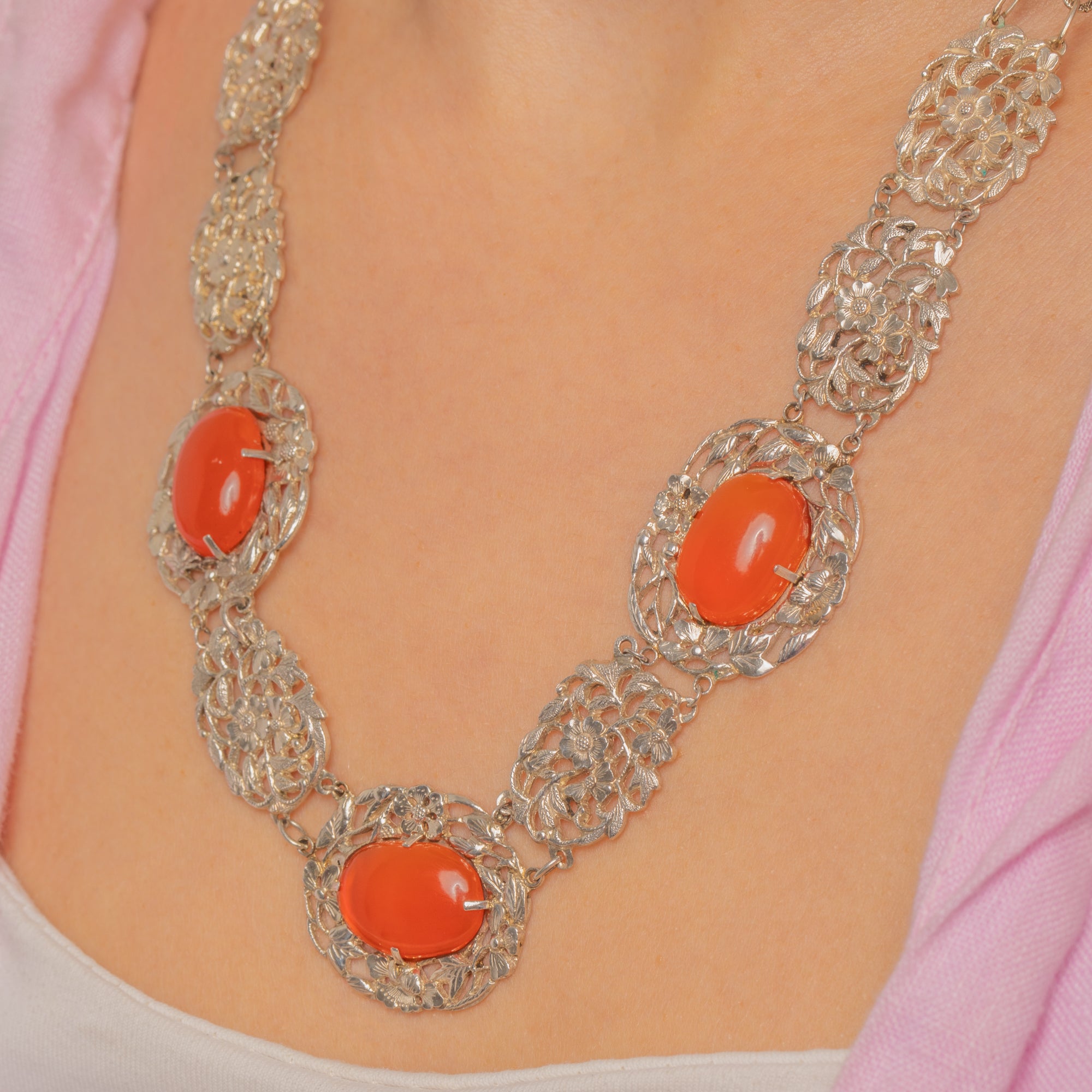 Radiant Carnelian cabochons glow against intricate Silver openwork in this Chinese Art Deco necklace. Alternating floral plaques and oval stations create a lace-like rhythm, the domed orange to orange-red Carnelians bringing a warm, luminous contrast to the cool-toned metal.