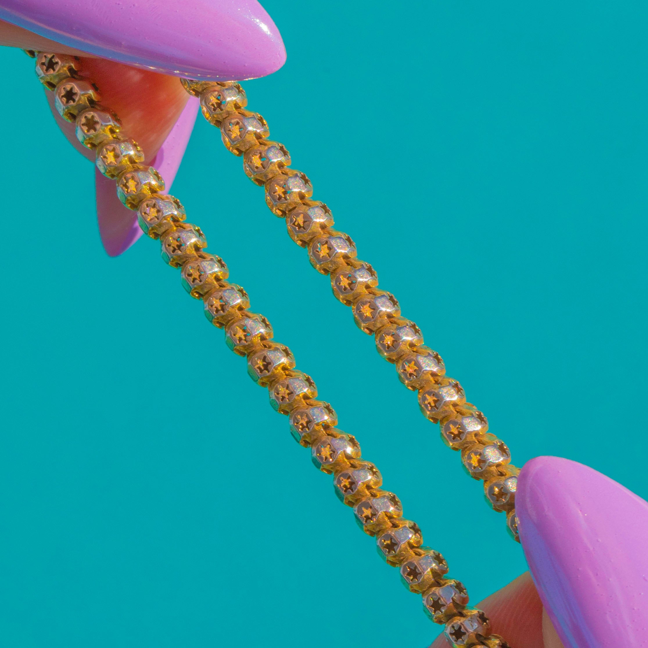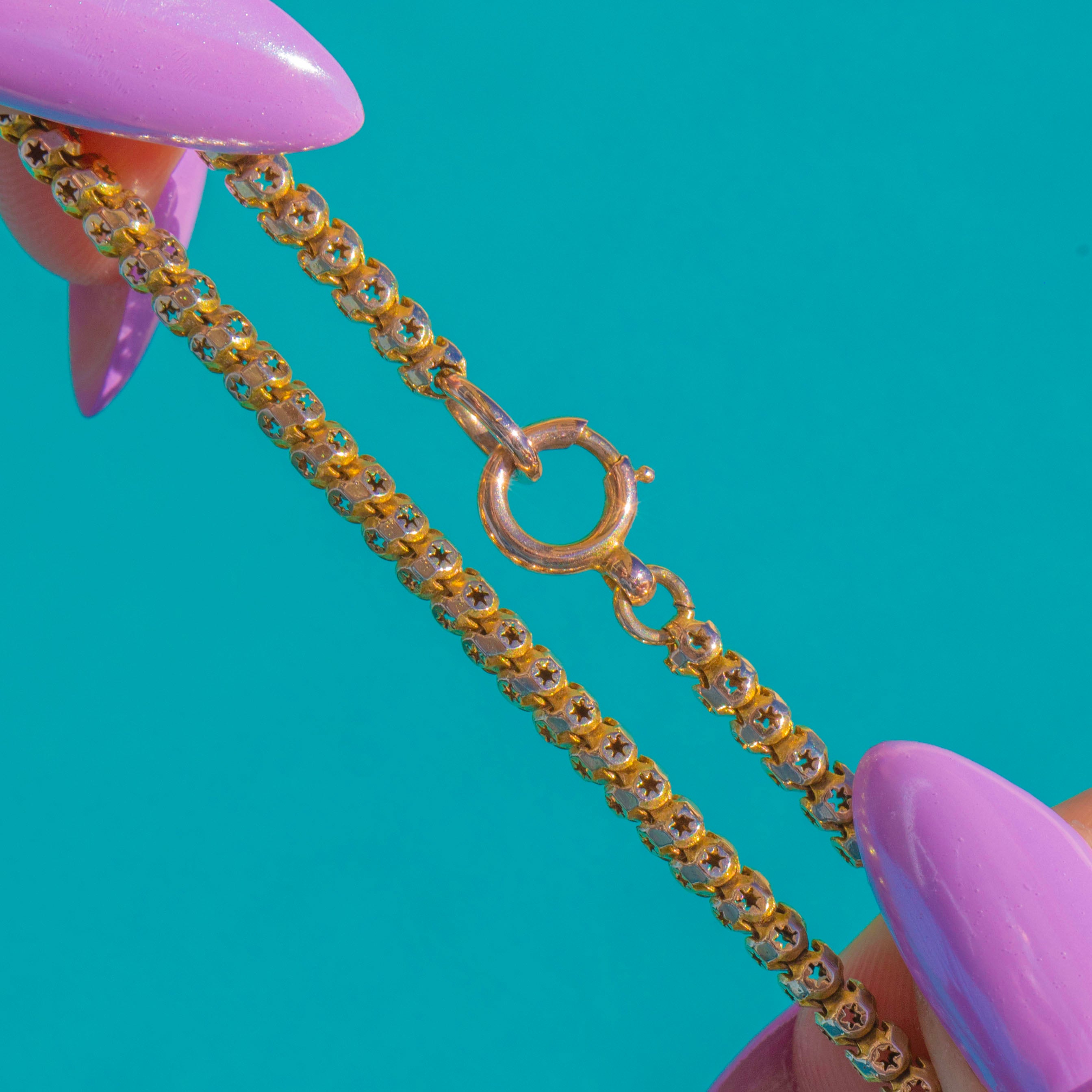A luminous Victorian treasure, this star‑pierced chain is crafted in buttery 9ct Gold with each link crisply cut to reveal a tiny celestial motif. The repeating star apertures play with the light beautifully, creating a refined shimmer that feels both romantic and timeless.