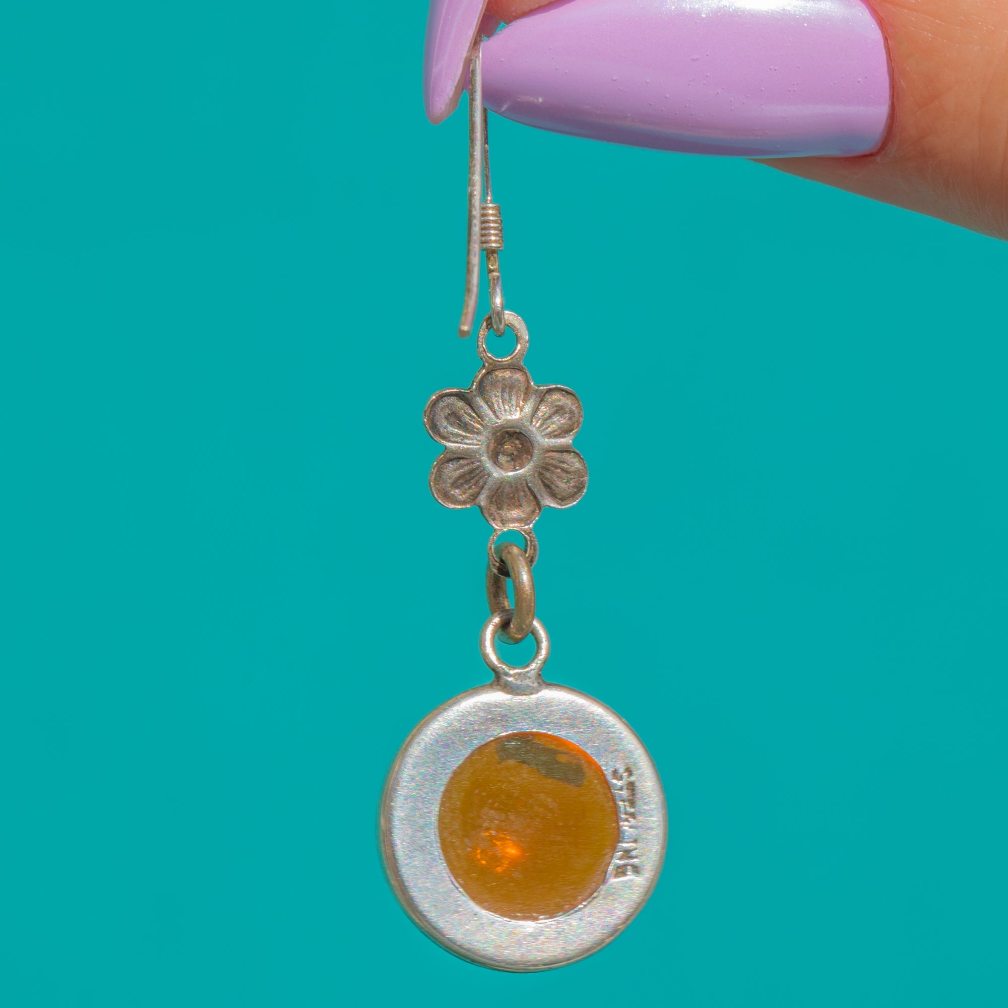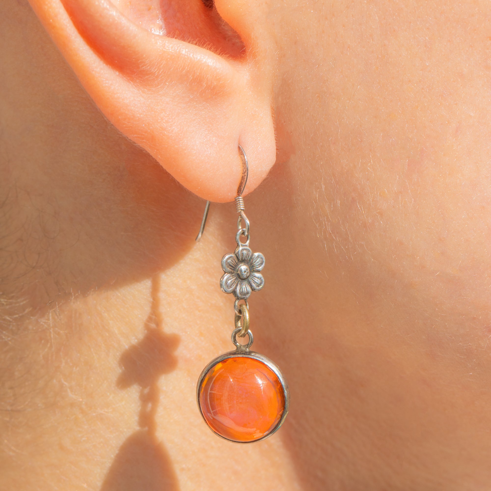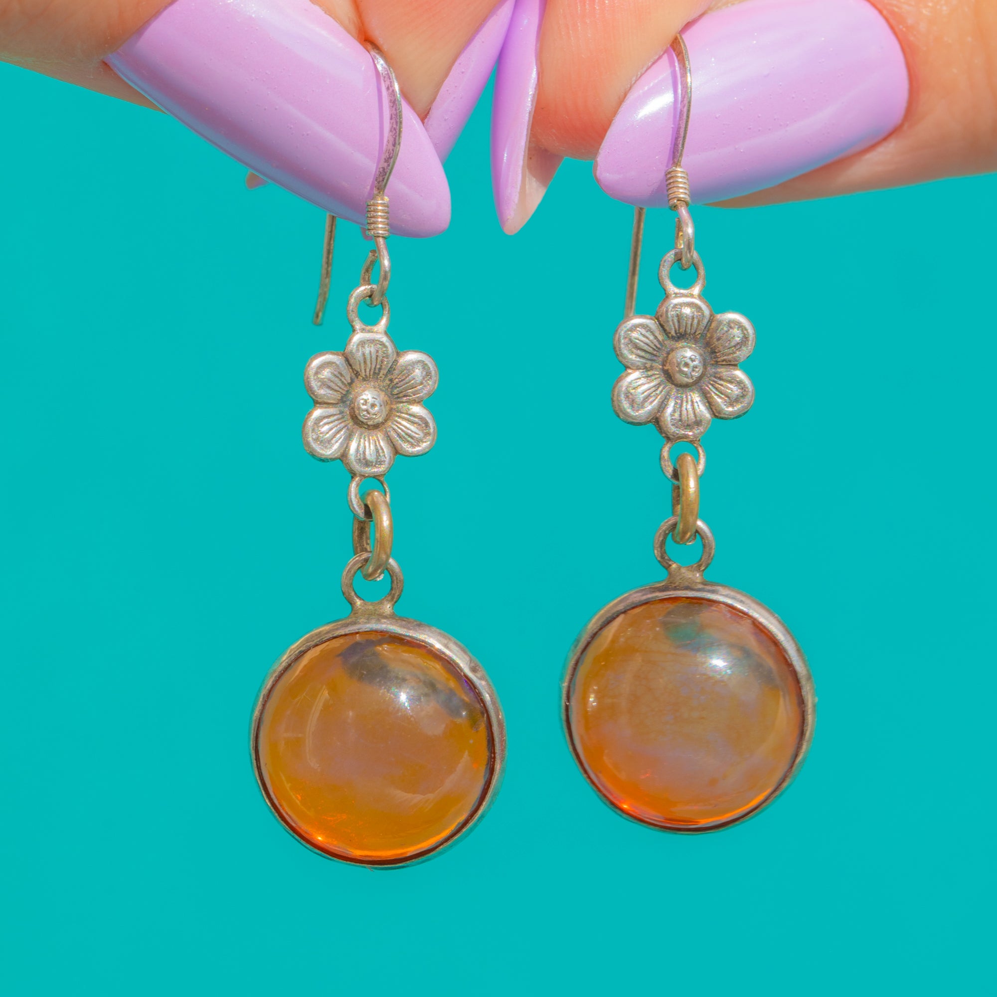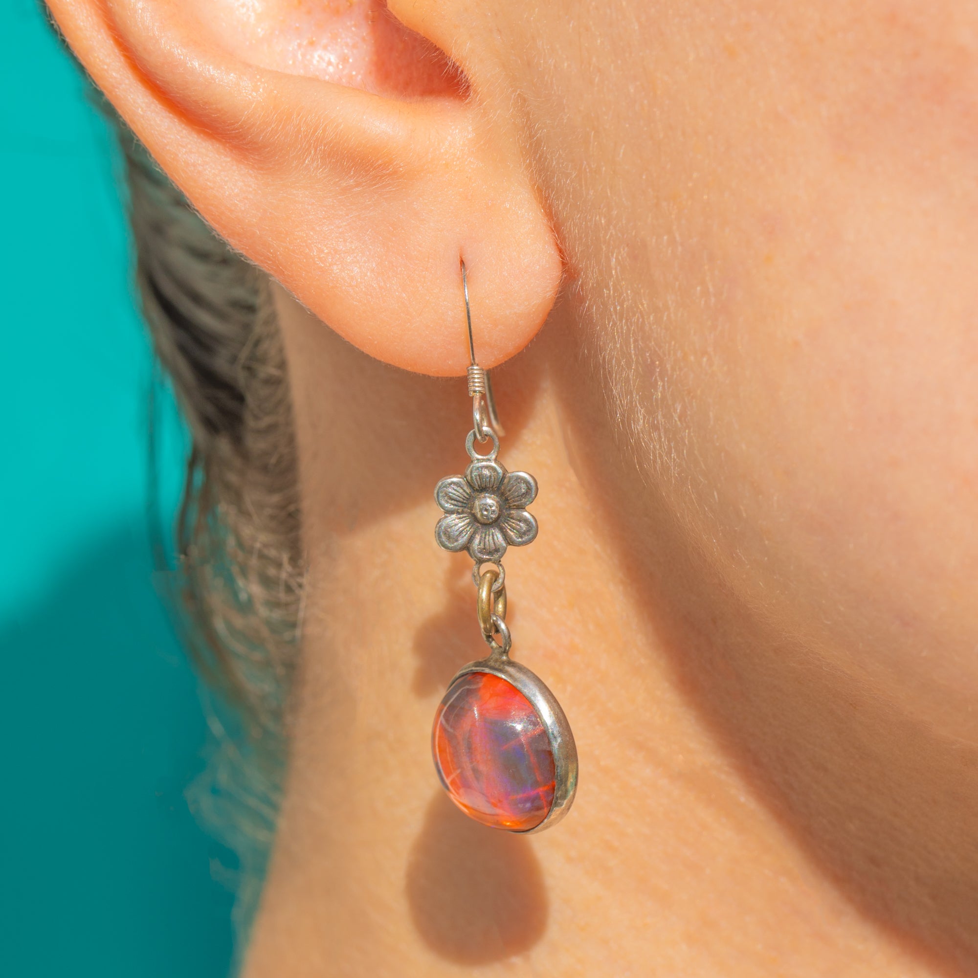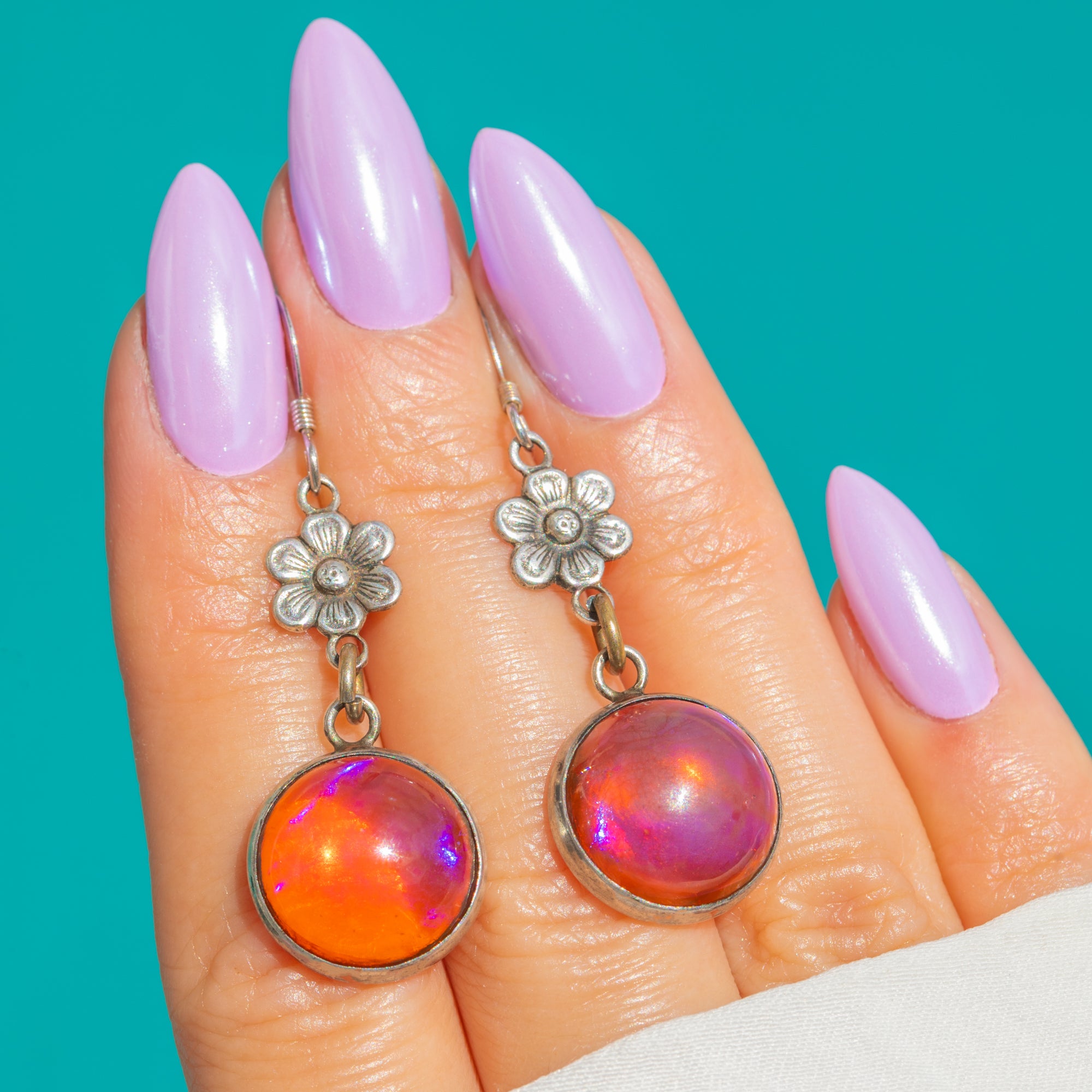 These Art Deco drop earrings captivate with fiery Dragon’s Breath Glass cabochons, their domed surfaces alive with warm orange hues and iridescent flashes of pink, purple and blue. The stones are framed in smooth Sterling Silver closed bezels, suspended beneath a petite six‑petal floral connector for graceful movement and a delicate, feminine silhouette.