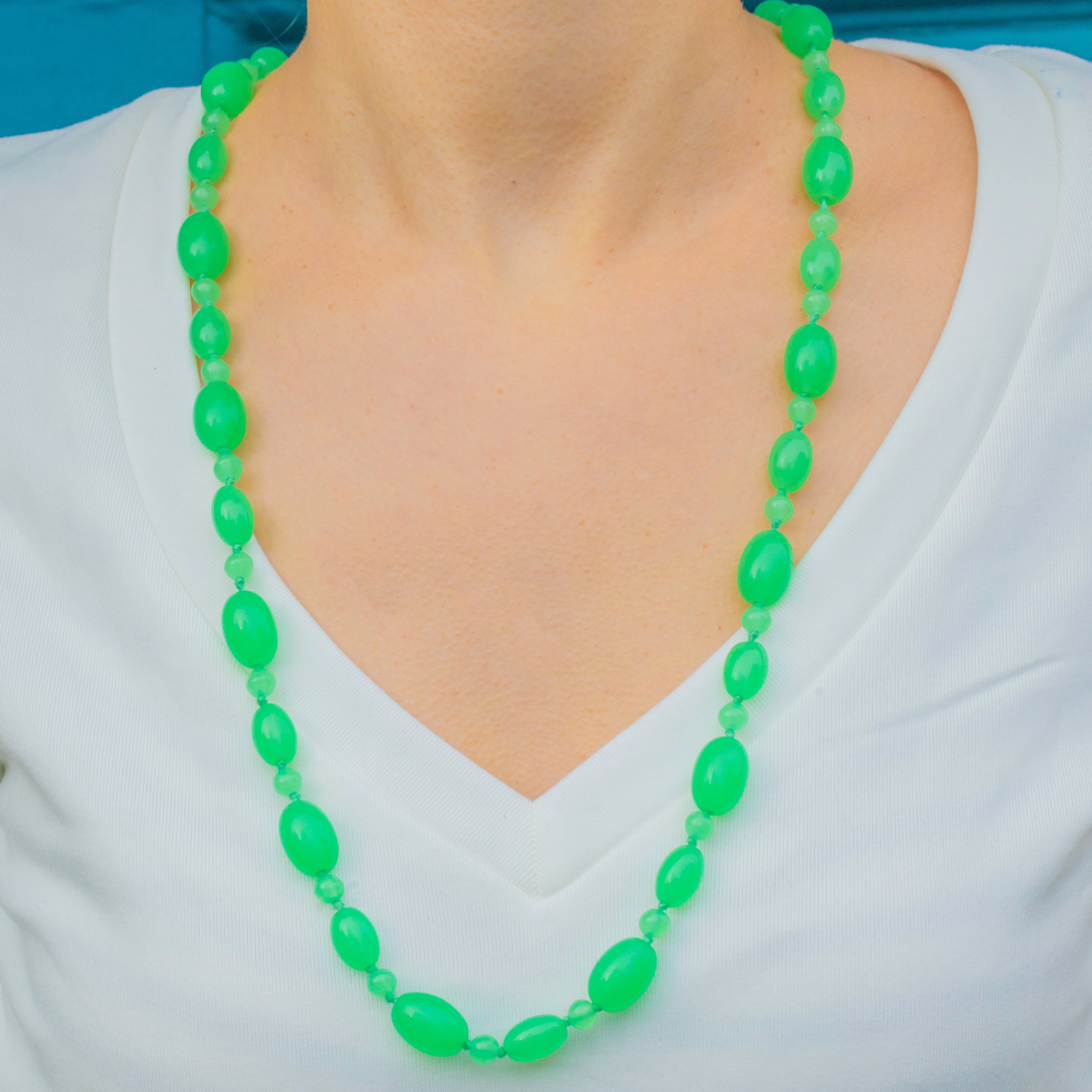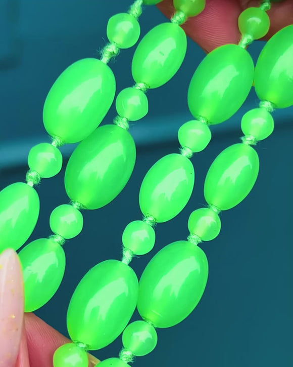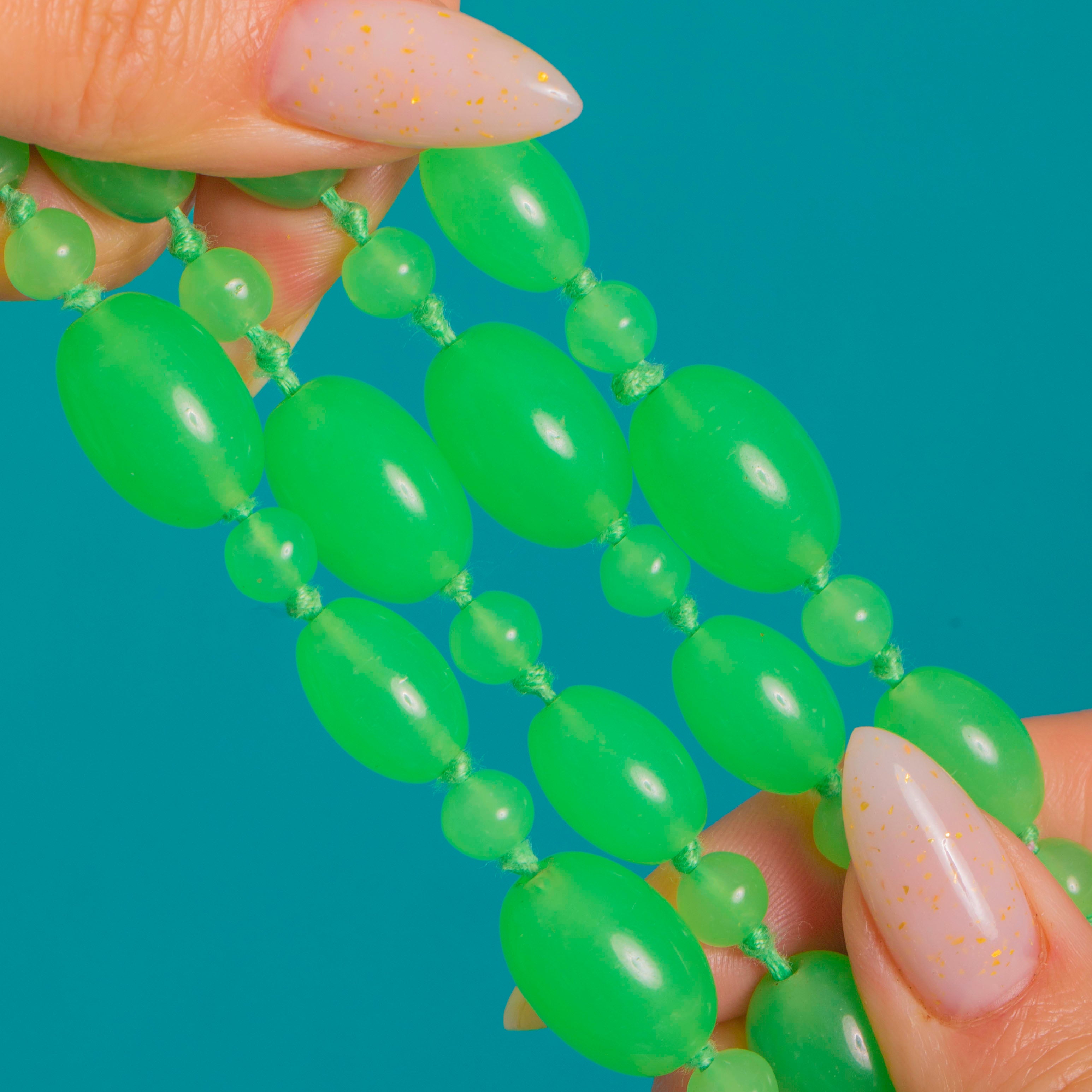 A luscious strand of bright jade-green Uranium Glass beads from the Art Deco era, hand-knotted on complementary green cord for beautiful drape and movement. The design alternates smooth oval beads with smaller round spacers, creating a rhythmic, elegant silhouette that sits effortlessly below the collarbone.