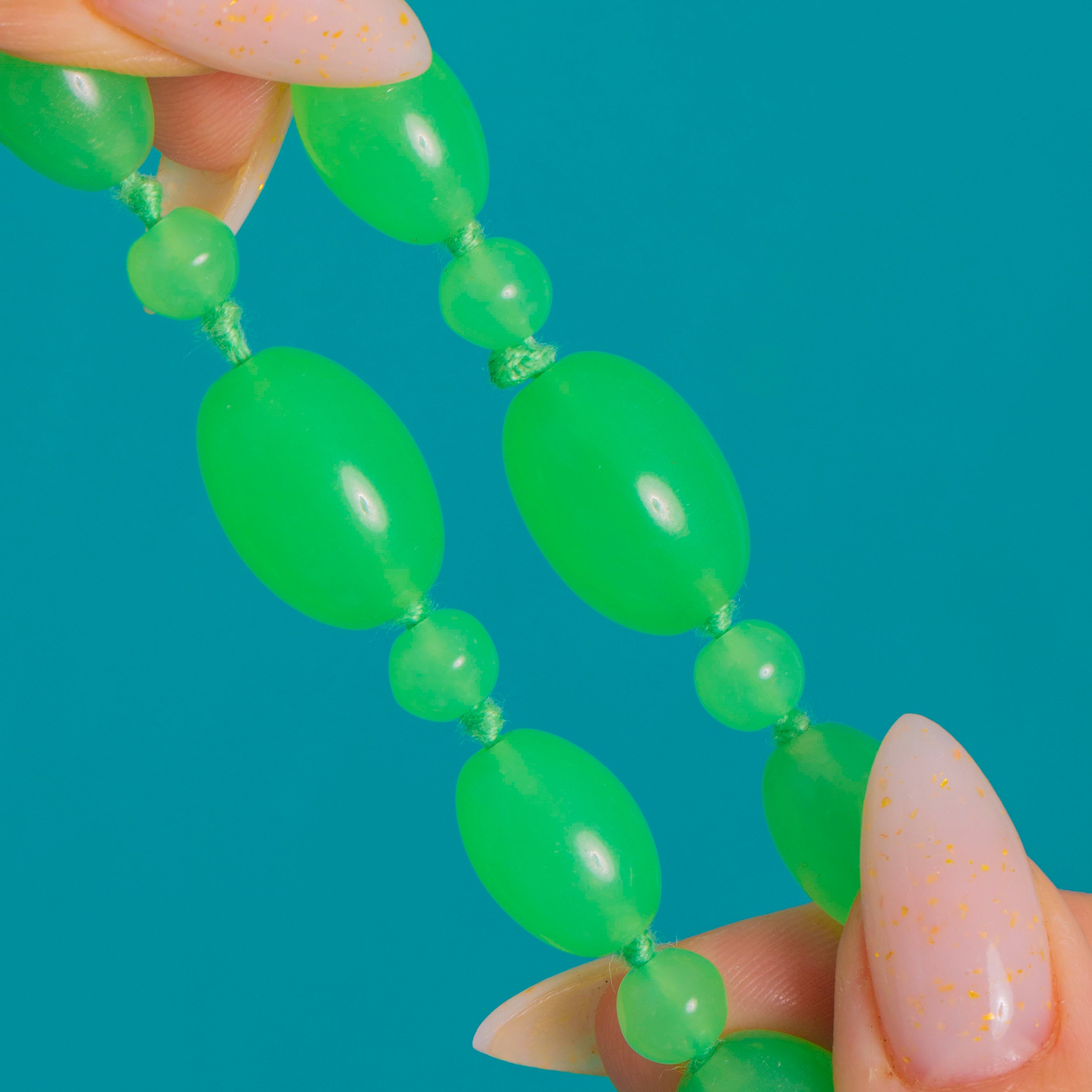Vibrant by day and spectacular under UV light, these classic “Vaseline Glass” beads pair with a secure 9ct Gold bolt ring clasp for a refined finish. A timeless, colour-led statement with that unmistakable Deco allure.