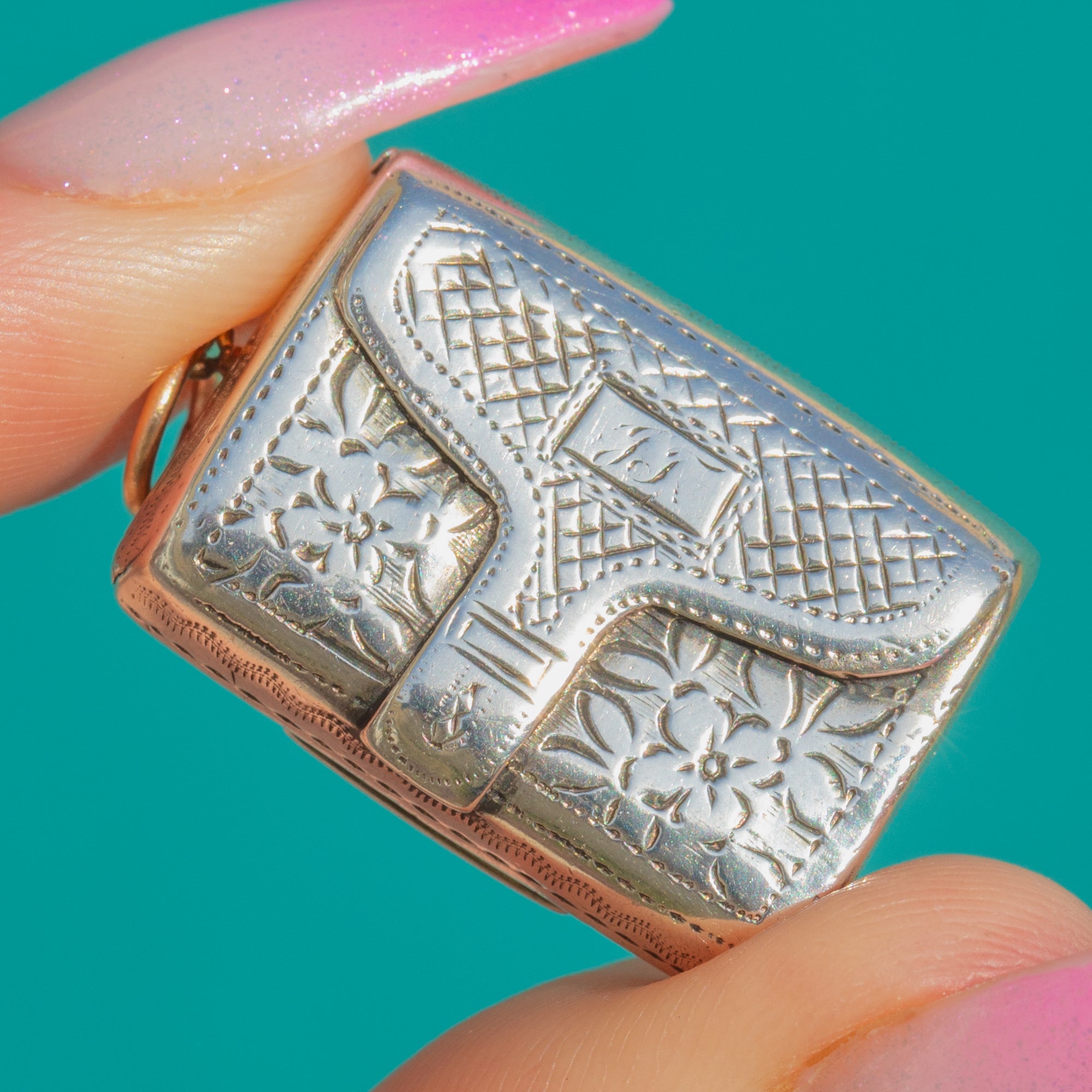 A charming Georgian William IV vinaigrette in the form of a buckled purse, beautifully worked in crisp Sterling Silver with refined engine-turned cross-hatching and chased foliate panels. The raised strap-and-buckle motif and neat beaded edging add texture and depth, giving this miniature treasure a wonderfully tactile, romantic presence.