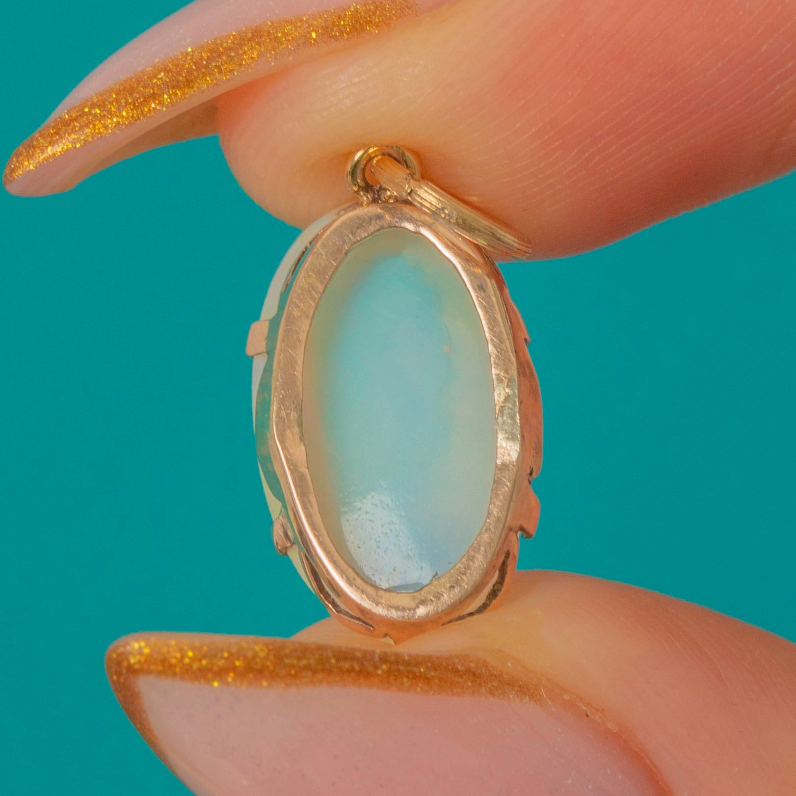 This stunning Art Deco Opal charm radiates with luminous, multicoloured fire. The natural solid 2.30ct Opal shimmers with vibrant flashes of green, pink, orange and blue, creating a mesmerising display of colour and light.