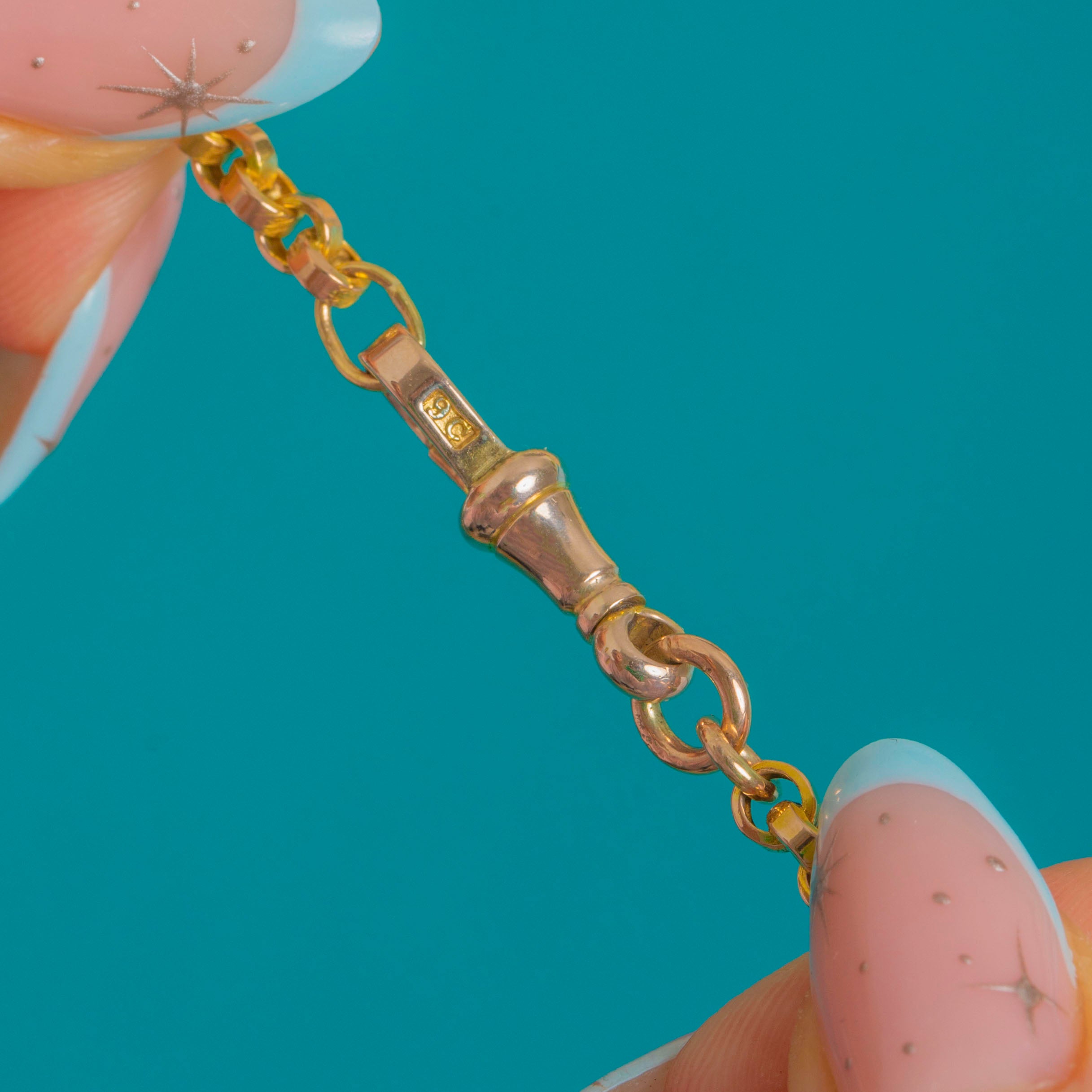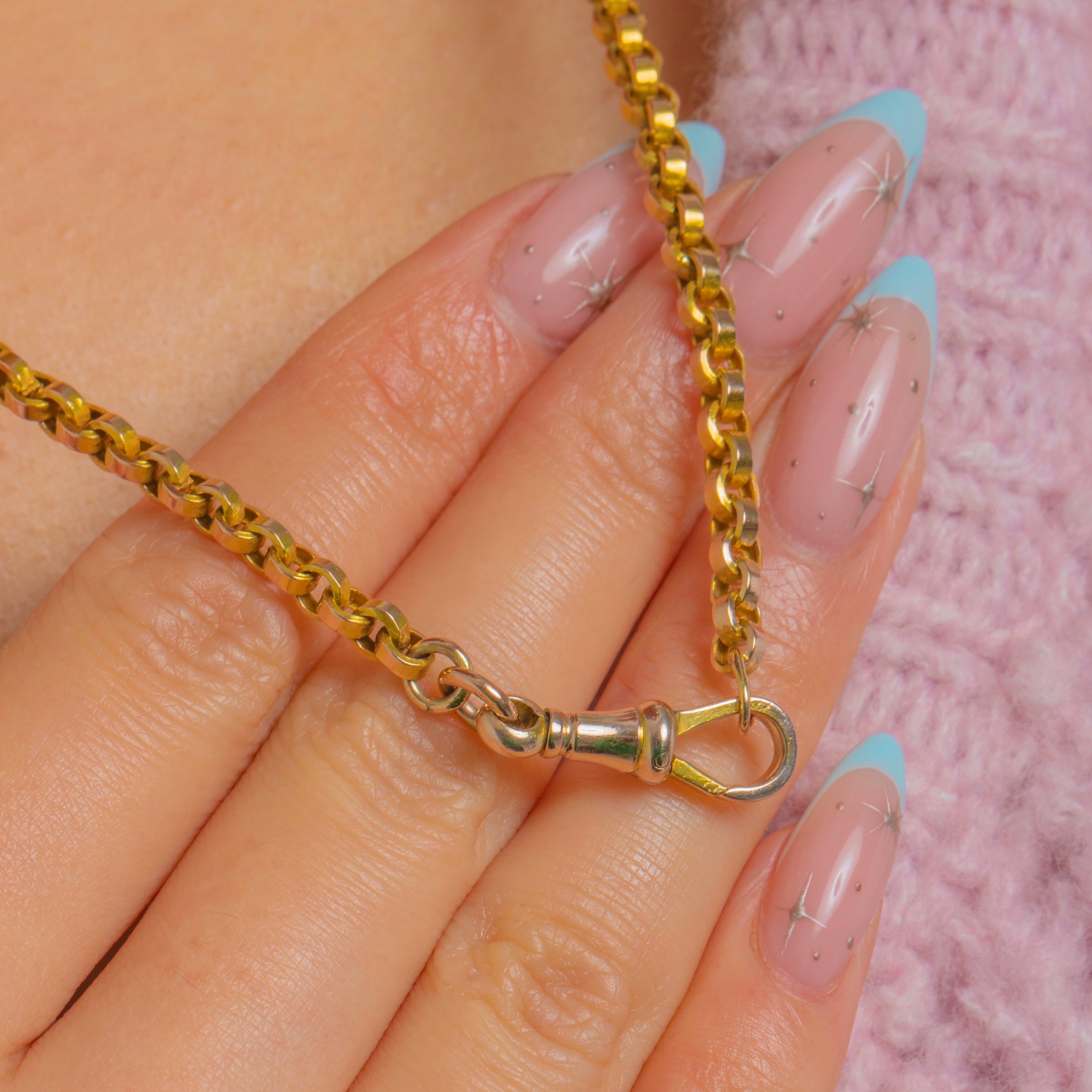 A timeless Victorian belcher chain in glowing 9ct Gold, finished with a traditional dog clip clasp. The uniform round links have that clean, utilitarian elegance beloved of antique watch chains, with a bright polish that catches the light beautifully.