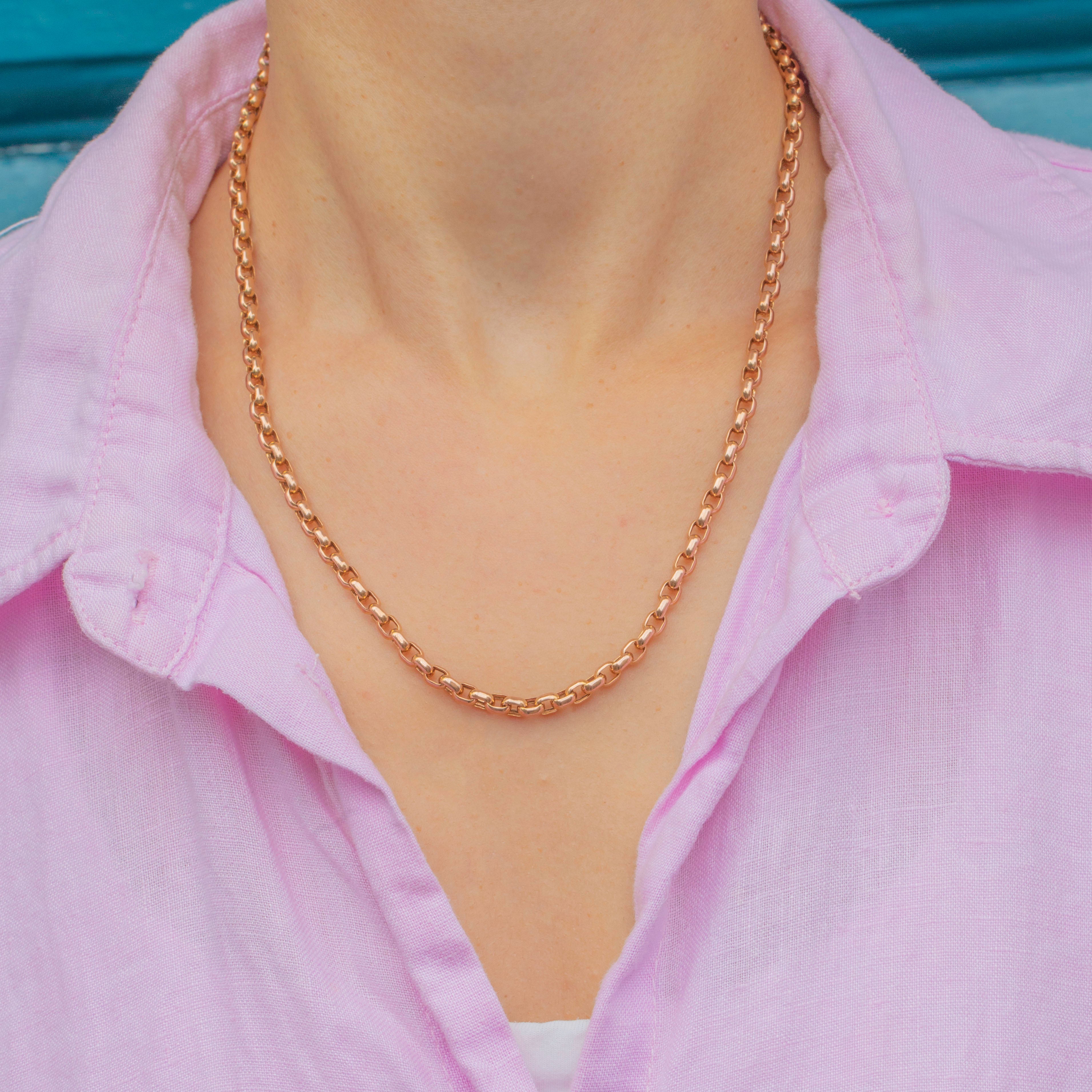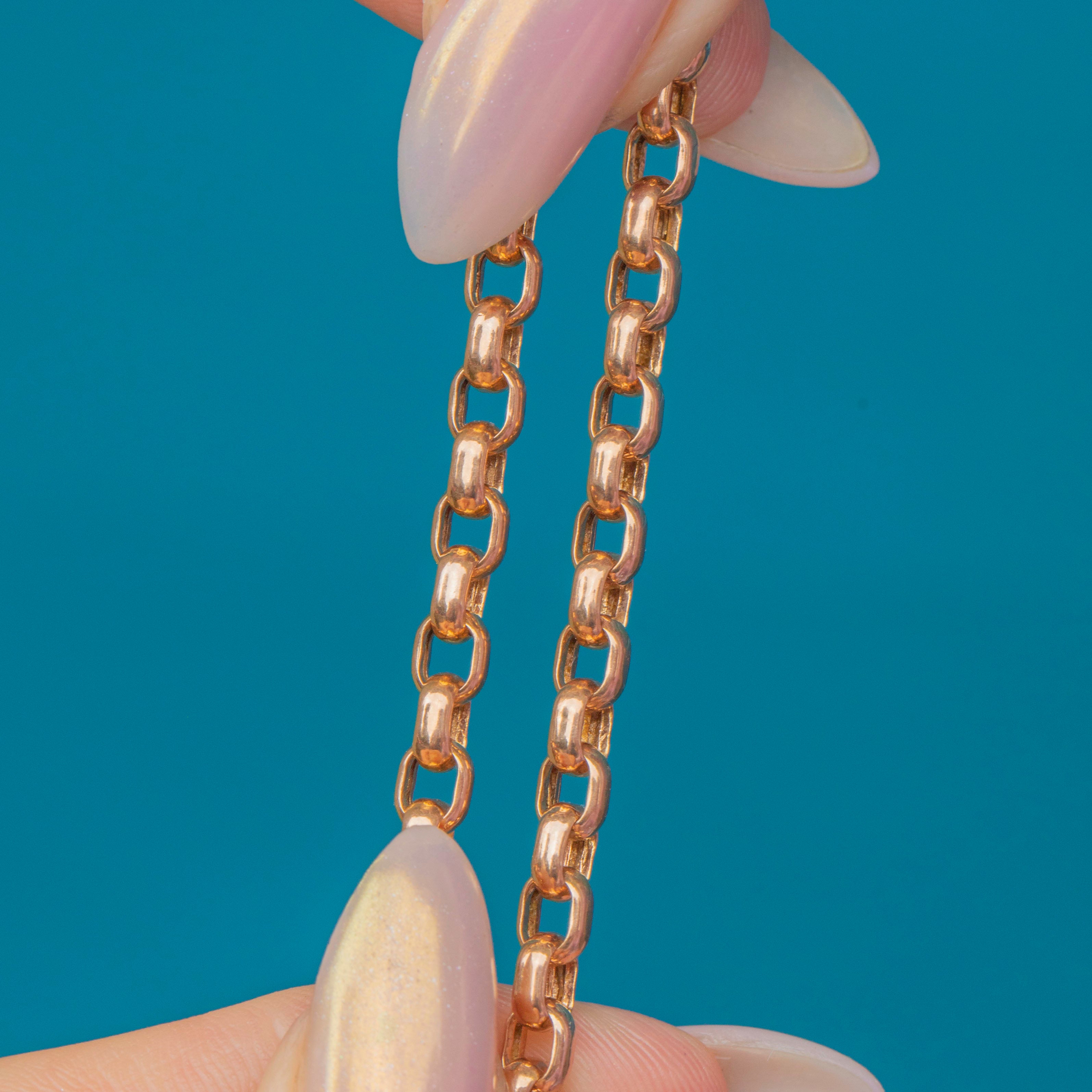 This antique 9ct Gold belcher chain is a classic Victorian staple, designed with rounded 4mm links and finished with a sturdy dog-clip clasp. Substantial at 11g, its rich rosy Gold tone and timeless style make it perfect for wearing alone, layered with other chains, or paired with a pendant.