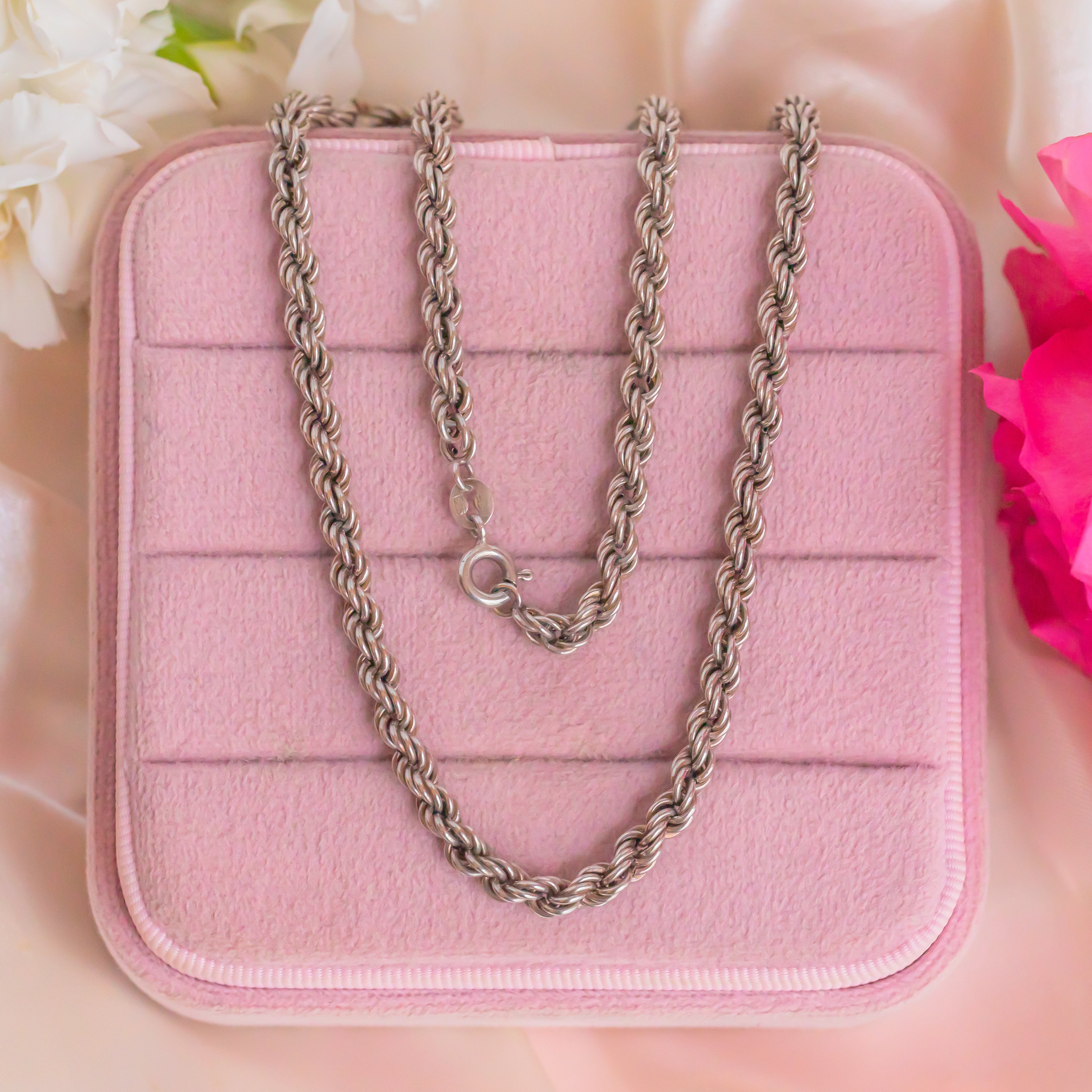 At 20 inches, she sits just below the collarbones, and being 4mm wide, the chunkier size of this vintage Silver chain makes her the perfect stand-alone piece. Your Vintage jewellery box is yearning for this Silver rope chain!