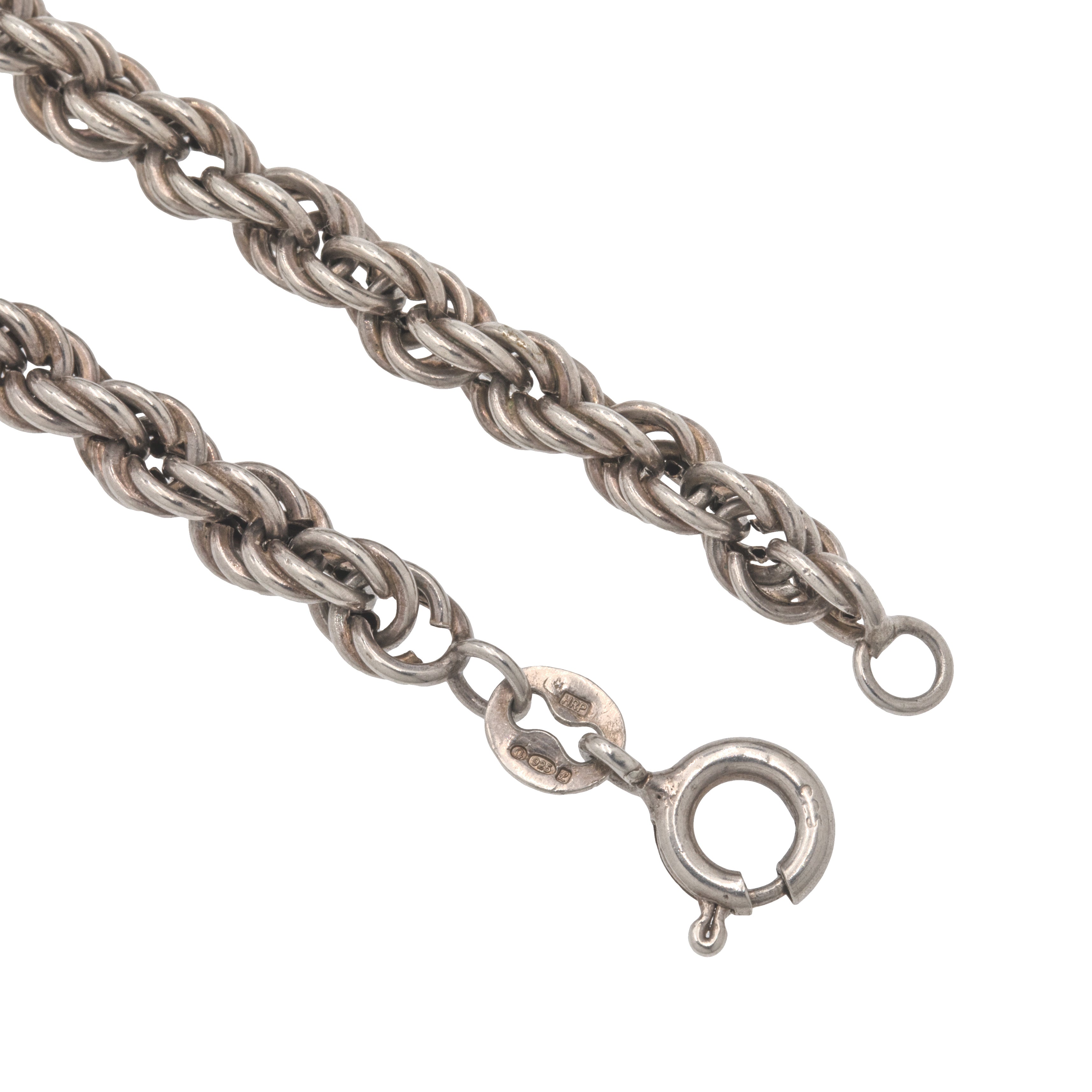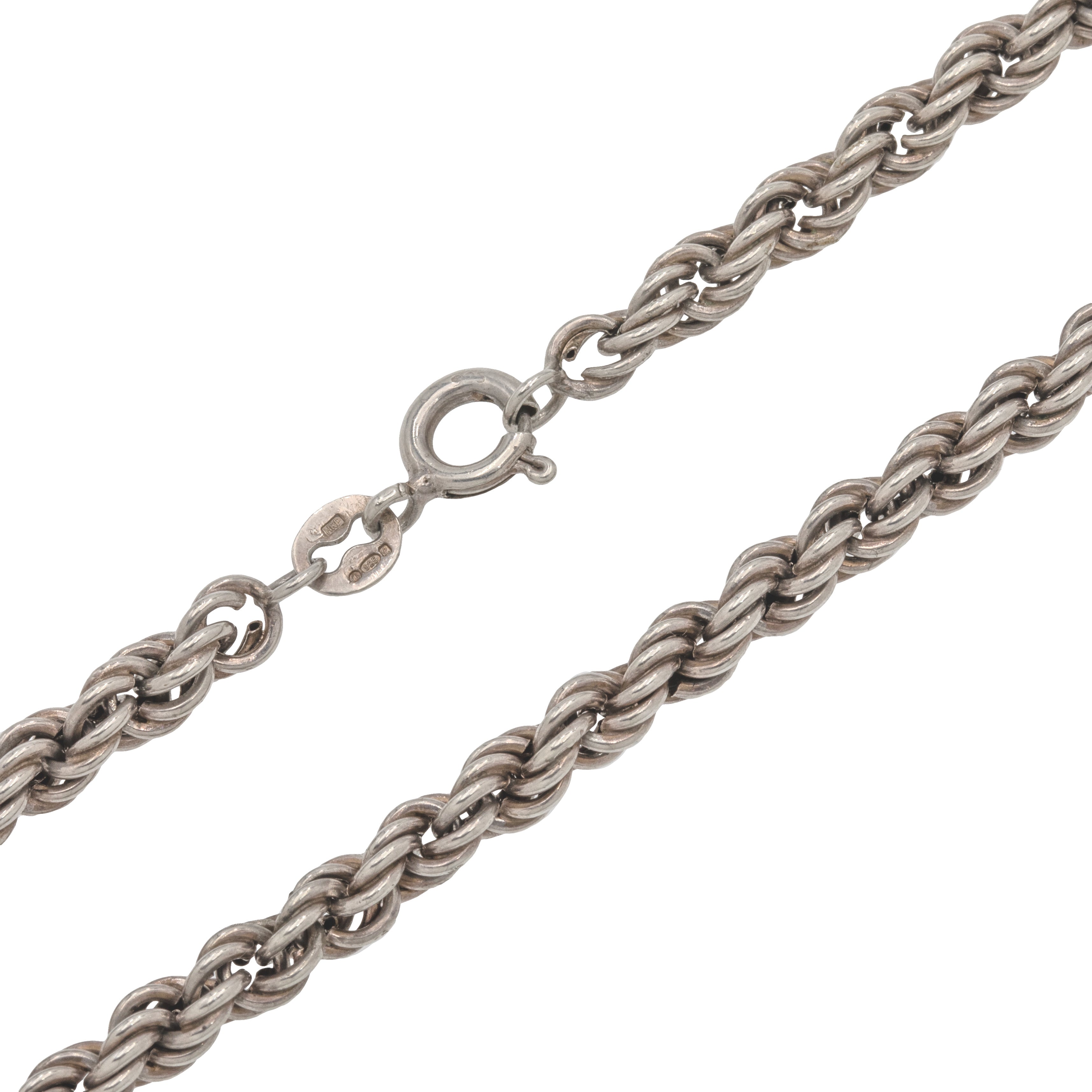EXCELLENT. This Sterling Silver twisted rope chain is in excellent condition! The links are perfectly interlinked, with a lovely patina within the grooves. With a full set of hallmarks, we can accurately date this Silver chain to 1985. Complete with a fully functioning bolt-ring, you can wear this lovely lady with confidence!