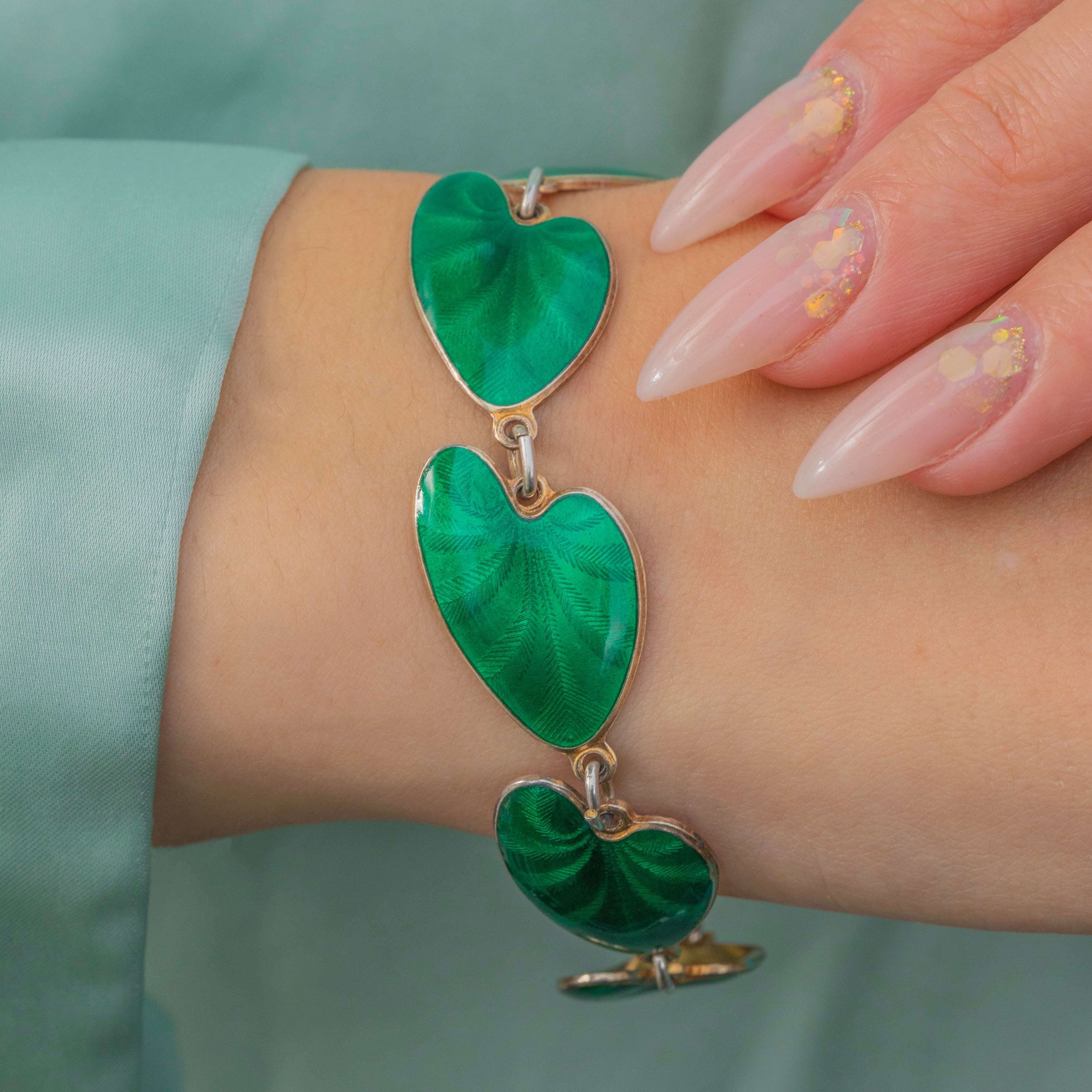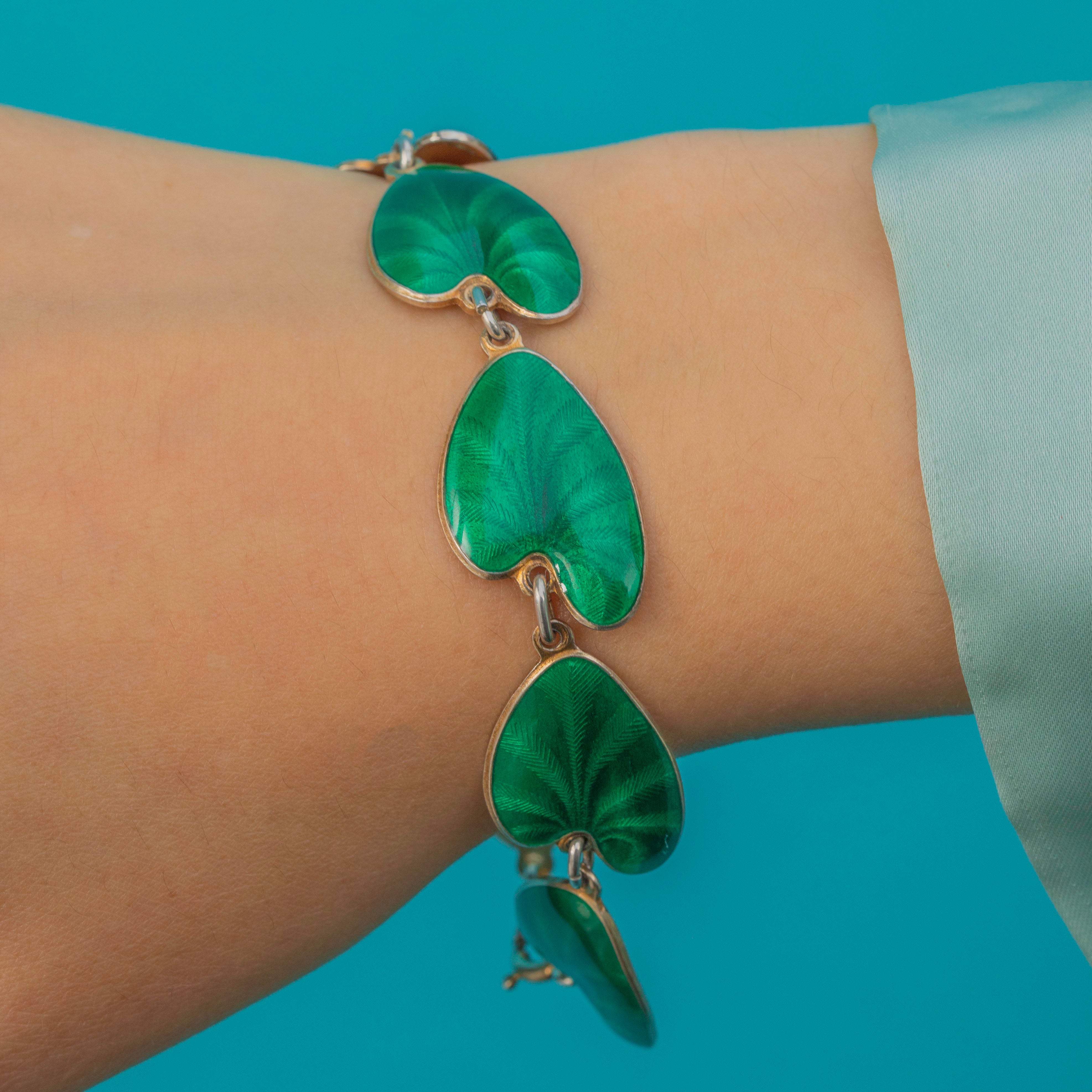 An iconic Mid-20th Century David Andersen enamel leaf bracelet in gilded Silver. The bracelet is formed of a series of softly curved leaves, richly enamelled with vibrant lilypad-green and fine vein detailing that mimic the natural textures of nature & catch the light beautifully.