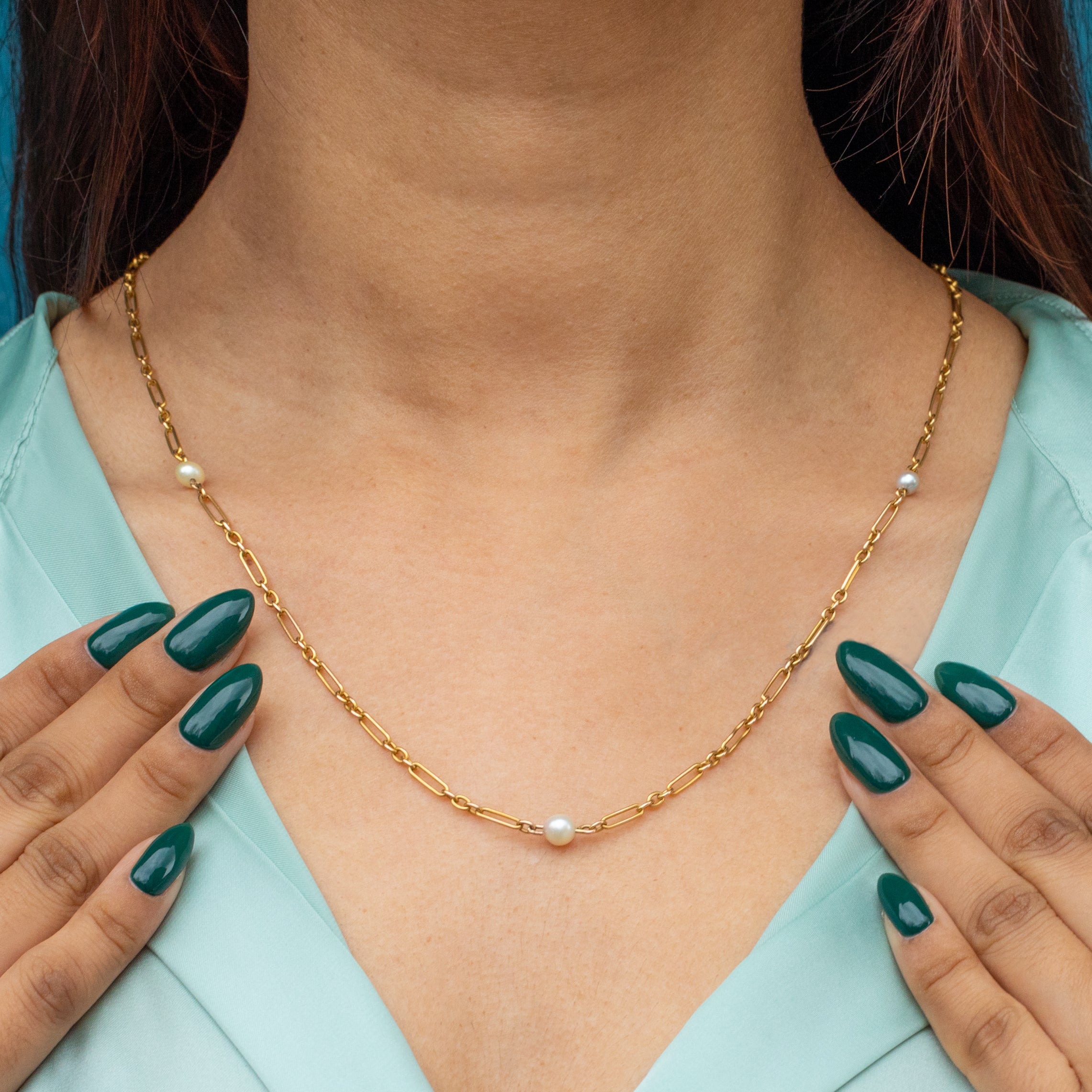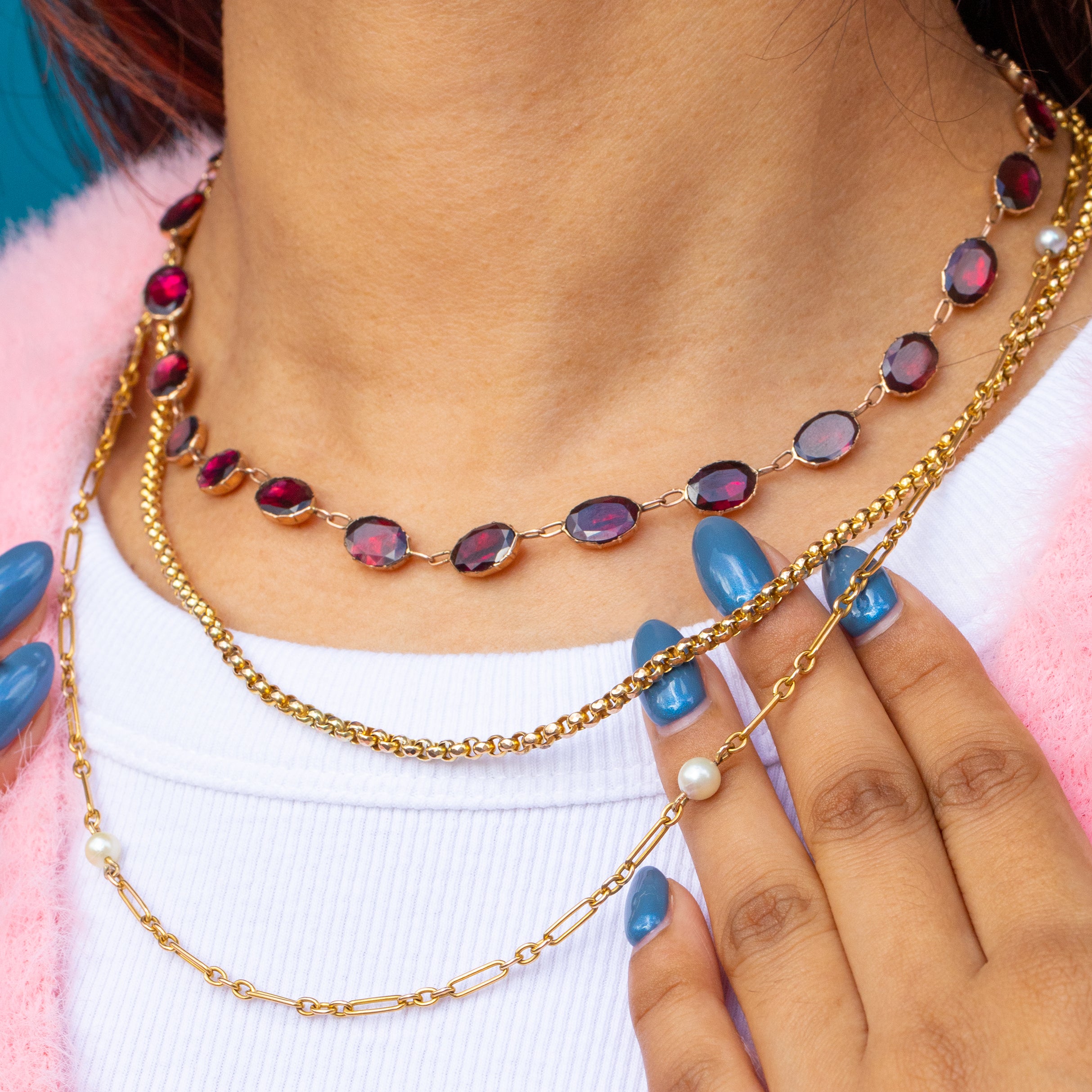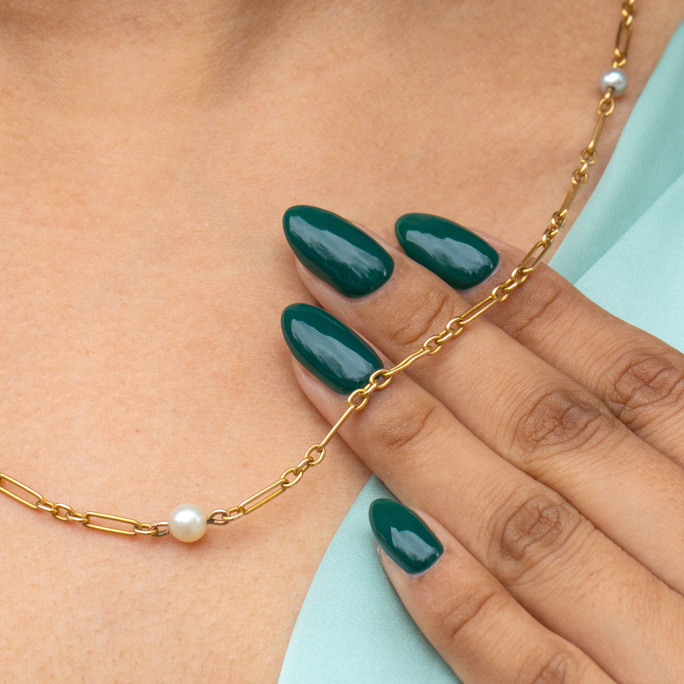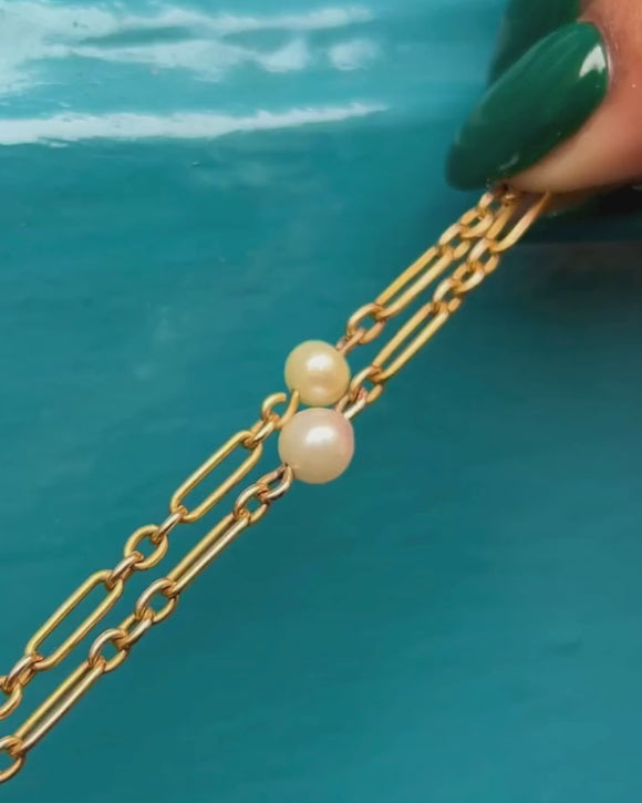 This antique Gold chain takes on a delicate form typical of the early 19th century, complete with pretty paperclip links and four plump Pearls that have a sumptuous satin sheen!