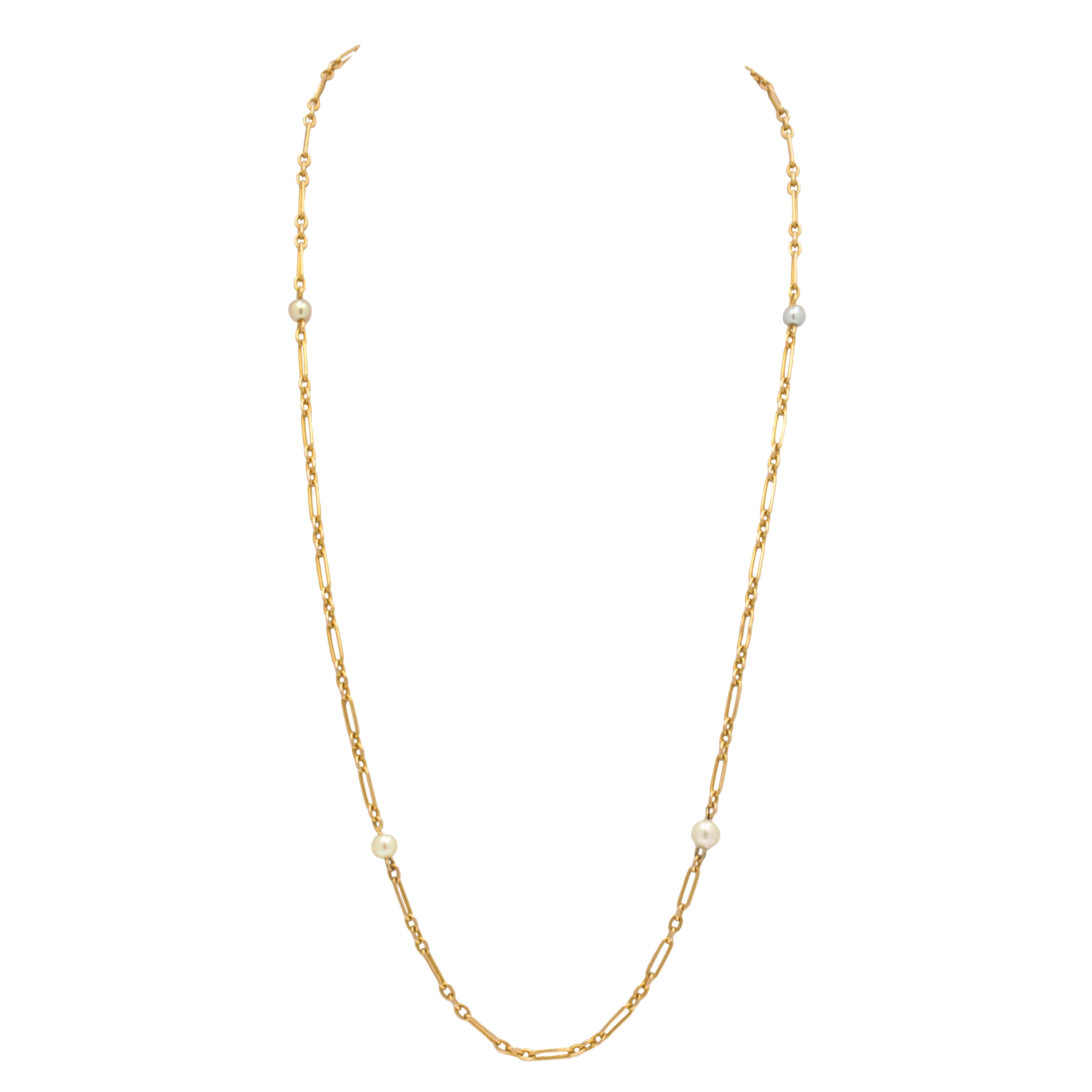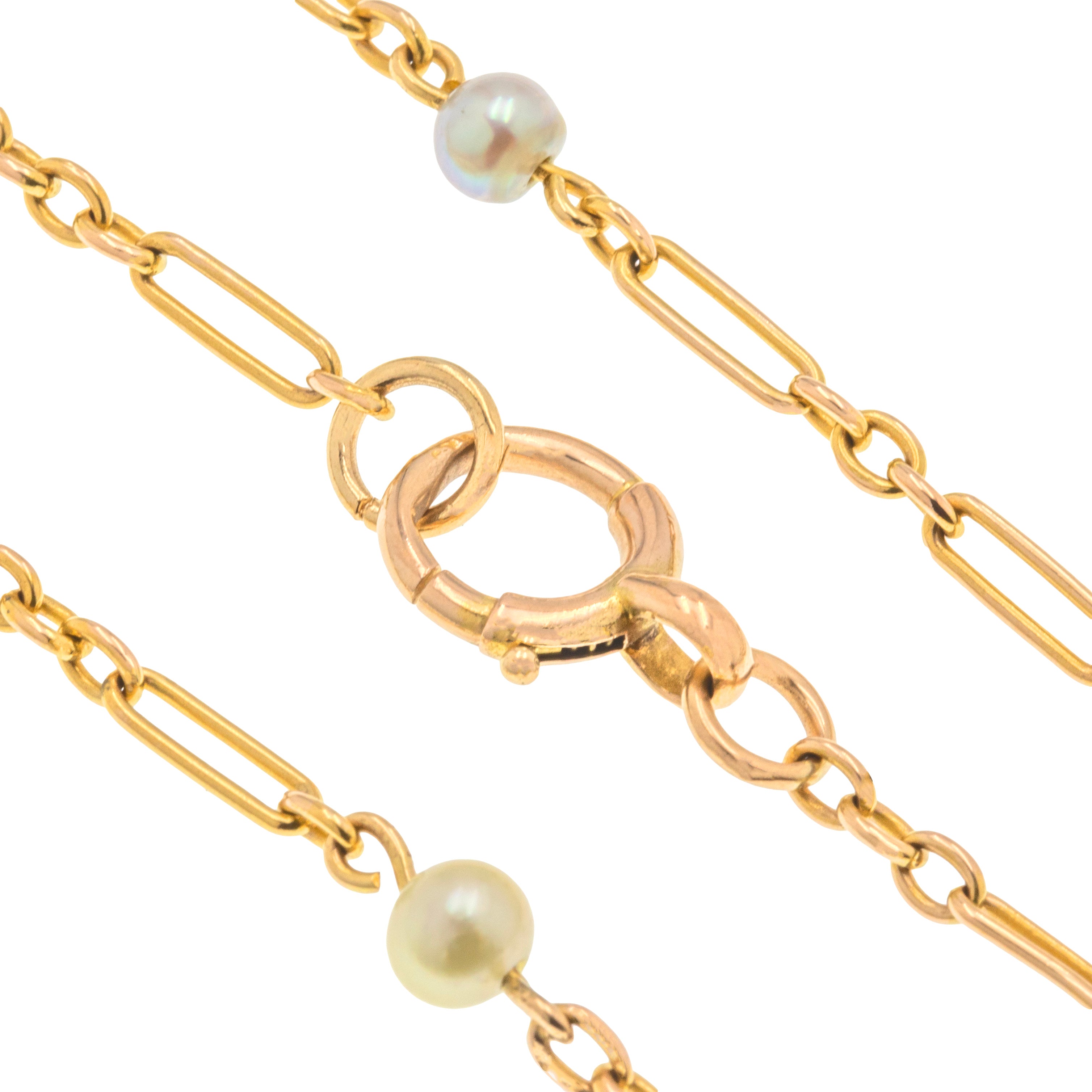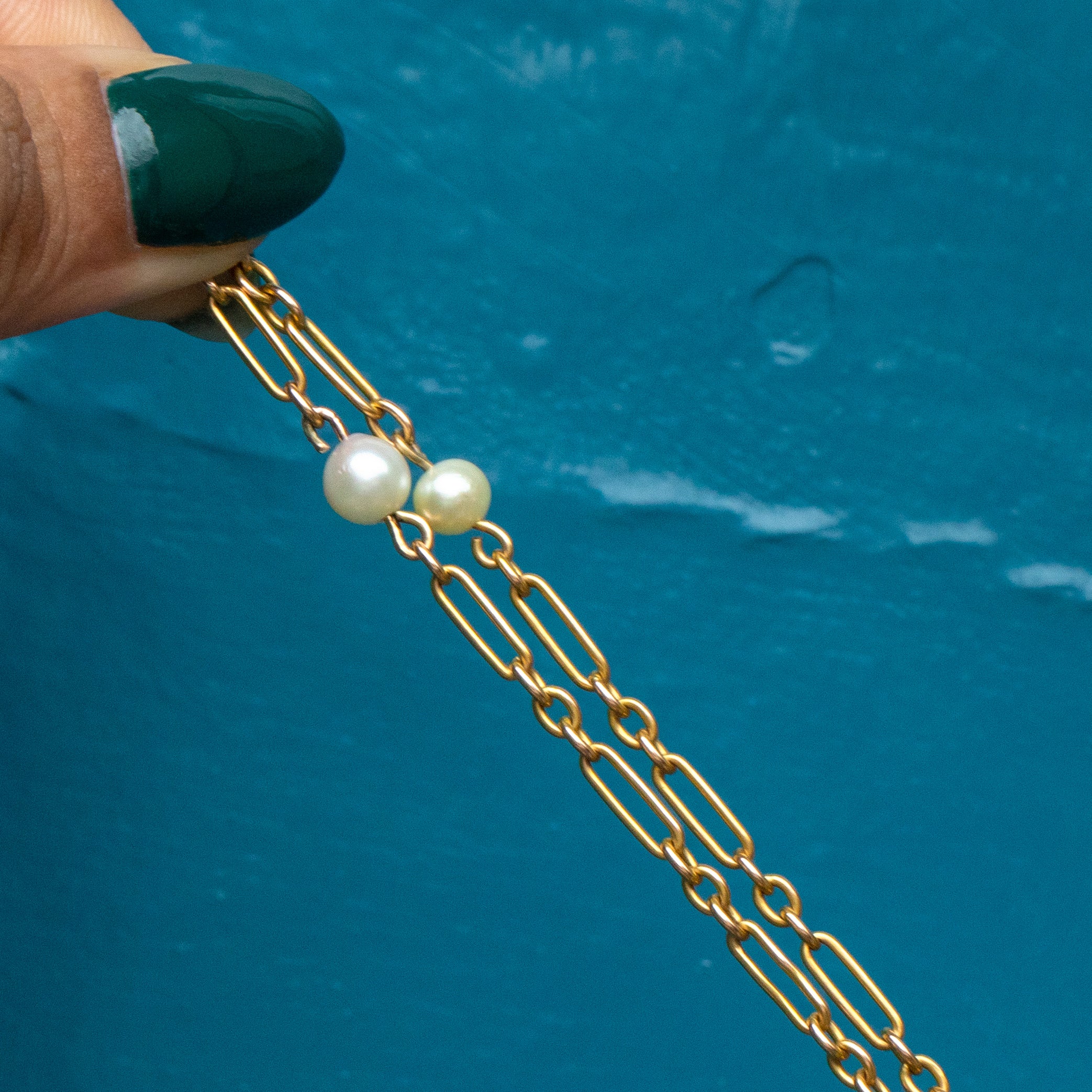 EXCELLENT. This antique 15ct Gold chain with Pearls is a real treat! In excellent condition, this chain can be worn straight from the box! The Pearls vary slightly in size and colour, a homage to their natural origin. The links are secure and the bolt-ring allows this necklace to be secured with confidence.
