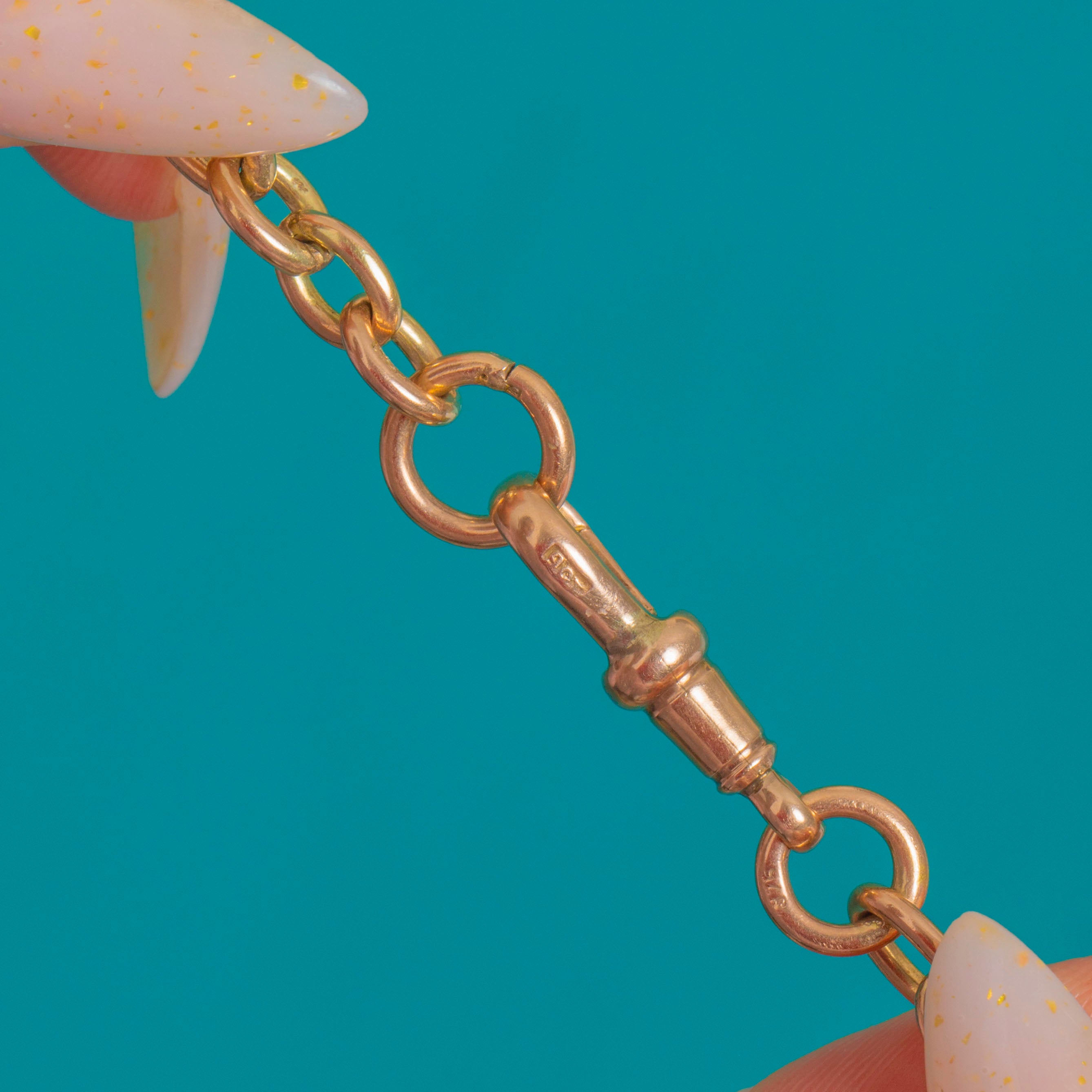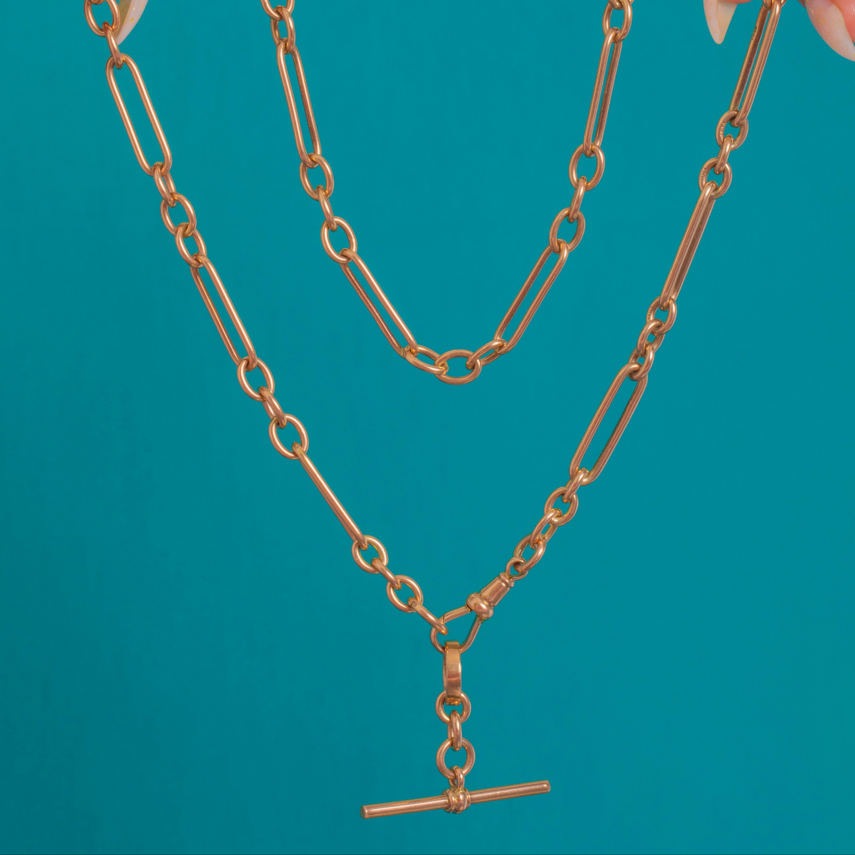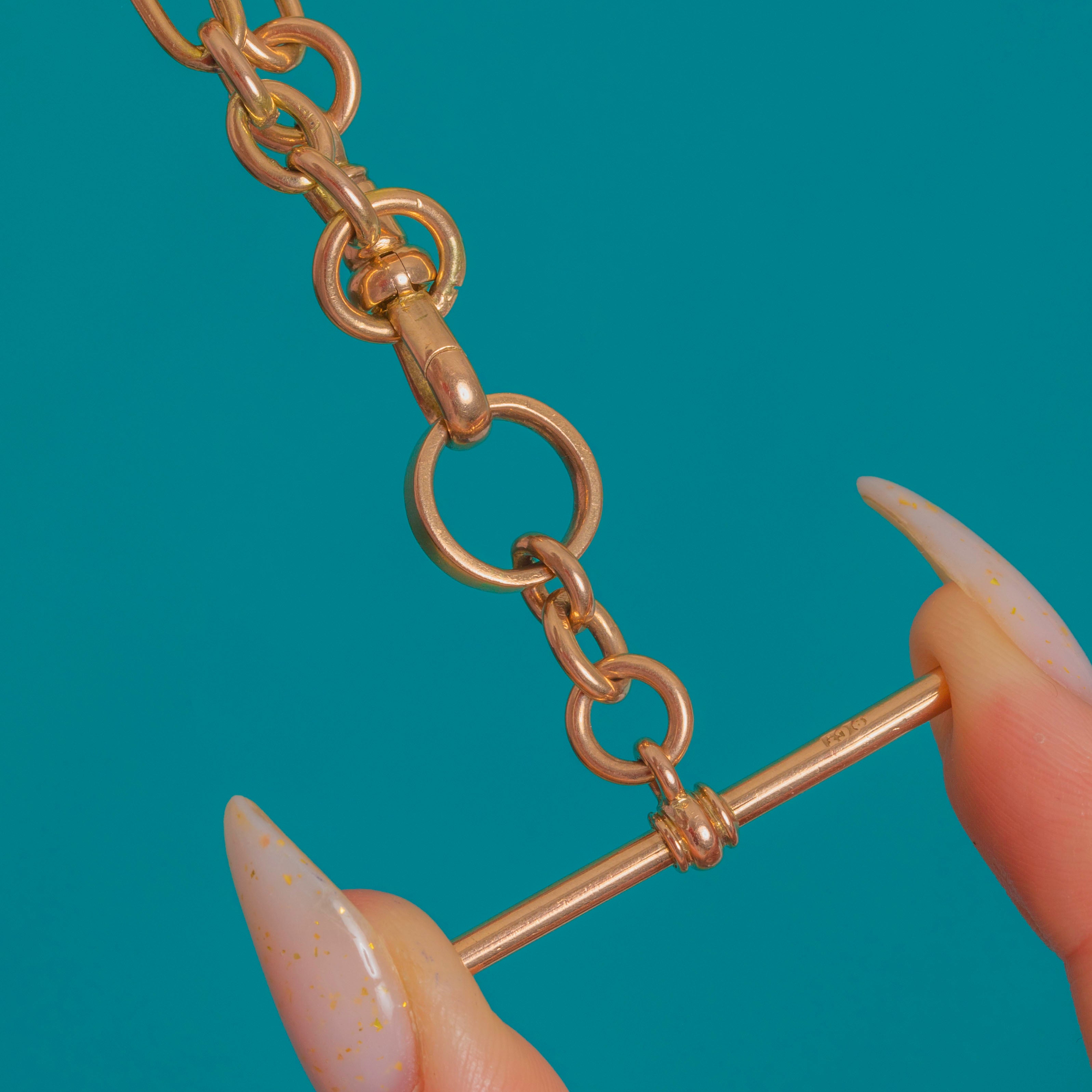 EXCELLENT: Links are crisp and well‑preserved with only light, superficial surface wear commensurate with age. The dog clip and T‑bar are secure and operate smoothly; joins are sound with subtle solder seams typical of antique manufacture. Overall beautifully cared for with no gemstones to note and no visible later repairs.