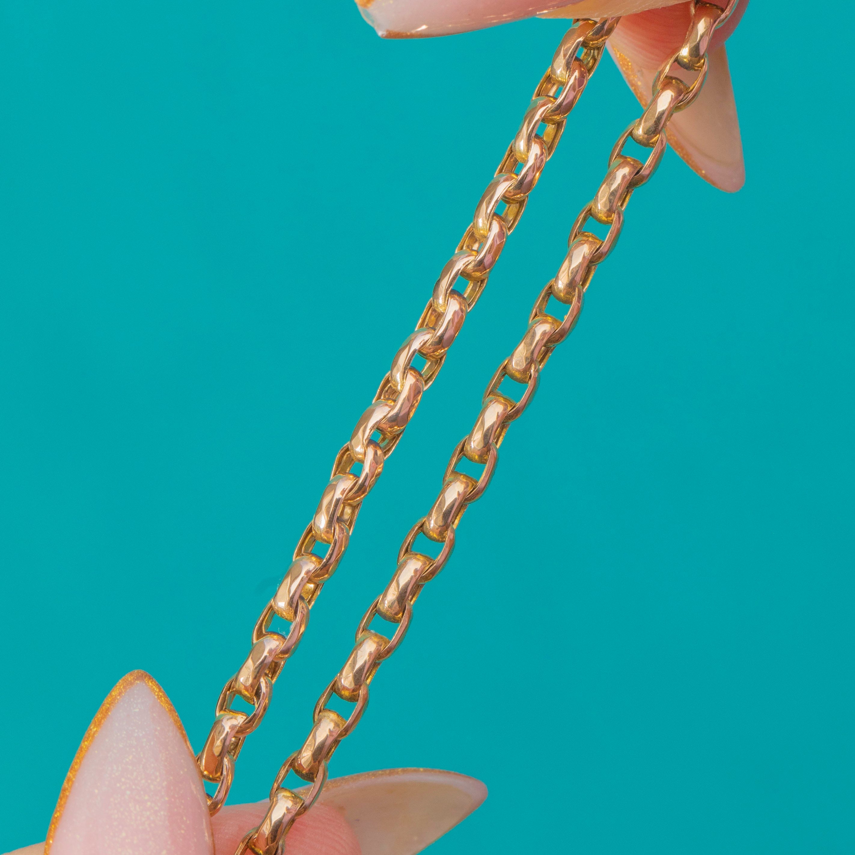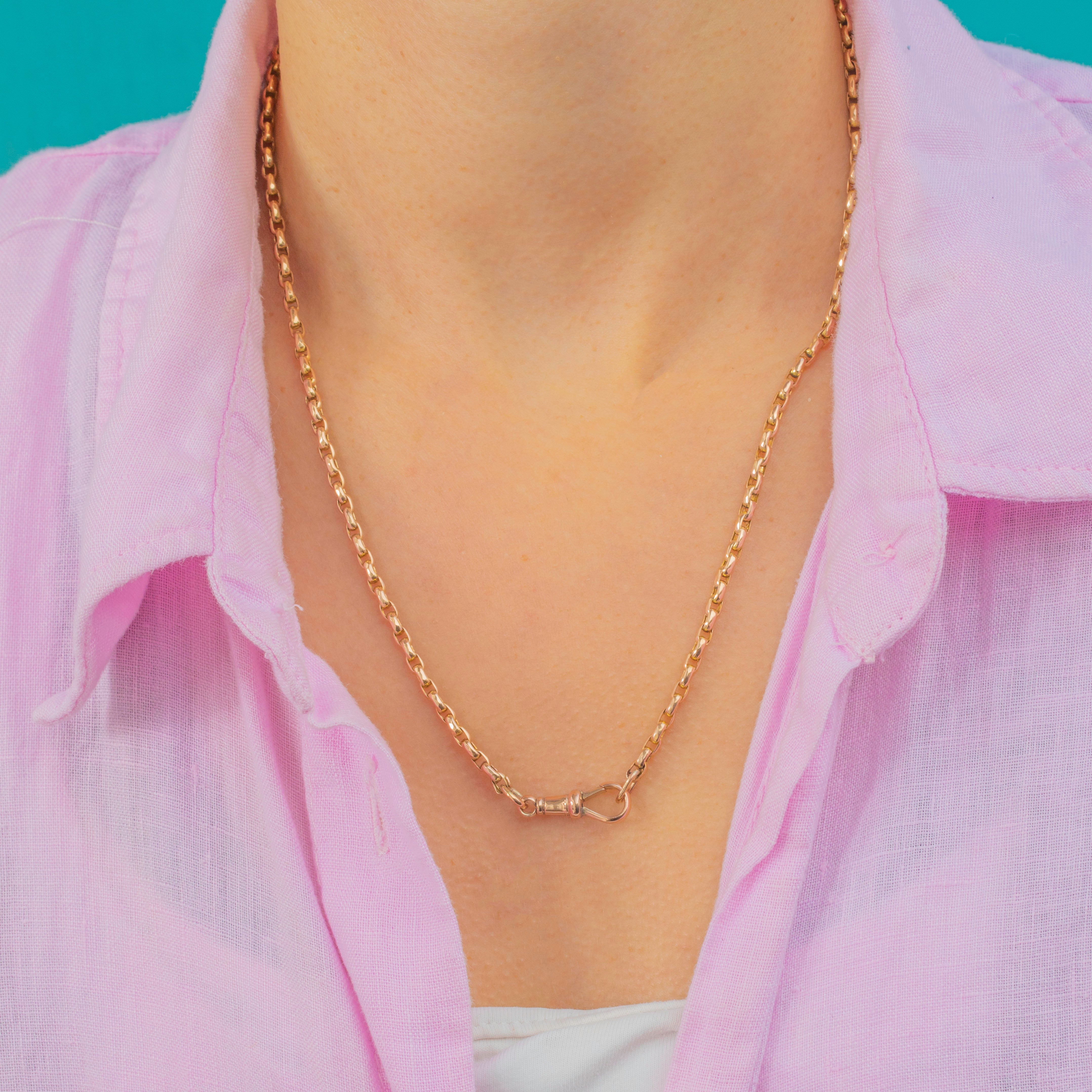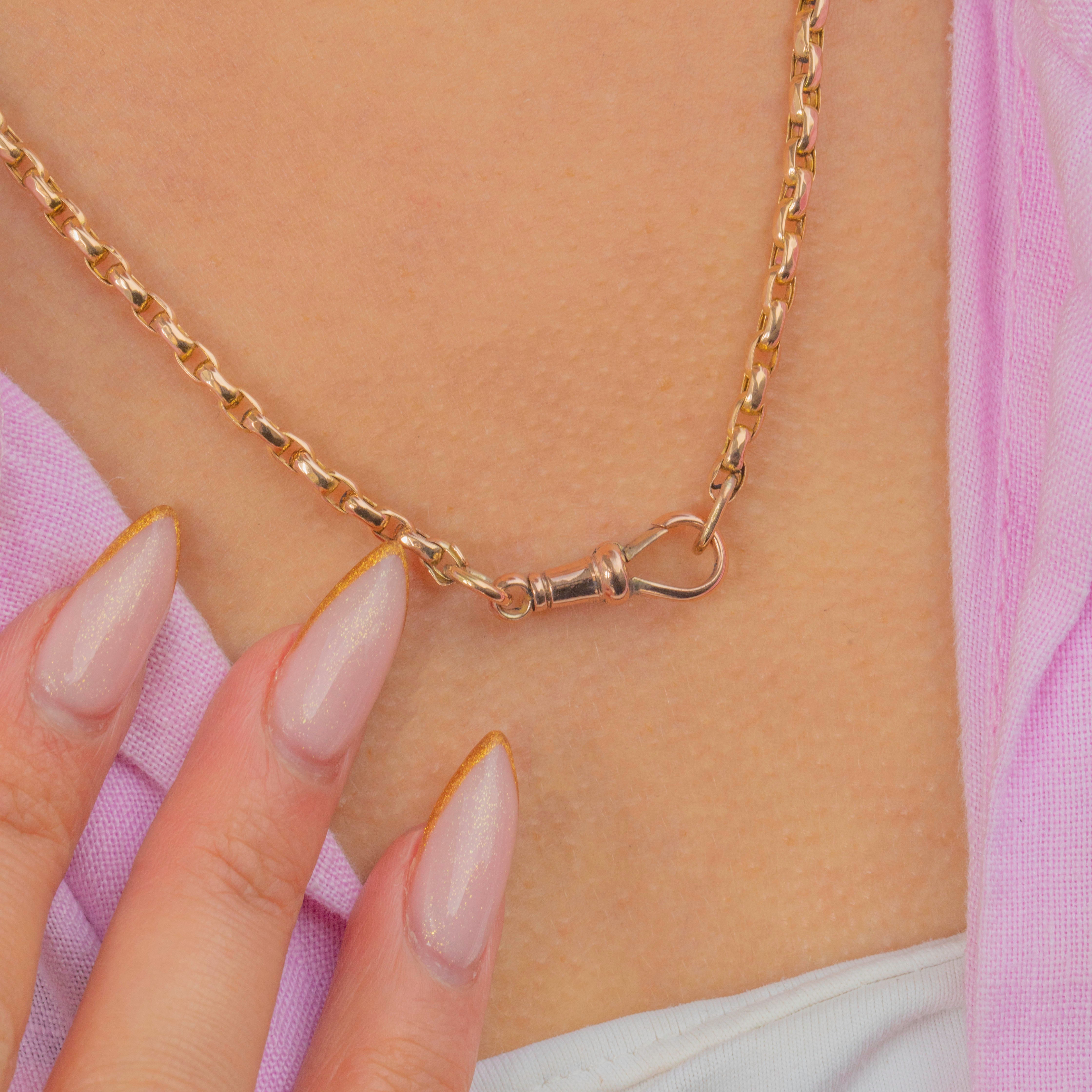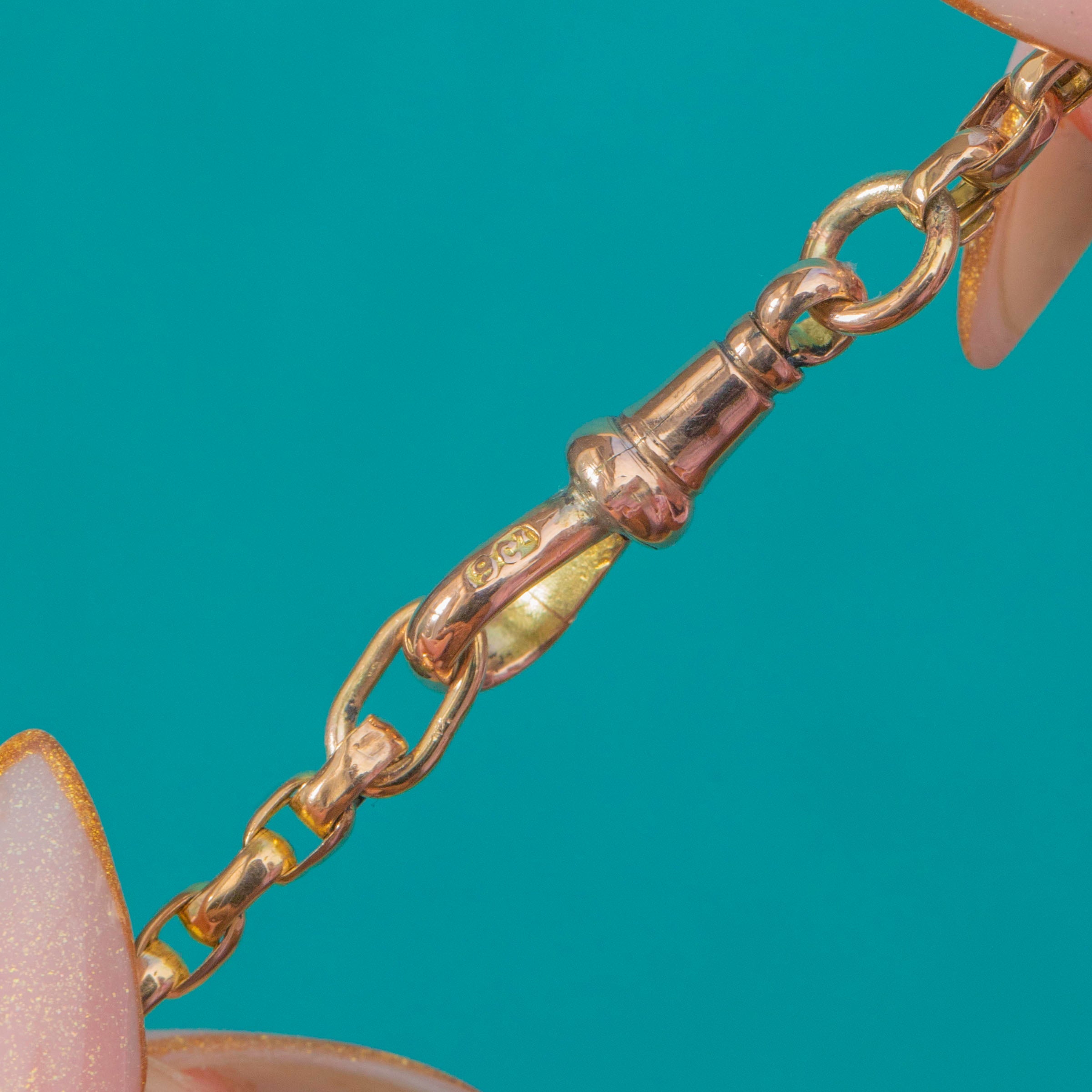 This antique Victorian belcher chain is a timeless staple, crafted in warm 9ct Gold with classic rounded links. Its elongated dog-clip clasp adds the perfect touch of period charm, making it ideal for wearing alone or styling with your favourite pendants and charms.